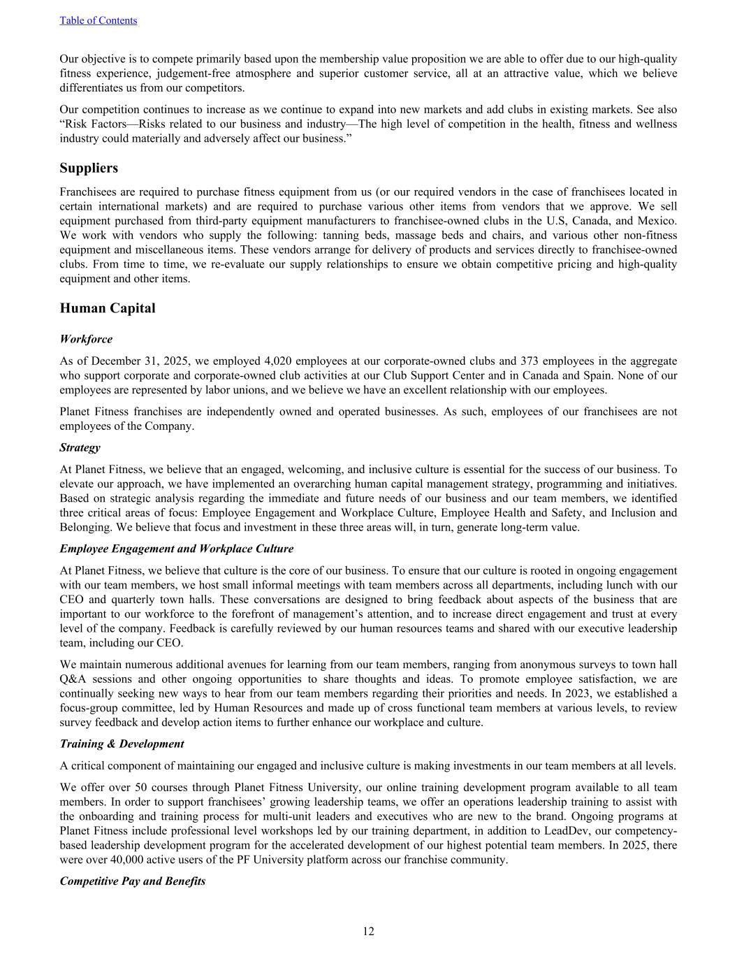 Our objective is to compete primarily based upon the membership value proposition we are able to offer due to our high-quality fitness experience, judgement-free atmosphere and superior customer service, all at an attractive value, which we believe differentiates us from our competitors. Our competition continues to increase as we continue to expand into new markets and add clubs in existing markets. See also “Risk Factors—Risks related to our business and industry—The high level of competition in the health, fitness and wellness industry could materially and adversely affect our business.” Suppliers Franchisees are required to purchase fitness equipment from us (or our required vendors in the case of franchisees located in certain international markets) and are required to purchase various other items from vendors that we approve. We sell equipment purchased from third-party equipment manufacturers to franchisee-owned clubs in the U.S, Canada, and Mexico. We work with vendors who supply the following: tanning beds, massage beds and chairs, and various other non-fitness equipment and miscellaneous items. These vendors arrange for delivery of products and services directly to franchisee-owned clubs. From time to time, we re-evaluate our supply relationships to ensure we obtain competitive pricing and high-quality equipment and other items. Human Capital Workforce As of December 31, 2025, we employed 4,020 employees at our corporate-owned clubs and 373 employees in the aggregate who support corporate and corporate-owned club activities at our Club Support Center and in Canada and Spain. None of our employees are represented by labor unions, and we believe we have an excellent relationship with our employees. Planet Fitness franchises are independently owned and operated businesses. As such, employees of our franchisees are not employees of the Company. Strategy At Planet Fitness, we believe that an engaged, welcoming, and inclusive culture is essential for the success of our business. To elevate our approach, we have implemented an overarching human capital management strategy, programming and initiatives. Based on strategic analysis regarding the immediate and future needs of our business and our team members, we identified three critical areas of focus: Employee Engagement and Workplace Culture, Employee Health and Safety, and Inclusion and Belonging. We believe that focus and investment in these three areas will, in turn, generate long-term value. Employee Engagement and Workplace Culture At Planet Fitness, we believe that culture is the core of our business. To ensure that our culture is rooted in ongoing engagement with our team members, we host small informal meetings with team members across all departments, including lunch with our CEO and quarterly town halls. These conversations are designed to bring feedback about aspects of the business that are important to our workforce to the forefront of management’s attention, and to increase direct engagement and trust at every level of the company. Feedback is carefully reviewed by our human resources teams and shared with our executive leadership team, including our CEO. We maintain numerous additional avenues for learning from our team members, ranging from anonymous surveys to town hall Q&A sessions and other ongoing opportunities to share thoughts and ideas. To promote employee satisfaction, we are continually seeking new ways to hear from our team members regarding their priorities and needs. In 2023, we established a focus-group committee, led by Human Resources and made up of cross functional team members at various levels, to review survey feedback and develop action items to further enhance our workplace and culture. Training & Development A critical component of maintaining our engaged and inclusive culture is making investments in our team members at all levels. We offer over 50 courses through Planet Fitness University, our online training development program available to all team members. In order to support franchisees’ growing leadership teams, we offer an operations leadership training to assist with the onboarding and training process for multi-unit leaders and executives who are new to the brand. Ongoing programs at Planet Fitness include professional level workshops led by our training department, in addition to LeadDev, our competency- based leadership development program for the accelerated development of our highest potential team members. In 2025, there were over 40,000 active users of the PF University platform across our franchise community. Competitive Pay and Benefits Table of Contents 12