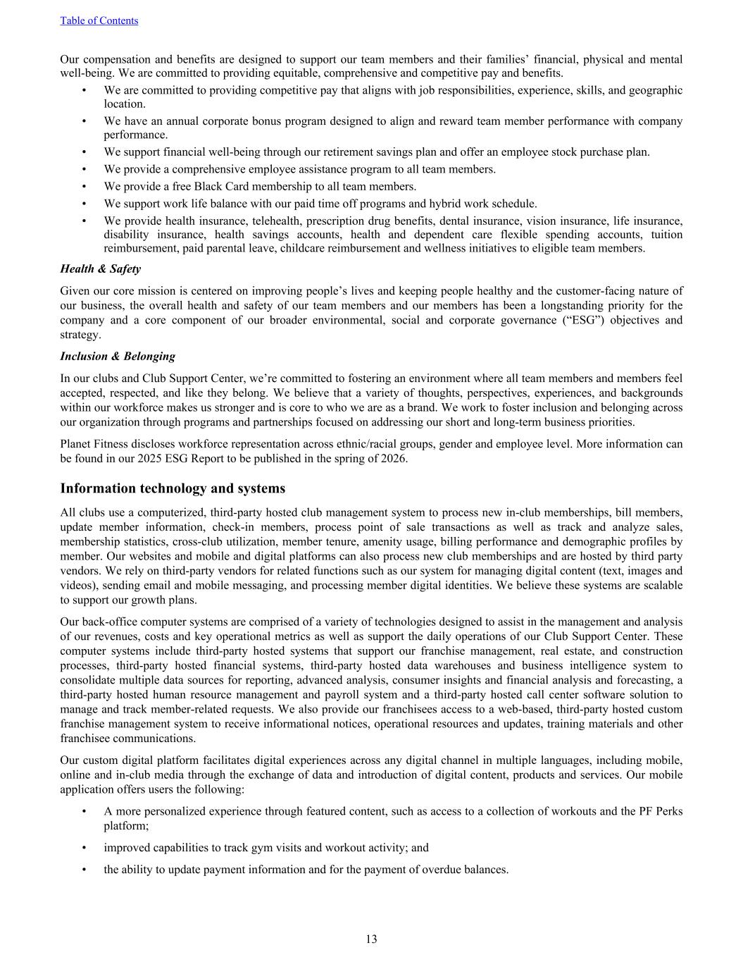 Our compensation and benefits are designed to support our team members and their families’ financial, physical and mental well-being. We are committed to providing equitable, comprehensive and competitive pay and benefits. • We are committed to providing competitive pay that aligns with job responsibilities, experience, skills, and geographic location. • We have an annual corporate bonus program designed to align and reward team member performance with company performance. • We support financial well-being through our retirement savings plan and offer an employee stock purchase plan. • We provide a comprehensive employee assistance program to all team members. • We provide a free Black Card membership to all team members. • We support work life balance with our paid time off programs and hybrid work schedule. • We provide health insurance, telehealth, prescription drug benefits, dental insurance, vision insurance, life insurance, disability insurance, health savings accounts, health and dependent care flexible spending accounts, tuition reimbursement, paid parental leave, childcare reimbursement and wellness initiatives to eligible team members. Health & Safety Given our core mission is centered on improving people’s lives and keeping people healthy and the customer-facing nature of our business, the overall health and safety of our team members and our members has been a longstanding priority for the company and a core component of our broader environmental, social and corporate governance (“ESG”) objectives and strategy. Inclusion & Belonging In our clubs and Club Support Center, we’re committed to fostering an environment where all team members and members feel accepted, respected, and like they belong. We believe that a variety of thoughts, perspectives, experiences, and backgrounds within our workforce makes us stronger and is core to who we are as a brand. We work to foster inclusion and belonging across our organization through programs and partnerships focused on addressing our short and long-term business priorities. Planet Fitness discloses workforce representation across ethnic/racial groups, gender and employee level. More information can be found in our 2025 ESG Report to be published in the spring of 2026. Information technology and systems All clubs use a computerized, third-party hosted club management system to process new in-club memberships, bill members, update member information, check-in members, process point of sale transactions as well as track and analyze sales, membership statistics, cross-club utilization, member tenure, amenity usage, billing performance and demographic profiles by member. Our websites and mobile and digital platforms can also process new club memberships and are hosted by third party vendors. We rely on third-party vendors for related functions such as our system for managing digital content (text, images and videos), sending email and mobile messaging, and processing member digital identities. We believe these systems are scalable to support our growth plans. Our back-office computer systems are comprised of a variety of technologies designed to assist in the management and analysis of our revenues, costs and key operational metrics as well as support the daily operations of our Club Support Center. These computer systems include third-party hosted systems that support our franchise management, real estate, and construction processes, third-party hosted financial systems, third-party hosted data warehouses and business intelligence system to consolidate multiple data sources for reporting, advanced analysis, consumer insights and financial analysis and forecasting, a third-party hosted human resource management and payroll system and a third-party hosted call center software solution to manage and track member-related requests. We also provide our franchisees access to a web-based, third-party hosted custom franchise management system to receive informational notices, operational resources and updates, training materials and other franchisee communications. Our custom digital platform facilitates digital experiences across any digital channel in multiple languages, including mobile, online and in-club media through the exchange of data and introduction of digital content, products and services. Our mobile application offers users the following: • A more personalized experience through featured content, such as access to a collection of workouts and the PF Perks platform; • improved capabilities to track gym visits and workout activity; and • the ability to update payment information and for the payment of overdue balances. Table of Contents 13