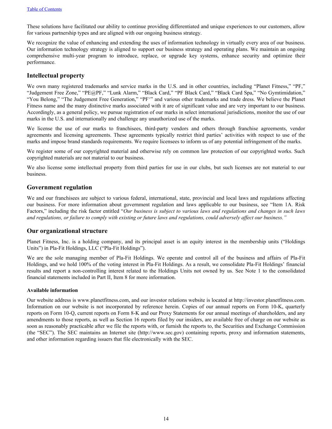 These solutions have facilitated our ability to continue providing differentiated and unique experiences to our customers, allow for various partnership types and are aligned with our ongoing business strategy. We recognize the value of enhancing and extending the uses of information technology in virtually every area of our business. Our information technology strategy is aligned to support our business strategy and operating plans. We maintain an ongoing comprehensive multi-year program to introduce, replace, or upgrade key systems, enhance security and optimize their performance. Intellectual property We own many registered trademarks and service marks in the U.S. and in other countries, including “Planet Fitness,” “PF,” “Judgement Free Zone,” “PE@PF,” “Lunk Alarm,” “Black Card,” “PF Black Card,” “Black Card Spa,” “No Gymtimidation,” “You Belong,” “The Judgement Free Generation,” “PF+” and various other trademarks and trade dress. We believe the Planet Fitness name and the many distinctive marks associated with it are of significant value and are very important to our business. Accordingly, as a general policy, we pursue registration of our marks in select international jurisdictions, monitor the use of our marks in the U.S. and internationally and challenge any unauthorized use of the marks. We license the use of our marks to franchisees, third-party vendors and others through franchise agreements, vendor agreements and licensing agreements. These agreements typically restrict third parties’ activities with respect to use of the marks and impose brand standards requirements. We require licensees to inform us of any potential infringement of the marks. We register some of our copyrighted material and otherwise rely on common law protection of our copyrighted works. Such copyrighted materials are not material to our business. We also license some intellectual property from third parties for use in our clubs, but such licenses are not material to our business. Government regulation We and our franchisees are subject to various federal, international, state, provincial and local laws and regulations affecting our business. For more information about government regulation and laws applicable to our business, see “Item 1A. Risk Factors,” including the risk factor entitled “Our business is subject to various laws and regulations and changes in such laws and regulations, or failure to comply with existing or future laws and regulations, could adversely affect our business.” Our organizational structure Planet Fitness, Inc. is a holding company, and its principal asset is an equity interest in the membership units (“Holdings Units”) in Pla-Fit Holdings, LLC (“Pla-Fit Holdings”). We are the sole managing member of Pla-Fit Holdings. We operate and control all of the business and affairs of Pla-Fit Holdings, and we hold 100% of the voting interest in Pla-Fit Holdings. As a result, we consolidate Pla-Fit Holdings’ financial results and report a non-controlling interest related to the Holdings Units not owned by us. See Note 1 to the consolidated financial statements included in Part II, Item 8 for more information. Available information Our website address is www.planetfitness.com, and our investor relations website is located at http://investor.planetfitness.com. Information on our website is not incorporated by reference herein. Copies of our annual reports on Form 10-K, quarterly reports on Form 10-Q, current reports on Form 8-K and our Proxy Statements for our annual meetings of shareholders, and any amendments to those reports, as well as Section 16 reports filed by our insiders, are available free of charge on our website as soon as reasonably practicable after we file the reports with, or furnish the reports to, the Securities and Exchange Commission (the “SEC”). The SEC maintains an Internet site (http://www.sec.gov) containing reports, proxy and information statements, and other information regarding issuers that file electronically with the SEC. Table of Contents 14