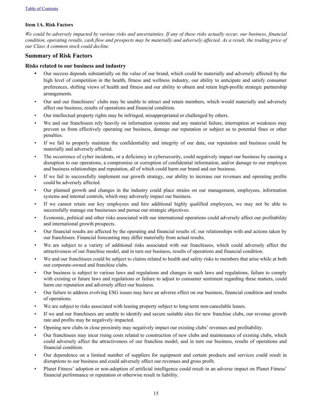Item 1A. Risk Factors We could be adversely impacted by various risks and uncertainties. If any of these risks actually occur, our business, financial condition, operating results, cash flow and prospects may be materially and adversely affected. As a result, the trading price of our Class A common stock could decline. Summary of Risk Factors Risks related to our business and industry • Our success depends substantially on the value of our brand, which could be materially and adversely affected by the high level of competition in the health, fitness and wellness industry, our ability to anticipate and satisfy consumer preferences, shifting views of health and fitness and our ability to obtain and retain high-profile strategic partnership arrangements. • Our and our franchisees’ clubs may be unable to attract and retain members, which would materially and adversely affect our business, results of operations and financial condition. • Our intellectual property rights may be infringed, misappropriated or challenged by others. • We and our franchisees rely heavily on information systems and any material failure, interruption or weakness may prevent us from effectively operating our business, damage our reputation or subject us to potential fines or other penalties. • If we fail to properly maintain the confidentiality and integrity of our data, our reputation and business could be materially and adversely affected. • The occurrence of cyber incidents, or a deficiency in cybersecurity, could negatively impact our business by causing a disruption to our operations, a compromise or corruption of confidential information, and/or damage to our employee and business relationships and reputation, all of which could harm our brand and our business. • If we fail to successfully implement our growth strategy, our ability to increase our revenues and operating profits could be adversely affected. • Our planned growth and changes in the industry could place strains on our management, employees, information systems and internal controls, which may adversely impact our business. • If we cannot retain our key employees and hire additional highly qualified employees, we may not be able to successfully manage our businesses and pursue our strategic objectives. • Economic, political and other risks associated with our international operations could adversely affect our profitability and international growth prospects. • Our financial results are affected by the operating and financial results of, our relationships with and actions taken by our franchisees. Financial forecasting may differ materially from actual results. • We are subject to a variety of additional risks associated with our franchisees, which could adversely affect the attractiveness of our franchise model, and in turn our business, results of operations and financial condition. • We and our franchisees could be subject to claims related to health and safety risks to members that arise while at both our corporate-owned and franchise clubs. • Our business is subject to various laws and regulations and changes in such laws and regulations, failure to comply with existing or future laws and regulations or failure to adjust to consumer sentiment regarding these matters, could harm our reputation and adversely affect our business. • Our failure to address evolving ESG issues may have an adverse effect on our business, financial condition and results of operations. • We are subject to risks associated with leasing property subject to long-term non-cancelable leases. • If we and our franchisees are unable to identify and secure suitable sites for new franchise clubs, our revenue growth rate and profits may be negatively impacted. • Opening new clubs in close proximity may negatively impact our existing clubs’ revenues and profitability. • Our franchisees may incur rising costs related to construction of new clubs and maintenance of existing clubs, which could adversely affect the attractiveness of our franchise model, and in turn our business, results of operations and financial condition. • Our dependence on a limited number of suppliers for equipment and certain products and services could result in disruptions to our business and could adversely affect our revenues and gross profit. • Planet Fitness’ adoption or non-adoption of artificial intelligence could result in an adverse impact on Planet Fitness’ financial performance or reputation or otherwise result in liability. Table of Contents 15
