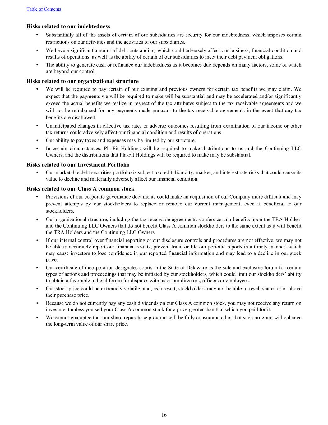 Risks related to our indebtedness • Substantially all of the assets of certain of our subsidiaries are security for our indebtedness, which imposes certain restrictions on our activities and the activities of our subsidiaries. • We have a significant amount of debt outstanding, which could adversely affect our business, financial condition and results of operations, as well as the ability of certain of our subsidiaries to meet their debt payment obligations. • The ability to generate cash or refinance our indebtedness as it becomes due depends on many factors, some of which are beyond our control. Risks related to our organizational structure • We will be required to pay certain of our existing and previous owners for certain tax benefits we may claim. We expect that the payments we will be required to make will be substantial and may be accelerated and/or significantly exceed the actual benefits we realize in respect of the tax attributes subject to the tax receivable agreements and we will not be reimbursed for any payments made pursuant to the tax receivable agreements in the event that any tax benefits are disallowed. • Unanticipated changes in effective tax rates or adverse outcomes resulting from examination of our income or other tax returns could adversely affect our financial condition and results of operations. • Our ability to pay taxes and expenses may be limited by our structure. • In certain circumstances, Pla-Fit Holdings will be required to make distributions to us and the Continuing LLC Owners, and the distributions that Pla-Fit Holdings will be required to make may be substantial. Risks related to our Investment Portfolio • Our marketable debt securities portfolio is subject to credit, liquidity, market, and interest rate risks that could cause its value to decline and materially adversely affect our financial condition. Risks related to our Class A common stock • Provisions of our corporate governance documents could make an acquisition of our Company more difficult and may prevent attempts by our stockholders to replace or remove our current management, even if beneficial to our stockholders. • Our organizational structure, including the tax receivable agreements, confers certain benefits upon the TRA Holders and the Continuing LLC Owners that do not benefit Class A common stockholders to the same extent as it will benefit the TRA Holders and the Continuing LLC Owners. • If our internal control over financial reporting or our disclosure controls and procedures are not effective, we may not be able to accurately report our financial results, prevent fraud or file our periodic reports in a timely manner, which may cause investors to lose confidence in our reported financial information and may lead to a decline in our stock price. • Our certificate of incorporation designates courts in the State of Delaware as the sole and exclusive forum for certain types of actions and proceedings that may be initiated by our stockholders, which could limit our stockholders’ ability to obtain a favorable judicial forum for disputes with us or our directors, officers or employees. • Our stock price could be extremely volatile, and, as a result, stockholders may not be able to resell shares at or above their purchase price. • Because we do not currently pay any cash dividends on our Class A common stock, you may not receive any return on investment unless you sell your Class A common stock for a price greater than that which you paid for it. • We cannot guarantee that our share repurchase program will be fully consummated or that such program will enhance the long-term value of our share price. Table of Contents 16