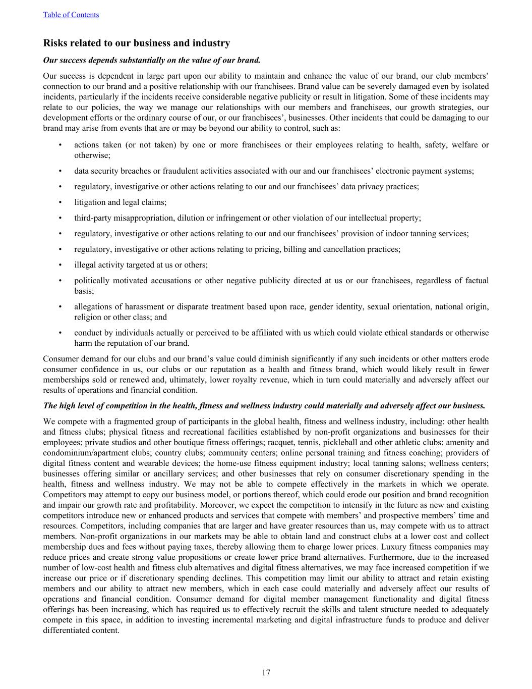 Risks related to our business and industry Our success depends substantially on the value of our brand. Our success is dependent in large part upon our ability to maintain and enhance the value of our brand, our club members’ connection to our brand and a positive relationship with our franchisees. Brand value can be severely damaged even by isolated incidents, particularly if the incidents receive considerable negative publicity or result in litigation. Some of these incidents may relate to our policies, the way we manage our relationships with our members and franchisees, our growth strategies, our development efforts or the ordinary course of our, or our franchisees’, businesses. Other incidents that could be damaging to our brand may arise from events that are or may be beyond our ability to control, such as: • actions taken (or not taken) by one or more franchisees or their employees relating to health, safety, welfare or otherwise; • data security breaches or fraudulent activities associated with our and our franchisees’ electronic payment systems; • regulatory, investigative or other actions relating to our and our franchisees’ data privacy practices; • litigation and legal claims; • third-party misappropriation, dilution or infringement or other violation of our intellectual property; • regulatory, investigative or other actions relating to our and our franchisees’ provision of indoor tanning services; • regulatory, investigative or other actions relating to pricing, billing and cancellation practices; • illegal activity targeted at us or others; • politically motivated accusations or other negative publicity directed at us or our franchisees, regardless of factual basis; • allegations of harassment or disparate treatment based upon race, gender identity, sexual orientation, national origin, religion or other class; and • conduct by individuals actually or perceived to be affiliated with us which could violate ethical standards or otherwise harm the reputation of our brand. Consumer demand for our clubs and our brand’s value could diminish significantly if any such incidents or other matters erode consumer confidence in us, our clubs or our reputation as a health and fitness brand, which would likely result in fewer memberships sold or renewed and, ultimately, lower royalty revenue, which in turn could materially and adversely affect our results of operations and financial condition. The high level of competition in the health, fitness and wellness industry could materially and adversely affect our business. We compete with a fragmented group of participants in the global health, fitness and wellness industry, including: other health and fitness clubs; physical fitness and recreational facilities established by non-profit organizations and businesses for their employees; private studios and other boutique fitness offerings; racquet, tennis, pickleball and other athletic clubs; amenity and condominium/apartment clubs; country clubs; community centers; online personal training and fitness coaching; providers of digital fitness content and wearable devices; the home-use fitness equipment industry; local tanning salons; wellness centers; businesses offering similar or ancillary services; and other businesses that rely on consumer discretionary spending in the health, fitness and wellness industry. We may not be able to compete effectively in the markets in which we operate. Competitors may attempt to copy our business model, or portions thereof, which could erode our position and brand recognition and impair our growth rate and profitability. Moreover, we expect the competition to intensify in the future as new and existing competitors introduce new or enhanced products and services that compete with members’ and prospective members’ time and resources. Competitors, including companies that are larger and have greater resources than us, may compete with us to attract members. Non-profit organizations in our markets may be able to obtain land and construct clubs at a lower cost and collect membership dues and fees without paying taxes, thereby allowing them to charge lower prices. Luxury fitness companies may reduce prices and create strong value propositions or create lower price brand alternatives. Furthermore, due to the increased number of low-cost health and fitness club alternatives and digital fitness alternatives, we may face increased competition if we increase our price or if discretionary spending declines. This competition may limit our ability to attract and retain existing members and our ability to attract new members, which in each case could materially and adversely affect our results of operations and financial condition. Consumer demand for digital member management functionality and digital fitness offerings has been increasing, which has required us to effectively recruit the skills and talent structure needed to adequately compete in this space, in addition to investing incremental marketing and digital infrastructure funds to produce and deliver differentiated content. Table of Contents 17
