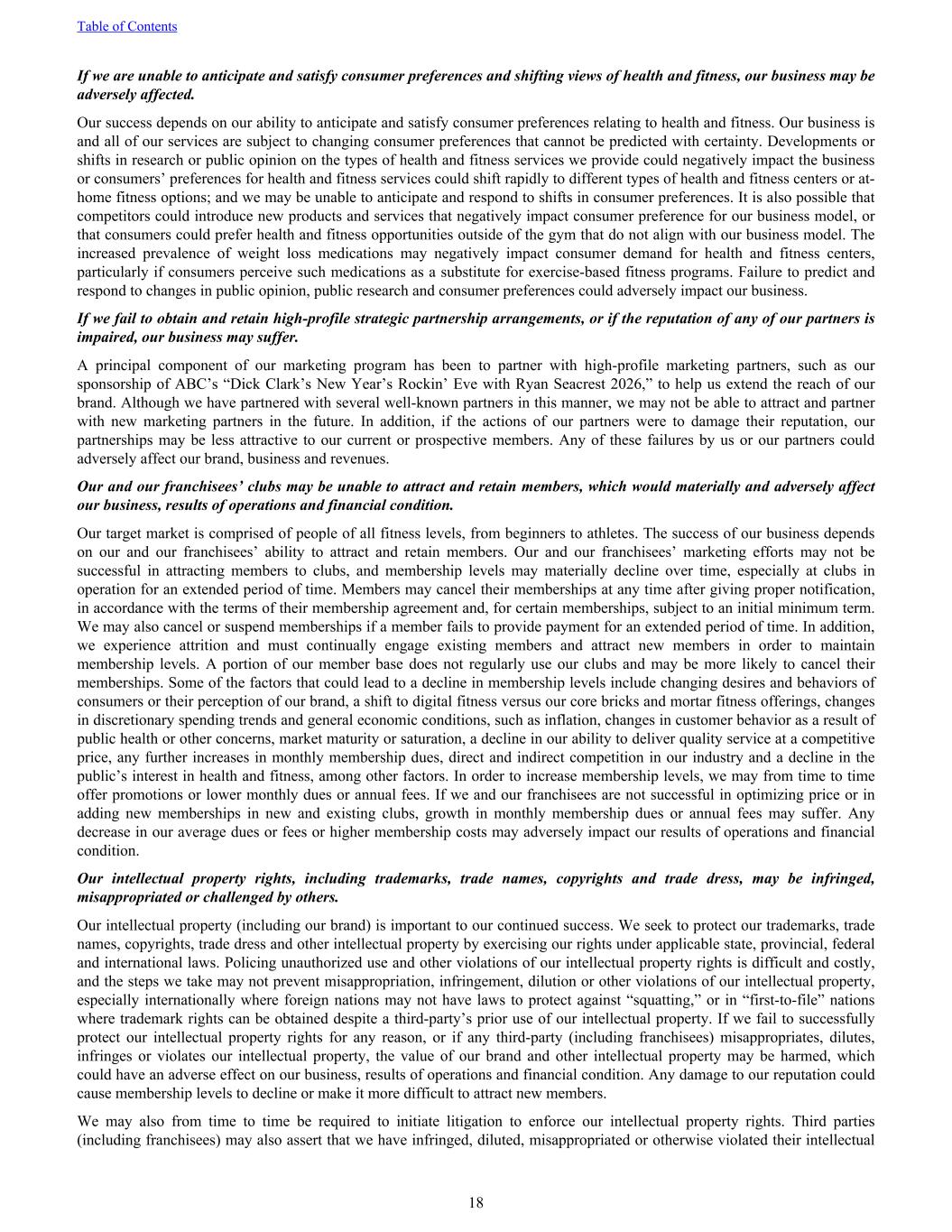 If we are unable to anticipate and satisfy consumer preferences and shifting views of health and fitness, our business may be adversely affected. Our success depends on our ability to anticipate and satisfy consumer preferences relating to health and fitness. Our business is and all of our services are subject to changing consumer preferences that cannot be predicted with certainty. Developments or shifts in research or public opinion on the types of health and fitness services we provide could negatively impact the business or consumers’ preferences for health and fitness services could shift rapidly to different types of health and fitness centers or at- home fitness options; and we may be unable to anticipate and respond to shifts in consumer preferences. It is also possible that competitors could introduce new products and services that negatively impact consumer preference for our business model, or that consumers could prefer health and fitness opportunities outside of the gym that do not align with our business model. The increased prevalence of weight loss medications may negatively impact consumer demand for health and fitness centers, particularly if consumers perceive such medications as a substitute for exercise-based fitness programs. Failure to predict and respond to changes in public opinion, public research and consumer preferences could adversely impact our business. If we fail to obtain and retain high-profile strategic partnership arrangements, or if the reputation of any of our partners is impaired, our business may suffer. A principal component of our marketing program has been to partner with high-profile marketing partners, such as our sponsorship of ABC’s “Dick Clark’s New Year’s Rockin’ Eve with Ryan Seacrest 2026,” to help us extend the reach of our brand. Although we have partnered with several well-known partners in this manner, we may not be able to attract and partner with new marketing partners in the future. In addition, if the actions of our partners were to damage their reputation, our partnerships may be less attractive to our current or prospective members. Any of these failures by us or our partners could adversely affect our brand, business and revenues. Our and our franchisees’ clubs may be unable to attract and retain members, which would materially and adversely affect our business, results of operations and financial condition. Our target market is comprised of people of all fitness levels, from beginners to athletes. The success of our business depends on our and our franchisees’ ability to attract and retain members. Our and our franchisees’ marketing efforts may not be successful in attracting members to clubs, and membership levels may materially decline over time, especially at clubs in operation for an extended period of time. Members may cancel their memberships at any time after giving proper notification, in accordance with the terms of their membership agreement and, for certain memberships, subject to an initial minimum term. We may also cancel or suspend memberships if a member fails to provide payment for an extended period of time. In addition, we experience attrition and must continually engage existing members and attract new members in order to maintain membership levels. A portion of our member base does not regularly use our clubs and may be more likely to cancel their memberships. Some of the factors that could lead to a decline in membership levels include changing desires and behaviors of consumers or their perception of our brand, a shift to digital fitness versus our core bricks and mortar fitness offerings, changes in discretionary spending trends and general economic conditions, such as inflation, changes in customer behavior as a result of public health or other concerns, market maturity or saturation, a decline in our ability to deliver quality service at a competitive price, any further increases in monthly membership dues, direct and indirect competition in our industry and a decline in the public’s interest in health and fitness, among other factors. In order to increase membership levels, we may from time to time offer promotions or lower monthly dues or annual fees. If we and our franchisees are not successful in optimizing price or in adding new memberships in new and existing clubs, growth in monthly membership dues or annual fees may suffer. Any decrease in our average dues or fees or higher membership costs may adversely impact our results of operations and financial condition. Our intellectual property rights, including trademarks, trade names, copyrights and trade dress, may be infringed, misappropriated or challenged by others. Our intellectual property (including our brand) is important to our continued success. We seek to protect our trademarks, trade names, copyrights, trade dress and other intellectual property by exercising our rights under applicable state, provincial, federal and international laws. Policing unauthorized use and other violations of our intellectual property rights is difficult and costly, and the steps we take may not prevent misappropriation, infringement, dilution or other violations of our intellectual property, especially internationally where foreign nations may not have laws to protect against “squatting,” or in “first-to-file” nations where trademark rights can be obtained despite a third-party’s prior use of our intellectual property. If we fail to successfully protect our intellectual property rights for any reason, or if any third-party (including franchisees) misappropriates, dilutes, infringes or violates our intellectual property, the value of our brand and other intellectual property may be harmed, which could have an adverse effect on our business, results of operations and financial condition. Any damage to our reputation could cause membership levels to decline or make it more difficult to attract new members. We may also from time to 
