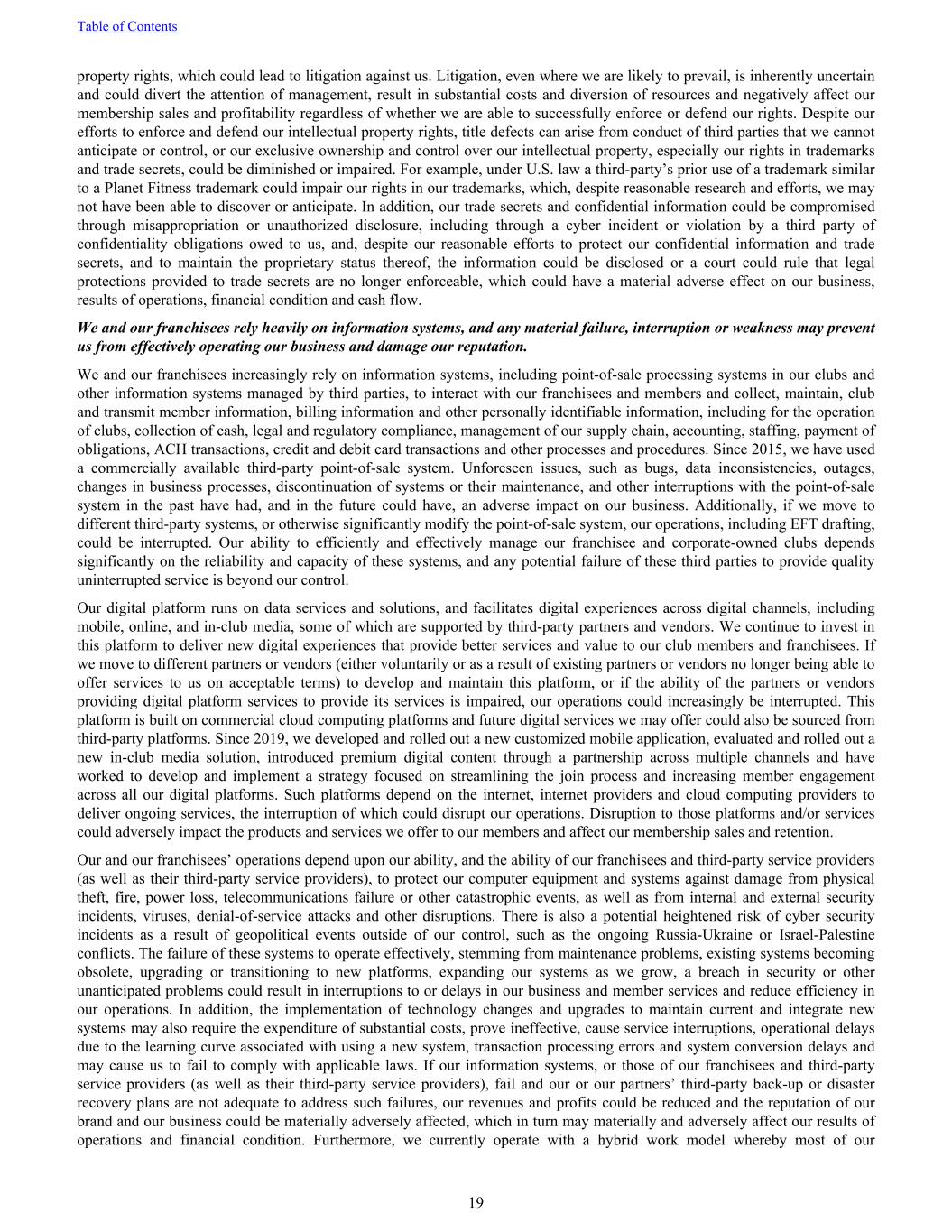 property rights, which could lead to litigation against us. Litigation, even where we are likely to prevail, is inherently uncertain and could divert the attention of management, result in substantial costs and diversion of resources and negatively affect our membership sales and profitability regardless of whether we are able to successfully enforce or defend our rights. Despite our efforts to enforce and defend our intellectual property rights, title defects can arise from conduct of third parties that we cannot anticipate or control, or our exclusive ownership and control over our intellectual property, especially our rights in trademarks and trade secrets, could be diminished or impaired. For example, under U.S. law a third-party’s prior use of a trademark similar to a Planet Fitness trademark could impair our rights in our trademarks, which, despite reasonable research and efforts, we may not have been able to discover or anticipate. In addition, our trade secrets and confidential information could be compromised through misappropriation or unauthorized disclosure, including through a cyber incident or violation by a third party of confidentiality obligations owed to us, and, despite our reasonable efforts to protect our confidential information and trade secrets, and to maintain the proprietary status thereof, the information could be disclosed or a court could rule that legal protections provided to trade secrets are no longer enforceable, which could have a material adverse effect on our business, results of operations, financial condition and cash flow. We and our franchisees rely heavily on information systems, and any material failure, interruption or weakness may prevent us from effectively operating our business and damage our reputation. We and our franchisees increasingly rely on information systems, including point-of-sale processing systems in our clubs and other information systems managed by third parties, to interact with our franchisees and members and collect, maintain, club and transmit member information, billing information and other personally identifiable information, including for the operation of clubs, collection of cash, legal and regulatory compliance, management of our supply chain, accounting, staffing, payment of obligations, ACH transactions, credit and debit card transactions and other processes and procedures. Since 2015, we have used a commercially available third-party point-of-sale system. Unforeseen issues, such as bugs, data inconsistencies, outages, changes in business processes, discontinuation of systems or their maintenance, and other interruptions with the point-of-sale system in the past have had, and in the future could have, an adverse impact on our business. Additionally, if we move to different third-party systems, or otherwise significantly modify the point-of-sale system, our operations, including EFT drafting, could be interrupted. Our ability to efficiently and effectively manage our franchisee and corporate-owned clubs depends significantly on the reliability and capacity of these systems, and any potential failure of these third parties to provide quality uninterrupted service is beyond our control. Our digital platform runs on data services and solutions, and facilitates digital experiences across digital channels, including mobile, online, and in-club media, some of which are supported by third-party partners and vendors. We continue to invest in this platform to deliver new digital experiences that provide better services and value to our club members and franchisees. If we move to different partners or vendors (either voluntarily or as a result of existing partners or vendors no longer being able to offer services to us on acceptable terms) to develop and maintain this platform, or if the ability of the partners or vendors providing digital platform services to provide its services is impaired, our operations could increasingly be interrupted. This platform is built on commercial cloud computing platforms and future digital services we may offer could also be sourced from third-party platforms. Since 2019, we developed and rolled out a new customized mobile application, evaluated and rolled out a new in-club media solution, introduced premium digital content through a partnership across multiple channels and have worked to develop and implement a strategy focused on streamlining the join process and increasing member engagement across all our digital platforms. Such platforms depend on the internet, internet providers and cloud computing providers to deliver ongoing services, the interruption of which could disrupt our operations. Disruption to those platforms and/or services could adversely impact the products and services we offer to our members and affect our membership sales and retention. Our and our franchisees’ operations depend upon our ability, and the ability of our franchisees and third-party service providers (as well as their third-party service providers), to protect our computer equipment and systems against damage from physical theft, fire, power loss, telecommunications failure or other catastrophic events, as well as from internal and external security incidents, viruses, denial-of-service attacks and other disruptions. There is also a potential heightened risk of cyber security incidents as a result of geopolitical events outside of our control, such as the ongoing Russia-Ukraine or Israel-Palestine conflicts. The failure of these systems to operate effectively, stemming from maintenance problems, existing systems becoming obsolete, upgrading or transitioning to new platforms, expanding our systems as we grow, a breach in security or other unanticipated problems could result in interruptions to or delays in our business and member services and reduce efficiency in our operations. In addition, the implementation of technology changes and upgrades to maintain current and integrate new systems may also req
