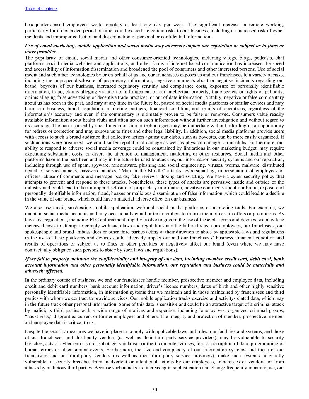 headquarters-based employees work remotely at least one day per week. The significant increase in remote working, particularly for an extended period of time, could exacerbate certain risks to our business, including an increased risk of cyber incidents and improper collection and dissemination of personal or confidential information. Use of email marketing, mobile application and social media may adversely impact our reputation or subject us to fines or other penalties. The popularity of email, social media and other consumer-oriented technologies, including v-logs, blogs, podcasts, chat platforms, social media websites and applications, and other forms of internet-based communication has increased the speed and accessibility of information dissemination and broadened the pool of consumers and other interested persons. Use of social media and such other technologies by or on behalf of us and our franchisees exposes us and our franchisees to a variety of risks, including the improper disclosure of proprietary information, negative comments about or negative incidents regarding our brand, boycotts of our business, increased regulatory scrutiny and compliance costs, exposure of personally identifiable information, fraud, claims alleging violation or infringement of our intellectual property, trade secrets or rights of publicity, claims alleging false advertising or deceptive trade practices, or out of date information. Notably, negative or false commentary about us has been in the past, and may at any time in the future be, posted on social media platforms or similar devices and may harm our business, brand, reputation, marketing partners, financial condition, and results of operations, regardless of the information’s accuracy and even if the commentary is ultimately proven to be false or removed. Consumers value readily available information about health clubs and often act on such information without further investigation and without regard to its accuracy. The harm caused by social media or similar technologies may be immediate without affording us an opportunity for redress or correction and may expose us to fines and other legal liability. In addition, social media platforms provide users with access to such a broad audience that collective action against our clubs, such as boycotts, can be more easily organized. If such actions were organized, we could suffer reputational damage as well as physical damage to our clubs. Furthermore, our ability to respond to adverse social media coverage could be constrained by limitations in our marketing budget, may require expending substantial costs, or divert the attention of management, marketing or other resources. Social media and other platforms have in the past been and may in the future be used to attack us, our information security systems and our reputation, including through use of spam, spyware, ransomware, phishing and social engineering, viruses, worms, malware, distributed denial of service attacks, password attacks, “Man in the Middle” attacks, cybersquatting, impersonation of employees or officers, abuse of comments and message boards, fake reviews, doxing and swatting. We have a cyber security policy that attempts to prevent and respond to these attacks. Nonetheless, these types of attacks are pervasive inside and outside of the industry and could lead to the improper disclosure of proprietary information, negative comments about our brand, exposure of personally identifiable information, fraud, hoaxes or malicious dissemination of false information, which could lead to a decline in the value of our brand, which could have a material adverse effect on our business. We also use email, sms/texting, mobile application, web and social media platforms as marketing tools. For example, we maintain social media accounts and may occasionally email or text members to inform them of certain offers or promotions. As laws and regulations, including FTC enforcement, rapidly evolve to govern the use of these platforms and devices, we may face increased costs to attempt to comply with such laws and regulations and the failure by us, our employees, our franchisees, our spokespeople and brand ambassadors or other third parties acting at their direction to abide by applicable laws and regulations in the use of these platforms and devices could adversely impact our and our franchisees’ business, financial condition and results of operations or subject us to fines or other penalties or negatively affect our brand (even where we may have contractually obligated such persons to abide by such laws and regulations). If we fail to properly maintain the confidentiality and integrity of our data, including member credit card, debit card, bank account information and other personally identifiable information, our reputation and business could be materially and adversely affected. In the ordinary course of business, we and our franchisees handle member, prospective member and employee data, including credit and debit card numbers, bank account information, driver’s license numbers, dates of birth and other highly sensitive personally identifiable information, in information systems that we maintain and in those maintained by franchisees and third parties with whom we contract to provide services. Our mobile application tracks exercise and activity-related data, which may in the future track other personal information. Some of this data is sensitive and could be an attractive target of a criminal attack by malicious third parties with a wide range of motives and expertise, including lone wolves, organized criminal groups, “hacktivists,” disgruntled current or former employees and others. The integrity and protection of member, prospective member and employee data is critical to us. Despite the security measures we have in place to comply with applicable laws and rules, our facilities and systems, and those of our franchisees and third-party vendor