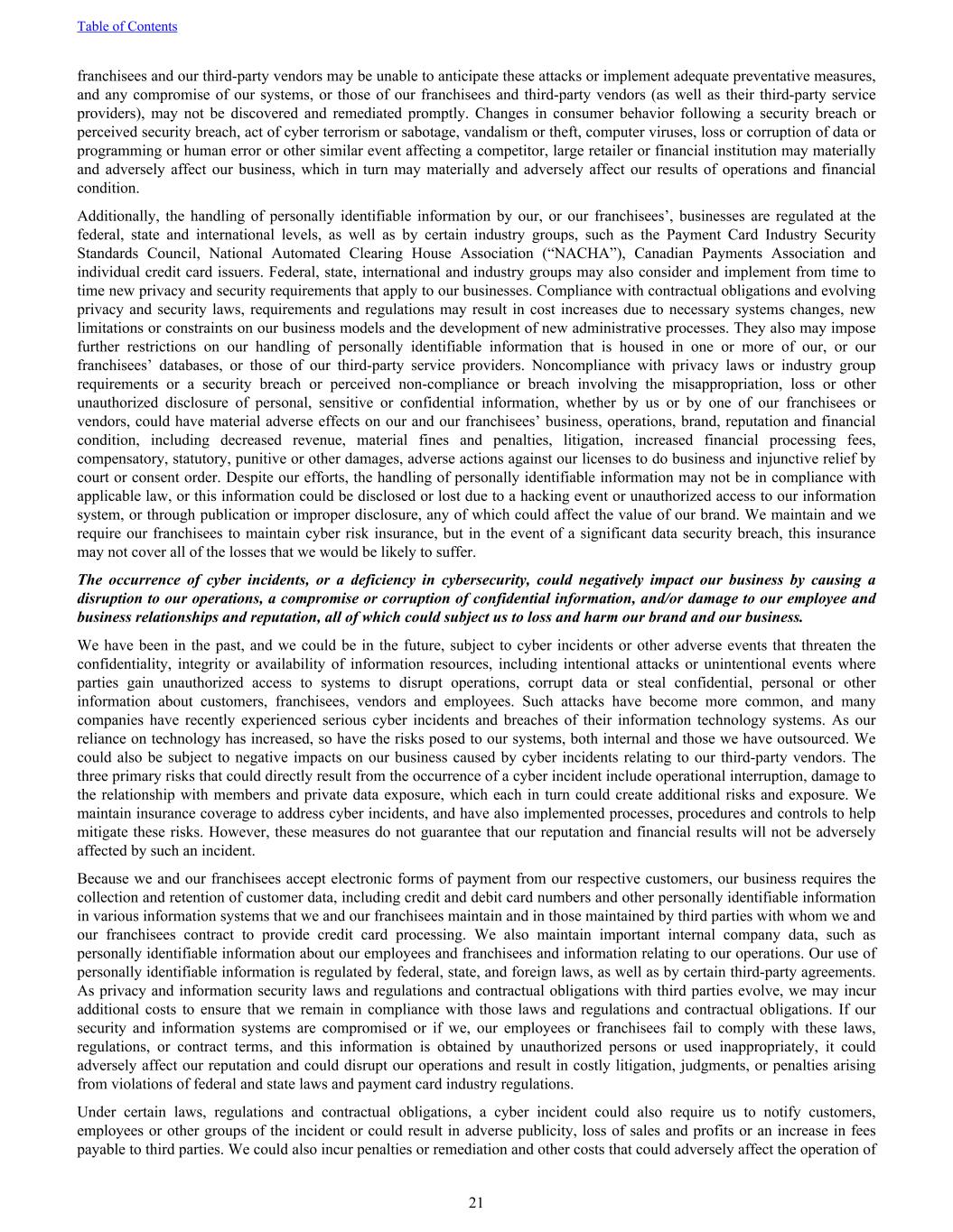 franchisees and our third-party vendors may be unable to anticipate these attacks or implement adequate preventative measures, and any compromise of our systems, or those of our franchisees and third-party vendors (as well as their third-party service providers), may not be discovered and remediated promptly. Changes in consumer behavior following a security breach or perceived security breach, act of cyber terrorism or sabotage, vandalism or theft, computer viruses, loss or corruption of data or programming or human error or other similar event affecting a competitor, large retailer or financial institution may materially and adversely affect our business, which in turn may materially and adversely affect our results of operations and financial condition. Additionally, the handling of personally identifiable information by our, or our franchisees’, businesses are regulated at the federal, state and international levels, as well as by certain industry groups, such as the Payment Card Industry Security Standards Council, National Automated Clearing House Association (“NACHA”), Canadian Payments Association and individual credit card issuers. Federal, state, international and industry groups may also consider and implement from time to time new privacy and security requirements that apply to our businesses. Compliance with contractual obligations and evolving privacy and security laws, requirements and regulations may result in cost increases due to necessary systems changes, new limitations or constraints on our business models and the development of new administrative processes. They also may impose further restrictions on our handling of personally identifiable information that is housed in one or more of our, or our franchisees’ databases, or those of our third-party service providers. Noncompliance with privacy laws or industry group requirements or a security breach or perceived non-compliance or breach involving the misappropriation, loss or other unauthorized disclosure of personal, sensitive or confidential information, whether by us or by one of our franchisees or vendors, could have material adverse effects on our and our franchisees’ business, operations, brand, reputation and financial condition, including decreased revenue, material fines and penalties, litigation, increased financial processing fees, compensatory, statutory, punitive or other damages, adverse actions against our licenses to do business and injunctive relief by court or consent order. Despite our efforts, the handling of personally identifiable information may not be in compliance with applicable law, or this information could be disclosed or lost due to a hacking event or unauthorized access to our information system, or through publication or improper disclosure, any of which could affect the value of our brand. We maintain and we require our franchisees to maintain cyber risk insurance, but in the event of a significant data security breach, this insurance may not cover all of the losses that we would be likely to suffer. The occurrence of cyber incidents, or a deficiency in cybersecurity, could negatively impact our business by causing a disruption to our operations, a compromise or corruption of confidential information, and/or damage to our employee and business relationships and reputation, all of which could subject us to loss and harm our brand and our business. We have been in the past, and we could be in the future, subject to cyber incidents or other adverse events that threaten the confidentiality, integrity or availability of information resources, including intentional attacks or unintentional events where parties gain unauthorized access to systems to disrupt operations, corrupt data or steal confidential, personal or other information about customers, franchisees, vendors and employees. Such attacks have become more common, and many companies have recently experienced serious cyber incidents and breaches of their information technology systems. As our reliance on technology has increased, so have the risks posed to our systems, both internal and those we have outsourced. We could also be subject to negative impacts on our business caused by cyber incidents relating to our third-party vendors. The three primary risks that could directly result from the occurrence of a cyber incident include operational interruption, damage to the relationship with members and private data exposure, which each in turn could create additional risks and exposure. We maintain insurance coverage to address cyber incidents, and have also implemented processes, procedures and controls to help mitigate these risks. However, these measures do not guarantee that our reputation and financial results will not be adversely affected by such an incident. Because we and our franchisees accept electronic forms of payment from our respective customers, our business requires the collection and retention of customer data, including credit and debit card numbers and other personally identifiable information in various information systems that we and our franchisees maintain and in those maintained by third parties with whom we and our franchisees contract to provide credit card processing. We also maintain important internal company data, such as personally identifiable information about our employees and franchisees and information relating to our operations. Our use of personally identifiable information is regulated by federal, state, and foreign laws, as well as by certain third-party agreements. As privacy and information security laws and regulations and contractual obligations with third parties evolve, we may incur additional costs to ensure that we remain in compliance with those laws and regulations and contractual obligations. If our security and information systems are compromised or if we, our employees or franchisees fail to comply with these laws, regulations, or contract terms, and this information is obt