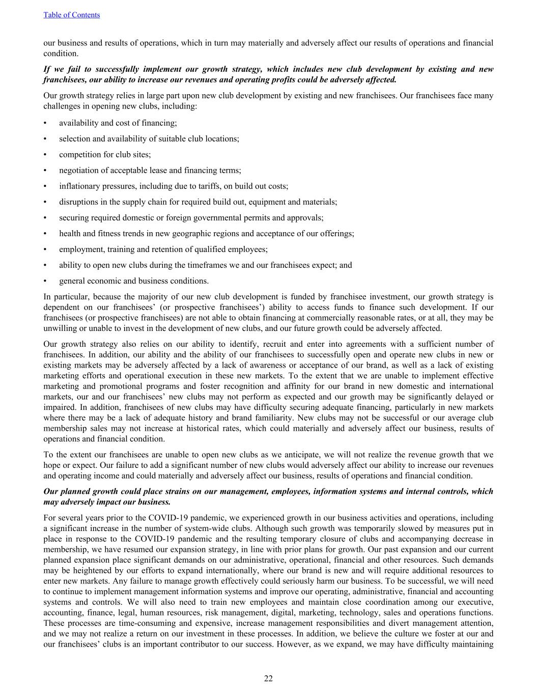 our business and results of operations, which in turn may materially and adversely affect our results of operations and financial condition. If we fail to successfully implement our growth strategy, which includes new club development by existing and new franchisees, our ability to increase our revenues and operating profits could be adversely affected. Our growth strategy relies in large part upon new club development by existing and new franchisees. Our franchisees face many challenges in opening new clubs, including: • availability and cost of financing; • selection and availability of suitable club locations; • competition for club sites; • negotiation of acceptable lease and financing terms; • inflationary pressures, including due to tariffs, on build out costs; • disruptions in the supply chain for required build out, equipment and materials; • securing required domestic or foreign governmental permits and approvals; • health and fitness trends in new geographic regions and acceptance of our offerings; • employment, training and retention of qualified employees; • ability to open new clubs during the timeframes we and our franchisees expect; and • general economic and business conditions. In particular, because the majority of our new club development is funded by franchisee investment, our growth strategy is dependent on our franchisees’ (or prospective franchisees’) ability to access funds to finance such development. If our franchisees (or prospective franchisees) are not able to obtain financing at commercially reasonable rates, or at all, they may be unwilling or unable to invest in the development of new clubs, and our future growth could be adversely affected. Our growth strategy also relies on our ability to identify, recruit and enter into agreements with a sufficient number of franchisees. In addition, our ability and the ability of our franchisees to successfully open and operate new clubs in new or existing markets may be adversely affected by a lack of awareness or acceptance of our brand, as well as a lack of existing marketing efforts and operational execution in these new markets. To the extent that we are unable to implement effective marketing and promotional programs and foster recognition and affinity for our brand in new domestic and international markets, our and our franchisees’ new clubs may not perform as expected and our growth may be significantly delayed or impaired. In addition, franchisees of new clubs may have difficulty securing adequate financing, particularly in new markets where there may be a lack of adequate history and brand familiarity. New clubs may not be successful or our average club membership sales may not increase at historical rates, which could materially and adversely affect our business, results of operations and financial condition. To the extent our franchisees are unable to open new clubs as we anticipate, we will not realize the revenue growth that we hope or expect. Our failure to add a significant number of new clubs would adversely affect our ability to increase our revenues and operating income and could materially and adversely affect our business, results of operations and financial condition. Our planned growth could place strains on our management, employees, information systems and internal controls, which may adversely impact our business. For several years prior to the COVID-19 pandemic, we experienced growth in our business activities and operations, including a significant increase in the number of system-wide clubs. Although such growth was temporarily slowed by measures put in place in response to the COVID-19 pandemic and the resulting temporary closure of clubs and accompanying decrease in membership, we have resumed our expansion strategy, in line with prior plans for growth. Our past expansion and our current planned expansion place significant demands on our administrative, operational, financial and other resources. Such demands may be heightened by our efforts to expand internationally, where our brand is new and will require additional resources to enter new markets. Any failure to manage growth effectively could seriously harm our business. To be successful, we will need to continue to implement management information systems and improve our operating, administrative, financial and accounting systems and controls. We will also need to train new employees and maintain close coordination among our executive, accounting, finance, legal, human resources, risk management, digital, marketing, technology, sales and operations functions. These processes are time-consuming and expensive, increase management responsibilities and divert management attention, and we may not realize a return on our investment in these processes. In addition, we believe the culture we foster at our and our franchisees’ clubs is an important contributor to our success. However, as we expand, we may have difficulty maintaining Table of Contents 22