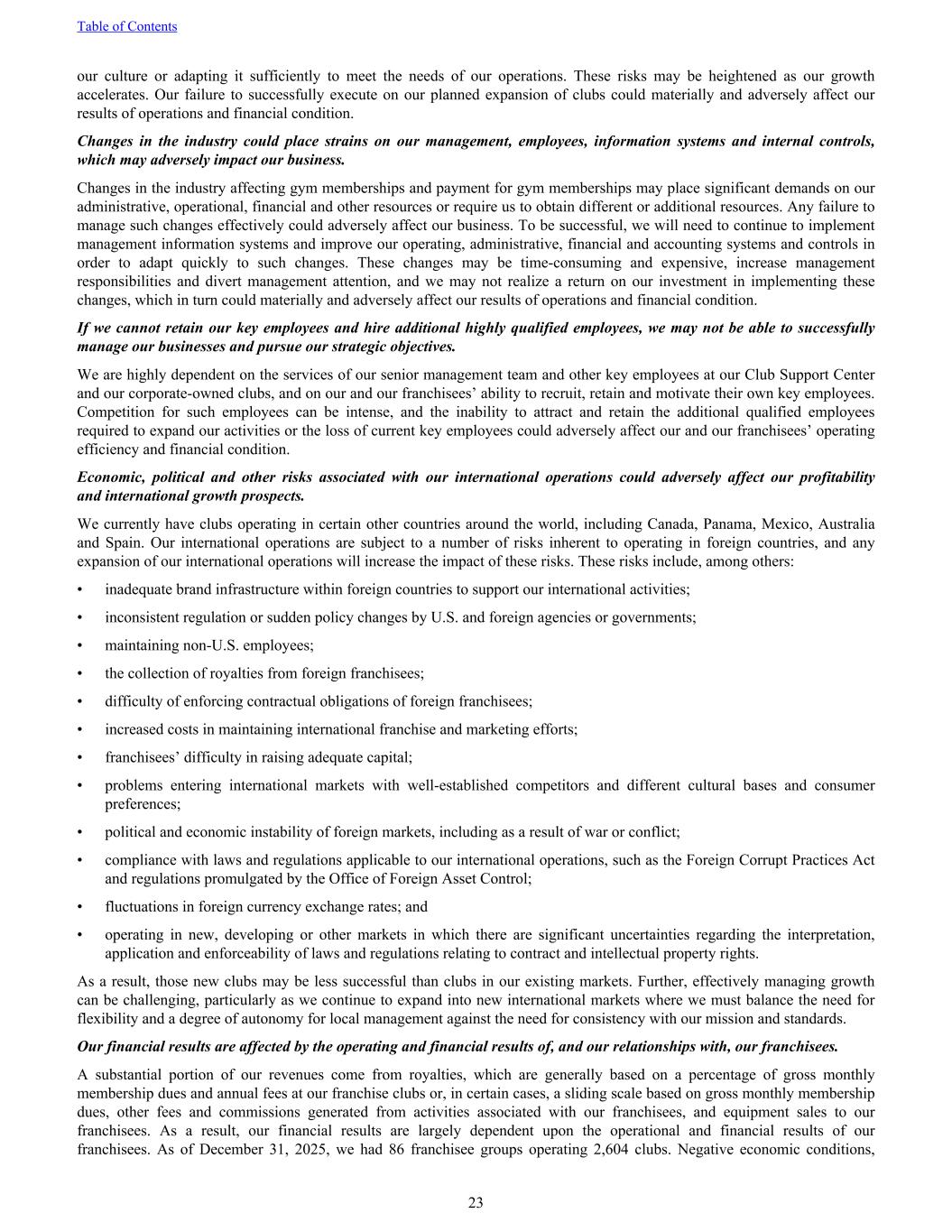 our culture or adapting it sufficiently to meet the needs of our operations. These risks may be heightened as our growth accelerates. Our failure to successfully execute on our planned expansion of clubs could materially and adversely affect our results of operations and financial condition. Changes in the industry could place strains on our management, employees, information systems and internal controls, which may adversely impact our business. Changes in the industry affecting gym memberships and payment for gym memberships may place significant demands on our administrative, operational, financial and other resources or require us to obtain different or additional resources. Any failure to manage such changes effectively could adversely affect our business. To be successful, we will need to continue to implement management information systems and improve our operating, administrative, financial and accounting systems and controls in order to adapt quickly to such changes. These changes may be time-consuming and expensive, increase management responsibilities and divert management attention, and we may not realize a return on our investment in implementing these changes, which in turn could materially and adversely affect our results of operations and financial condition. If we cannot retain our key employees and hire additional highly qualified employees, we may not be able to successfully manage our businesses and pursue our strategic objectives. We are highly dependent on the services of our senior management team and other key employees at our Club Support Center and our corporate-owned clubs, and on our and our franchisees’ ability to recruit, retain and motivate their own key employees. Competition for such employees can be intense, and the inability to attract and retain the additional qualified employees required to expand our activities or the loss of current key employees could adversely affect our and our franchisees’ operating efficiency and financial condition. Economic, political and other risks associated with our international operations could adversely affect our profitability and international growth prospects. We currently have clubs operating in certain other countries around the world, including Canada, Panama, Mexico, Australia and Spain. Our international operations are subject to a number of risks inherent to operating in foreign countries, and any expansion of our international operations will increase the impact of these risks. These risks include, among others: • inadequate brand infrastructure within foreign countries to support our international activities; • inconsistent regulation or sudden policy changes by U.S. and foreign agencies or governments; • maintaining non-U.S. employees; • the collection of royalties from foreign franchisees; • difficulty of enforcing contractual obligations of foreign franchisees; • increased costs in maintaining international franchise and marketing efforts; • franchisees’ difficulty in raising adequate capital; • problems entering international markets with well-established competitors and different cultural bases and consumer preferences; • political and economic instability of foreign markets, including as a result of war or conflict; • compliance with laws and regulations applicable to our international operations, such as the Foreign Corrupt Practices Act and regulations promulgated by the Office of Foreign Asset Control; • fluctuations in foreign currency exchange rates; and • operating in new, developing or other markets in which there are significant uncertainties regarding the interpretation, application and enforceability of laws and regulations relating to contract and intellectual property rights. As a result, those new clubs may be less successful than clubs in our existing markets. Further, effectively managing growth can be challenging, particularly as we continue to expand into new international markets where we must balance the need for flexibility and a degree of autonomy for local management against the need for consistency with our mission and standards. Our financial results are affected by the operating and financial results of, and our relationships with, our franchisees. A substantial portion of our revenues come from royalties, which are generally based on a percentage of gross monthly membership dues and annual fees at our franchise clubs or, in certain cases, a sliding scale based on gross monthly membership dues, other fees and commissions generated from activities associated with our franchisees, and equipment sales to our franchisees. As a result, our financial results are largely dependent upon the operational and financial results of our franchisees. As of December 31, 2025, we had 86 franchisee groups operating 2,604 clubs. Negative economic conditions, Table of Contents 23