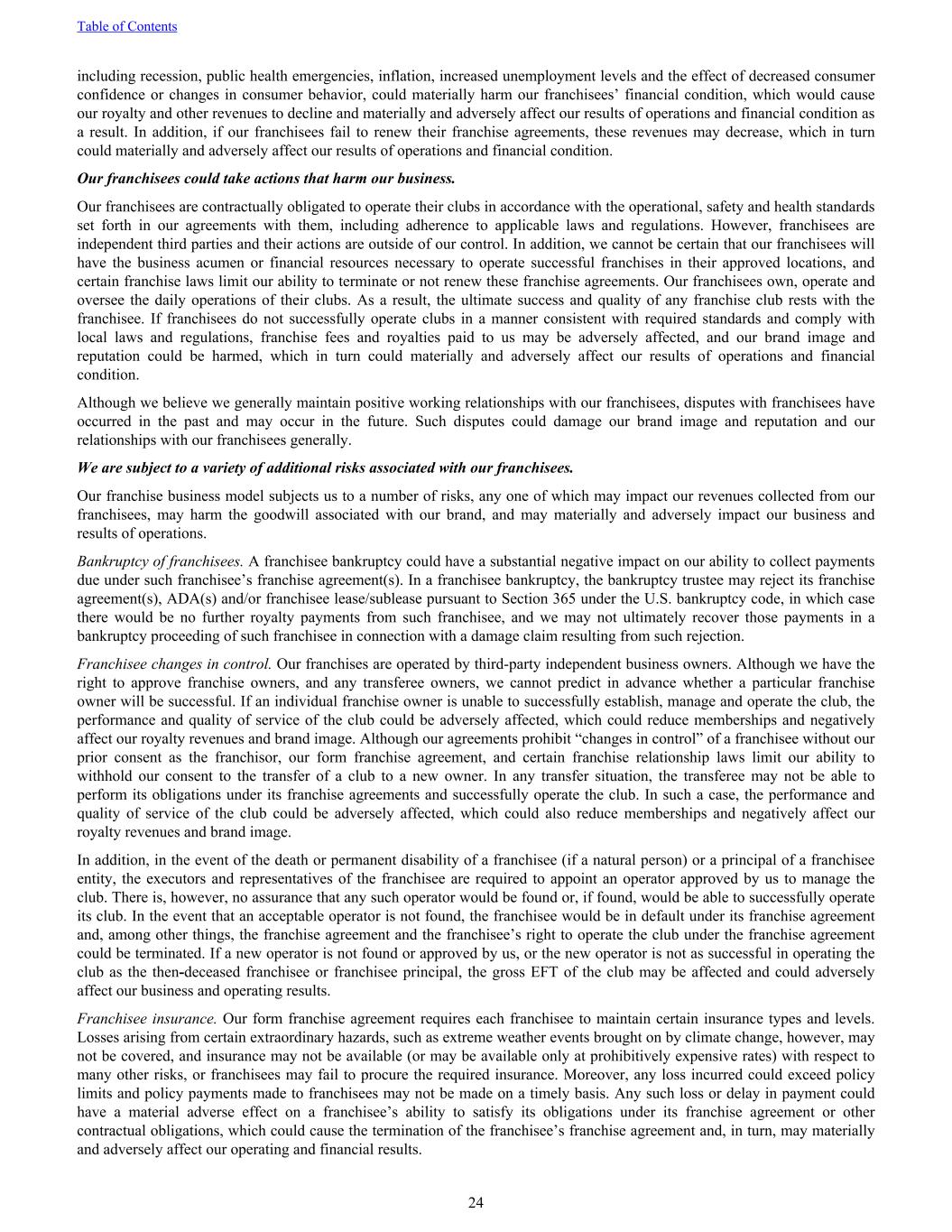 including recession, public health emergencies, inflation, increased unemployment levels and the effect of decreased consumer confidence or changes in consumer behavior, could materially harm our franchisees’ financial condition, which would cause our royalty and other revenues to decline and materially and adversely affect our results of operations and financial condition as a result. In addition, if our franchisees fail to renew their franchise agreements, these revenues may decrease, which in turn could materially and adversely affect our results of operations and financial condition. Our franchisees could take actions that harm our business. Our franchisees are contractually obligated to operate their clubs in accordance with the operational, safety and health standards set forth in our agreements with them, including adherence to applicable laws and regulations. However, franchisees are independent third parties and their actions are outside of our control. In addition, we cannot be certain that our franchisees will have the business acumen or financial resources necessary to operate successful franchises in their approved locations, and certain franchise laws limit our ability to terminate or not renew these franchise agreements. Our franchisees own, operate and oversee the daily operations of their clubs. As a result, the ultimate success and quality of any franchise club rests with the franchisee. If franchisees do not successfully operate clubs in a manner consistent with required standards and comply with local laws and regulations, franchise fees and royalties paid to us may be adversely affected, and our brand image and reputation could be harmed, which in turn could materially and adversely affect our results of operations and financial condition. Although we believe we generally maintain positive working relationships with our franchisees, disputes with franchisees have occurred in the past and may occur in the future. Such disputes could damage our brand image and reputation and our relationships with our franchisees generally. We are subject to a variety of additional risks associated with our franchisees. Our franchise business model subjects us to a number of risks, any one of which may impact our revenues collected from our franchisees, may harm the goodwill associated with our brand, and may materially and adversely impact our business and results of operations. Bankruptcy of franchisees. A franchisee bankruptcy could have a substantial negative impact on our ability to collect payments due under such franchisee’s franchise agreement(s). In a franchisee bankruptcy, the bankruptcy trustee may reject its franchise agreement(s), ADA(s) and/or franchisee lease/sublease pursuant to Section 365 under the U.S. bankruptcy code, in which case there would be no further royalty payments from such franchisee, and we may not ultimately recover those payments in a bankruptcy proceeding of such franchisee in connection with a damage claim resulting from such rejection. Franchisee changes in control. Our franchises are operated by third-party independent business owners. Although we have the right to approve franchise owners, and any transferee owners, we cannot predict in advance whether a particular franchise owner will be successful. If an individual franchise owner is unable to successfully establish, manage and operate the club, the performance and quality of service of the club could be adversely affected, which could reduce memberships and negatively affect our royalty revenues and brand image. Although our agreements prohibit “changes in control” of a franchisee without our prior consent as the franchisor, our form franchise agreement, and certain franchise relationship laws limit our ability to withhold our consent to the transfer of a club to a new owner. In any transfer situation, the transferee may not be able to perform its obligations under its franchise agreements and successfully operate the club. In such a case, the performance and quality of service of the club could be adversely affected, which could also reduce memberships and negatively affect our royalty revenues and brand image. In addition, in the event of the death or permanent disability of a franchisee (if a natural person) or a principal of a franchisee entity, the executors and representatives of the franchisee are required to appoint an operator approved by us to manage the club. There is, however, no assurance that any such operator would be found or, if found, would be able to successfully operate its club. In the event that an acceptable operator is not found, the franchisee would be in default under its franchise agreement and, among other things, the franchise agreement and the franchisee’s right to operate the club under the franchise agreement could be terminated. If a new operator is not found or approved by us, or the new operator is not as successful in operating the club as the then-deceased franchisee or franchisee principal, the gross EFT of the club may be affected and could adversely affect our business and operating results. Franchisee insurance. Our form franchise agreement requires each franchisee to maintain certain insurance types and levels. Losses arising from certain extraordinary hazards, such as extreme weather events brought on by climate change, however, may not be covered, and insurance may not be available (or may be available only at prohibitively expensive rates) with respect to many other risks, or franchisees may fail to procure the required insurance. Moreover, any loss incurred could exceed policy limits and policy payments made to franchisees may not be made on a timely basis. Any such loss or delay in payment could have a material adverse effect on a franchisee’s ability to satisfy its obligations under its franchise agreement or other contractual obligations, which could cause the termination of the franchisee’s franchise agreement and, in turn, may mat
