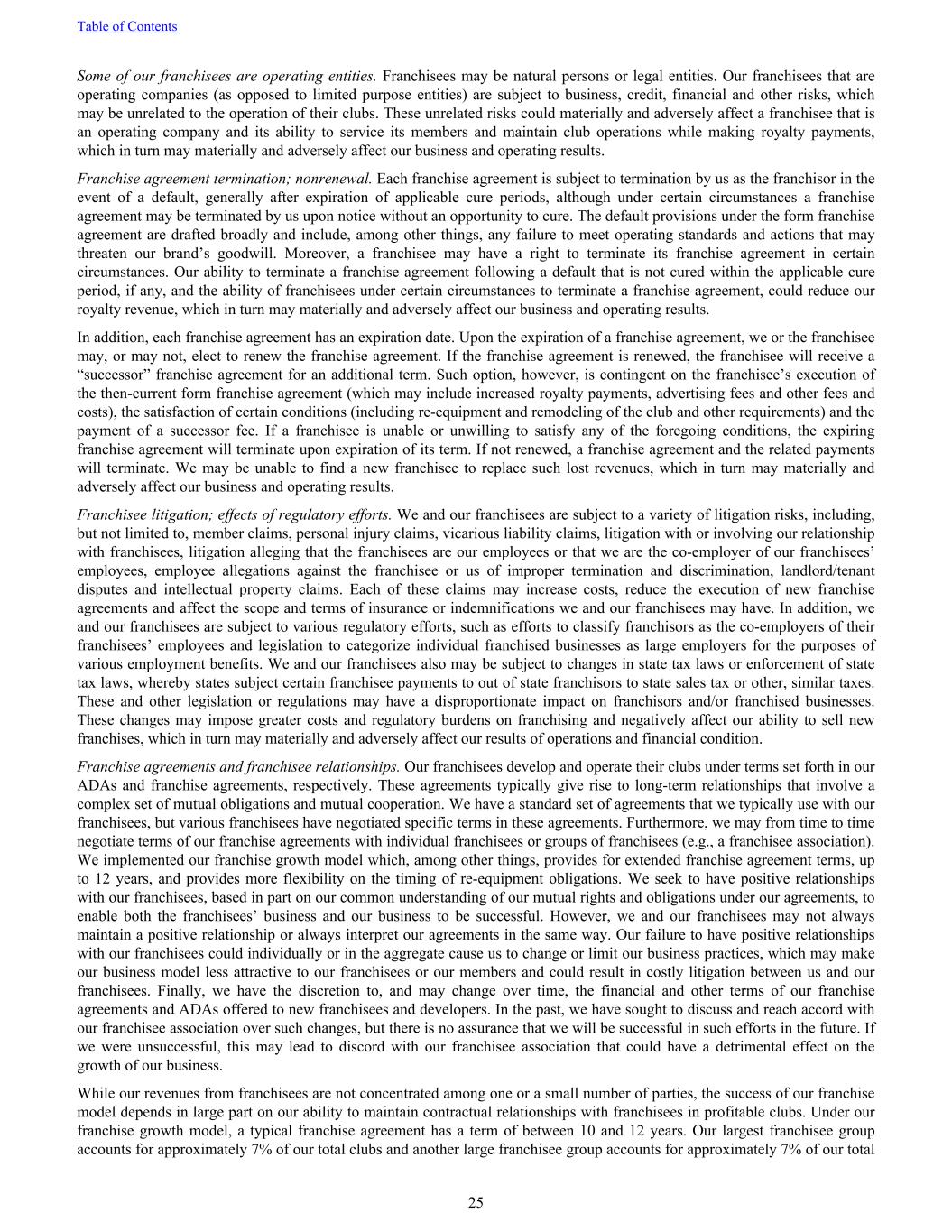 Some of our franchisees are operating entities. Franchisees may be natural persons or legal entities. Our franchisees that are operating companies (as opposed to limited purpose entities) are subject to business, credit, financial and other risks, which may be unrelated to the operation of their clubs. These unrelated risks could materially and adversely affect a franchisee that is an operating company and its ability to service its members and maintain club operations while making royalty payments, which in turn may materially and adversely affect our business and operating results. Franchise agreement termination; nonrenewal. Each franchise agreement is subject to termination by us as the franchisor in the event of a default, generally after expiration of applicable cure periods, although under certain circumstances a franchise agreement may be terminated by us upon notice without an opportunity to cure. The default provisions under the form franchise agreement are drafted broadly and include, among other things, any failure to meet operating standards and actions that may threaten our brand’s goodwill. Moreover, a franchisee may have a right to terminate its franchise agreement in certain circumstances. Our ability to terminate a franchise agreement following a default that is not cured within the applicable cure period, if any, and the ability of franchisees under certain circumstances to terminate a franchise agreement, could reduce our royalty revenue, which in turn may materially and adversely affect our business and operating results. In addition, each franchise agreement has an expiration date. Upon the expiration of a franchise agreement, we or the franchisee may, or may not, elect to renew the franchise agreement. If the franchise agreement is renewed, the franchisee will receive a “successor” franchise agreement for an additional term. Such option, however, is contingent on the franchisee’s execution of the then-current form franchise agreement (which may include increased royalty payments, advertising fees and other fees and costs), the satisfaction of certain conditions (including re-equipment and remodeling of the club and other requirements) and the payment of a successor fee. If a franchisee is unable or unwilling to satisfy any of the foregoing conditions, the expiring franchise agreement will terminate upon expiration of its term. If not renewed, a franchise agreement and the related payments will terminate. We may be unable to find a new franchisee to replace such lost revenues, which in turn may materially and adversely affect our business and operating results. Franchisee litigation; effects of regulatory efforts. We and our franchisees are subject to a variety of litigation risks, including, but not limited to, member claims, personal injury claims, vicarious liability claims, litigation with or involving our relationship with franchisees, litigation alleging that the franchisees are our employees or that we are the co-employer of our franchisees’ employees, employee allegations against the franchisee or us of improper termination and discrimination, landlord/tenant disputes and intellectual property claims. Each of these claims may increase costs, reduce the execution of new franchise agreements and affect the scope and terms of insurance or indemnifications we and our franchisees may have. In addition, we and our franchisees are subject to various regulatory efforts, such as efforts to classify franchisors as the co-employers of their franchisees’ employees and legislation to categorize individual franchised businesses as large employers for the purposes of various employment benefits. We and our franchisees also may be subject to changes in state tax laws or enforcement of state tax laws, whereby states subject certain franchisee payments to out of state franchisors to state sales tax or other, similar taxes. These and other legislation or regulations may have a disproportionate impact on franchisors and/or franchised businesses. These changes may impose greater costs and regulatory burdens on franchising and negatively affect our ability to sell new franchises, which in turn may materially and adversely affect our results of operations and financial condition. Franchise agreements and franchisee relationships. Our franchisees develop and operate their clubs under terms set forth in our ADAs and franchise agreements, respectively. These agreements typically give rise to long-term relationships that involve a complex set of mutual obligations and mutual cooperation. We have a standard set of agreements that we typically use with our franchisees, but various franchisees have negotiated specific terms in these agreements. Furthermore, we may from time to time negotiate terms of our franchise agreements with individual franchisees or groups of franchisees (e.g., a franchisee association). We implemented our franchise growth model which, among other things, provides for extended franchise agreement terms, up to 12 years, and provides more flexibility on the timing of re-equipment obligations. We seek to have positive relationships with our franchisees, based in part on our common understanding of our mutual rights and obligations under our agreements, to enable both the franchisees’ business and our business to be successful. However, we and our franchisees may not always maintain a positive relationship or always interpret our agreements in the same way. Our failure to have positive relationships with our franchisees could individually or in the aggregate cause us to change or limit our business practices, which may make our business model less attractive to our franchisees or our members and could result in costly litigation between us and our franchisees. Finally, we have the discretion to, and may change over time, the financial and other terms of our franchise agreements and ADAs offered to new franchisees and developers. In the past, we have sough