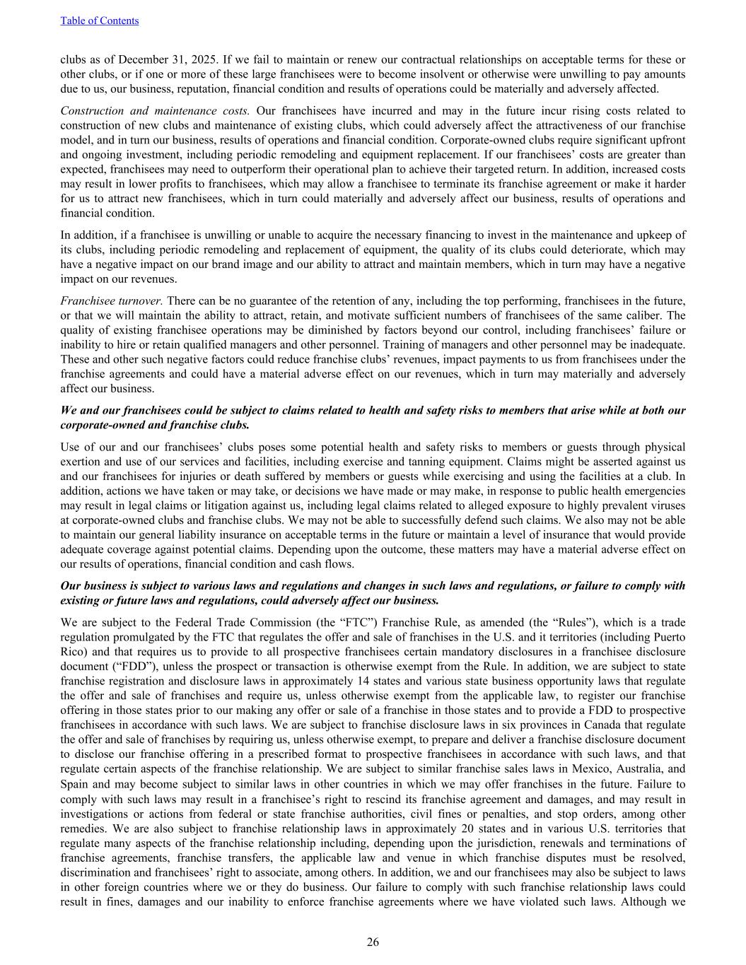 clubs as of December 31, 2025. If we fail to maintain or renew our contractual relationships on acceptable terms for these or other clubs, or if one or more of these large franchisees were to become insolvent or otherwise were unwilling to pay amounts due to us, our business, reputation, financial condition and results of operations could be materially and adversely affected. Construction and maintenance costs. Our franchisees have incurred and may in the future incur rising costs related to construction of new clubs and maintenance of existing clubs, which could adversely affect the attractiveness of our franchise model, and in turn our business, results of operations and financial condition. Corporate-owned clubs require significant upfront and ongoing investment, including periodic remodeling and equipment replacement. If our franchisees’ costs are greater than expected, franchisees may need to outperform their operational plan to achieve their targeted return. In addition, increased costs may result in lower profits to franchisees, which may allow a franchisee to terminate its franchise agreement or make it harder for us to attract new franchisees, which in turn could materially and adversely affect our business, results of operations and financial condition. In addition, if a franchisee is unwilling or unable to acquire the necessary financing to invest in the maintenance and upkeep of its clubs, including periodic remodeling and replacement of equipment, the quality of its clubs could deteriorate, which may have a negative impact on our brand image and our ability to attract and maintain members, which in turn may have a negative impact on our revenues. Franchisee turnover. There can be no guarantee of the retention of any, including the top performing, franchisees in the future, or that we will maintain the ability to attract, retain, and motivate sufficient numbers of franchisees of the same caliber. The quality of existing franchisee operations may be diminished by factors beyond our control, including franchisees’ failure or inability to hire or retain qualified managers and other personnel. Training of managers and other personnel may be inadequate. These and other such negative factors could reduce franchise clubs’ revenues, impact payments to us from franchisees under the franchise agreements and could have a material adverse effect on our revenues, which in turn may materially and adversely affect our business. We and our franchisees could be subject to claims related to health and safety risks to members that arise while at both our corporate-owned and franchise clubs. Use of our and our franchisees’ clubs poses some potential health and safety risks to members or guests through physical exertion and use of our services and facilities, including exercise and tanning equipment. Claims might be asserted against us and our franchisees for injuries or death suffered by members or guests while exercising and using the facilities at a club. In addition, actions we have taken or may take, or decisions we have made or may make, in response to public health emergencies may result in legal claims or litigation against us, including legal claims related to alleged exposure to highly prevalent viruses at corporate-owned clubs and franchise clubs. We may not be able to successfully defend such claims. We also may not be able to maintain our general liability insurance on acceptable terms in the future or maintain a level of insurance that would provide adequate coverage against potential claims. Depending upon the outcome, these matters may have a material adverse effect on our results of operations, financial condition and cash flows. Our business is subject to various laws and regulations and changes in such laws and regulations, or failure to comply with existing or future laws and regulations, could adversely affect our business. We are subject to the Federal Trade Commission (the “FTC”) Franchise Rule, as amended (the “Rules”), which is a trade regulation promulgated by the FTC that regulates the offer and sale of franchises in the U.S. and it territories (including Puerto Rico) and that requires us to provide to all prospective franchisees certain mandatory disclosures in a franchisee disclosure document (“FDD”), unless the prospect or transaction is otherwise exempt from the Rule. In addition, we are subject to state franchise registration and disclosure laws in approximately 14 states and various state business opportunity laws that regulate the offer and sale of franchises and require us, unless otherwise exempt from the applicable law, to register our franchise offering in those states prior to our making any offer or sale of a franchise in those states and to provide a FDD to prospective franchisees in accordance with such laws. We are subject to franchise disclosure laws in six provinces in Canada that regulate the offer and sale of franchises by requiring us, unless otherwise exempt, to prepare and deliver a franchise disclosure document to disclose our franchise offering in a prescribed format to prospective franchisees in accordance with such laws, and that regulate certain aspects of the franchise relationship. We are subject to similar franchise sales laws in Mexico, Australia, and Spain and may become subject to similar laws in other countries in which we may offer franchises in the future. Failure to comply with such laws may result in a franchisee’s right to rescind its franchise agreement and damages, and may result in investigations or actions from federal or state franchise authorities, civil fines or penalties, and stop orders, among other remedies. We are also subject to franchise relationship laws in approximately 20 states and in various U.S. territories that regulate many aspects of the franchise relationship including, depending upon the jurisdiction, renewals and terminations of franchise agreements, franchise transfers, the applicabl