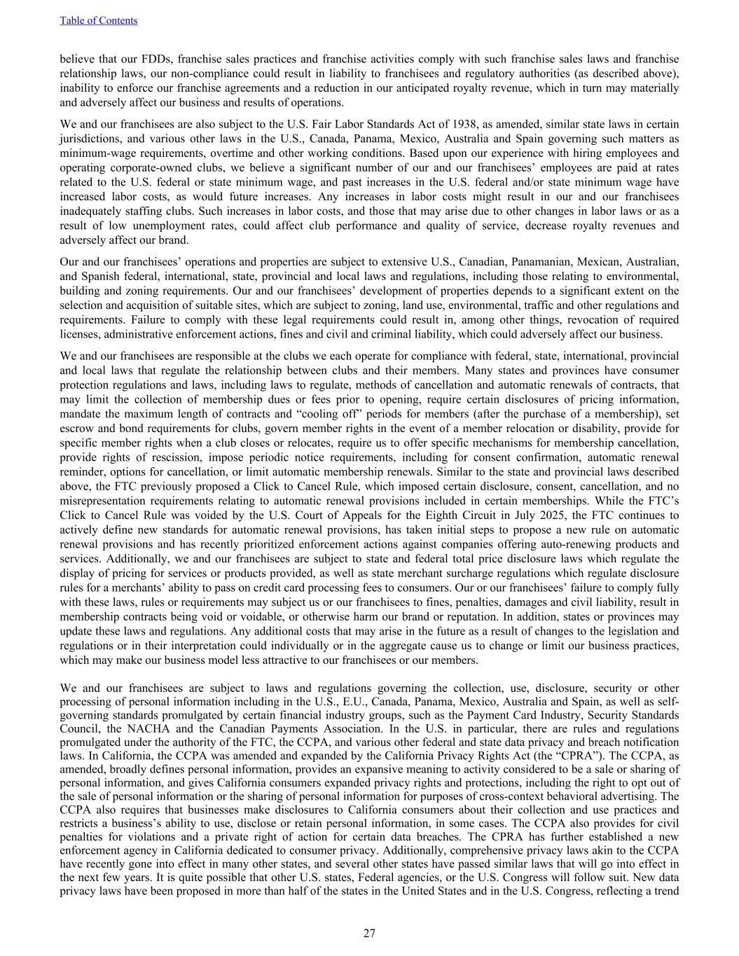 believe that our FDDs, franchise sales practices and franchise activities comply with such franchise sales laws and franchise relationship laws, our non-compliance could result in liability to franchisees and regulatory authorities (as described above), inability to enforce our franchise agreements and a reduction in our anticipated royalty revenue, which in turn may materially and adversely affect our business and results of operations. We and our franchisees are also subject to the U.S. Fair Labor Standards Act of 1938, as amended, similar state laws in certain jurisdictions, and various other laws in the U.S., Canada, Panama, Mexico, Australia and Spain governing such matters as minimum-wage requirements, overtime and other working conditions. Based upon our experience with hiring employees and operating corporate-owned clubs, we believe a significant number of our and our franchisees’ employees are paid at rates related to the U.S. federal or state minimum wage, and past increases in the U.S. federal and/or state minimum wage have increased labor costs, as would future increases. Any increases in labor costs might result in our and our franchisees inadequately staffing clubs. Such increases in labor costs, and those that may arise due to other changes in labor laws or as a result of low unemployment rates, could affect club performance and quality of service, decrease royalty revenues and adversely affect our brand. Our and our franchisees’ operations and properties are subject to extensive U.S., Canadian, Panamanian, Mexican, Australian, and Spanish federal, international, state, provincial and local laws and regulations, including those relating to environmental, building and zoning requirements. Our and our franchisees’ development of properties depends to a significant extent on the selection and acquisition of suitable sites, which are subject to zoning, land use, environmental, traffic and other regulations and requirements. Failure to comply with these legal requirements could result in, among other things, revocation of required licenses, administrative enforcement actions, fines and civil and criminal liability, which could adversely affect our business. We and our franchisees are responsible at the clubs we each operate for compliance with federal, state, international, provincial and local laws that regulate the relationship between clubs and their members. Many states and provinces have consumer protection regulations and laws, including laws to regulate, methods of cancellation and automatic renewals of contracts, that may limit the collection of membership dues or fees prior to opening, require certain disclosures of pricing information, mandate the maximum length of contracts and “cooling off” periods for members (after the purchase of a membership), set escrow and bond requirements for clubs, govern member rights in the event of a member relocation or disability, provide for specific member rights when a club closes or relocates, require us to offer specific mechanisms for membership cancellation, provide rights of rescission, impose periodic notice requirements, including for consent confirmation, automatic renewal reminder, options for cancellation, or limit automatic membership renewals. Similar to the state and provincial laws described above, the FTC previously proposed a Click to Cancel Rule, which imposed certain disclosure, consent, cancellation, and no misrepresentation requirements relating to automatic renewal provisions included in certain memberships. While the FTC’s Click to Cancel Rule was voided by the U.S. Court of Appeals for the Eighth Circuit in July 2025, the FTC continues to actively define new standards for automatic renewal provisions, has taken initial steps to propose a new rule on automatic renewal provisions and has recently prioritized enforcement actions against companies offering auto-renewing products and services. Additionally, we and our franchisees are subject to state and federal total price disclosure laws which regulate the display of pricing for services or products provided, as well as state merchant surcharge regulations which regulate disclosure rules for a merchants’ ability to pass on credit card processing fees to consumers. Our or our franchisees’ failure to comply fully with these laws, rules or requirements may subject us or our franchisees to fines, penalties, damages and civil liability, result in membership contracts being void or voidable, or otherwise harm our brand or reputation. In addition, states or provinces may update these laws and regulations. Any additional costs that may arise in the future as a result of changes to the legislation and regulations or in their interpretation could individually or in the aggregate cause us to change or limit our business practices, which may make our business model less attractive to our franchisees or our members. We and our franchisees are subject to laws and regulations governing the collection, use, disclosure, security or other processing of personal information including in the U.S., E.U., Canada, Panama, Mexico, Australia and Spain, as well as self- governing standards promulgated by certain financial industry groups, such as the Payment Card Industry, Security Standards Council, the NACHA and the Canadian Payments Association. In the U.S. in particular, there are rules and regulations promulgated under the authority of the FTC, the CCPA, and various other federal and state data privacy and breach notification laws. In California, the CCPA was amended and expanded by the California Privacy Rights Act (the “CPRA”). The CCPA, as amended, broadly defines personal information, provides an expansive meaning to activity considered to be a sale or sharing of personal information, and gives California consumers expanded privacy rights and protections, including the right to opt out of the sale of personal information or the sharing of personal information 