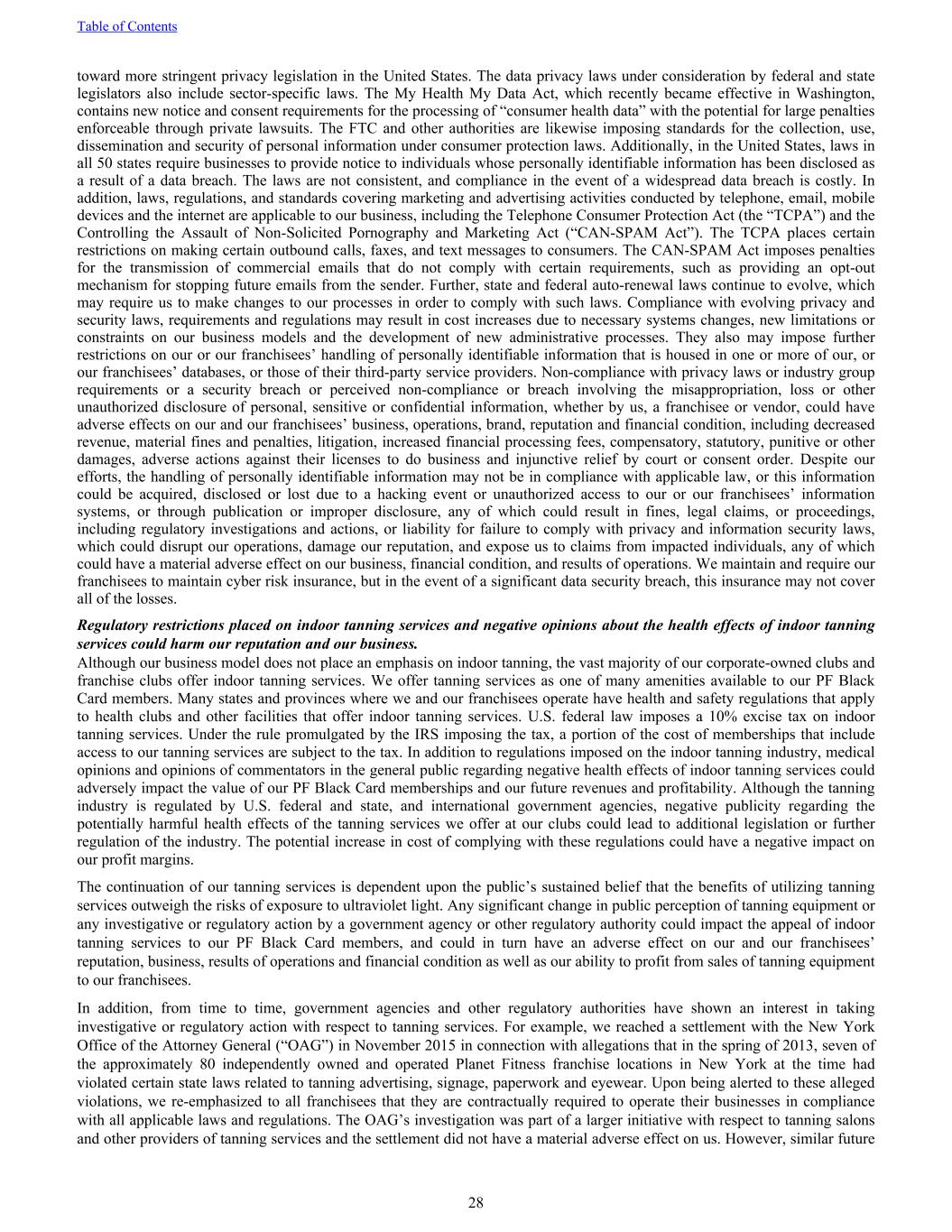toward more stringent privacy legislation in the United States. The data privacy laws under consideration by federal and state legislators also include sector-specific laws. The My Health My Data Act, which recently became effective in Washington, contains new notice and consent requirements for the processing of “consumer health data” with the potential for large penalties enforceable through private lawsuits. The FTC and other authorities are likewise imposing standards for the collection, use, dissemination and security of personal information under consumer protection laws. Additionally, in the United States, laws in all 50 states require businesses to provide notice to individuals whose personally identifiable information has been disclosed as a result of a data breach. The laws are not consistent, and compliance in the event of a widespread data breach is costly. In addition, laws, regulations, and standards covering marketing and advertising activities conducted by telephone, email, mobile devices and the internet are applicable to our business, including the Telephone Consumer Protection Act (the “TCPA”) and the Controlling the Assault of Non-Solicited Pornography and Marketing Act (“CAN-SPAM Act”). The TCPA places certain restrictions on making certain outbound calls, faxes, and text messages to consumers. The CAN-SPAM Act imposes penalties for the transmission of commercial emails that do not comply with certain requirements, such as providing an opt-out mechanism for stopping future emails from the sender. Further, state and federal auto-renewal laws continue to evolve, which may require us to make changes to our processes in order to comply with such laws. Compliance with evolving privacy and security laws, requirements and regulations may result in cost increases due to necessary systems changes, new limitations or constraints on our business models and the development of new administrative processes. They also may impose further restrictions on our or our franchisees’ handling of personally identifiable information that is housed in one or more of our, or our franchisees’ databases, or those of their third-party service providers. Non-compliance with privacy laws or industry group requirements or a security breach or perceived non-compliance or breach involving the misappropriation, loss or other unauthorized disclosure of personal, sensitive or confidential information, whether by us, a franchisee or vendor, could have adverse effects on our and our franchisees’ business, operations, brand, reputation and financial condition, including decreased revenue, material fines and penalties, litigation, increased financial processing fees, compensatory, statutory, punitive or other damages, adverse actions against their licenses to do business and injunctive relief by court or consent order. Despite our efforts, the handling of personally identifiable information may not be in compliance with applicable law, or this information could be acquired, disclosed or lost due to a hacking event or unauthorized access to our or our franchisees’ information systems, or through publication or improper disclosure, any of which could result in fines, legal claims, or proceedings, including regulatory investigations and actions, or liability for failure to comply with privacy and information security laws, which could disrupt our operations, damage our reputation, and expose us to claims from impacted individuals, any of which could have a material adverse effect on our business, financial condition, and results of operations. We maintain and require our franchisees to maintain cyber risk insurance, but in the event of a significant data security breach, this insurance may not cover all of the losses. Regulatory restrictions placed on indoor tanning services and negative opinions about the health effects of indoor tanning services could harm our reputation and our business. Although our business model does not place an emphasis on indoor tanning, the vast majority of our corporate-owned clubs and franchise clubs offer indoor tanning services. We offer tanning services as one of many amenities available to our PF Black Card members. Many states and provinces where we and our franchisees operate have health and safety regulations that apply to health clubs and other facilities that offer indoor tanning services. U.S. federal law imposes a 10% excise tax on indoor tanning services. Under the rule promulgated by the IRS imposing the tax, a portion of the cost of memberships that include access to our tanning services are subject to the tax. In addition to regulations imposed on the indoor tanning industry, medical opinions and opinions of commentators in the general public regarding negative health effects of indoor tanning services could adversely impact the value of our PF Black Card memberships and our future revenues and profitability. Although the tanning industry is regulated by U.S. federal and state, and international government agencies, negative publicity regarding the potentially harmful health effects of the tanning services we offer at our clubs could lead to additional legislation or further regulation of the industry. The potential increase in cost of complying with these regulations could have a negative impact on our profit margins. The continuation of our tanning services is dependent upon the public’s sustained belief that the benefits of utilizing tanning services outweigh the risks of exposure to ultraviolet light. Any significant change in public perception of tanning equipment or any investigative or regulatory action by a government agency or other regulatory authority could impact the appeal of indoor tanning services to our PF Black Card members, and could in turn have an adverse effect on our and our franchisees’ reputation, business, results of operations and financial condition as well as our ability to profit from sales of tanning equipment to o