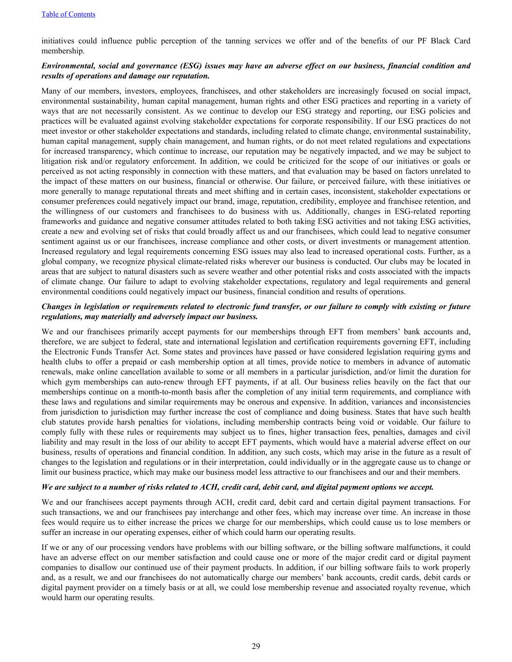 initiatives could influence public perception of the tanning services we offer and of the benefits of our PF Black Card membership. Environmental, social and governance (ESG) issues may have an adverse effect on our business, financial condition and results of operations and damage our reputation. Many of our members, investors, employees, franchisees, and other stakeholders are increasingly focused on social impact, environmental sustainability, human capital management, human rights and other ESG practices and reporting in a variety of ways that are not necessarily consistent. As we continue to develop our ESG strategy and reporting, our ESG policies and practices will be evaluated against evolving stakeholder expectations for corporate responsibility. If our ESG practices do not meet investor or other stakeholder expectations and standards, including related to climate change, environmental sustainability, human capital management, supply chain management, and human rights, or do not meet related regulations and expectations for increased transparency, which continue to increase, our reputation may be negatively impacted, and we may be subject to litigation risk and/or regulatory enforcement. In addition, we could be criticized for the scope of our initiatives or goals or perceived as not acting responsibly in connection with these matters, and that evaluation may be based on factors unrelated to the impact of these matters on our business, financial or otherwise. Our failure, or perceived failure, with these initiatives or more generally to manage reputational threats and meet shifting and in certain cases, inconsistent, stakeholder expectations or consumer preferences could negatively impact our brand, image, reputation, credibility, employee and franchisee retention, and the willingness of our customers and franchisees to do business with us. Additionally, changes in ESG-related reporting frameworks and guidance and negative consumer attitudes related to both taking ESG activities and not taking ESG activities, create a new and evolving set of risks that could broadly affect us and our franchisees, which could lead to negative consumer sentiment against us or our franchisees, increase compliance and other costs, or divert investments or management attention. Increased regulatory and legal requirements concerning ESG issues may also lead to increased operational costs. Further, as a global company, we recognize physical climate-related risks wherever our business is conducted. Our clubs may be located in areas that are subject to natural disasters such as severe weather and other potential risks and costs associated with the impacts of climate change. Our failure to adapt to evolving stakeholder expectations, regulatory and legal requirements and general environmental conditions could negatively impact our business, financial condition and results of operations. Changes in legislation or requirements related to electronic fund transfer, or our failure to comply with existing or future regulations, may materially and adversely impact our business. We and our franchisees primarily accept payments for our memberships through EFT from members’ bank accounts and, therefore, we are subject to federal, state and international legislation and certification requirements governing EFT, including the Electronic Funds Transfer Act. Some states and provinces have passed or have considered legislation requiring gyms and health clubs to offer a prepaid or cash membership option at all times, provide notice to members in advance of automatic renewals, make online cancellation available to some or all members in a particular jurisdiction, and/or limit the duration for which gym memberships can auto-renew through EFT payments, if at all. Our business relies heavily on the fact that our memberships continue on a month-to-month basis after the completion of any initial term requirements, and compliance with these laws and regulations and similar requirements may be onerous and expensive. In addition, variances and inconsistencies from jurisdiction to jurisdiction may further increase the cost of compliance and doing business. States that have such health club statutes provide harsh penalties for violations, including membership contracts being void or voidable. Our failure to comply fully with these rules or requirements may subject us to fines, higher transaction fees, penalties, damages and civil liability and may result in the loss of our ability to accept EFT payments, which would have a material adverse effect on our business, results of operations and financial condition. In addition, any such costs, which may arise in the future as a result of changes to the legislation and regulations or in their interpretation, could individually or in the aggregate cause us to change or limit our business practice, which may make our business model less attractive to our franchisees and our and their members. We are subject to a number of risks related to ACH, credit card, debit card, and digital payment options we accept. We and our franchisees accept payments through ACH, credit card, debit card and certain digital payment transactions. For such transactions, we and our franchisees pay interchange and other fees, which may increase over time. An increase in those fees would require us to either increase the prices we charge for our memberships, which could cause us to lose members or suffer an increase in our operating expenses, either of which could harm our operating results. If we or any of our processing vendors have problems with our billing software, or the billing software malfunctions, it could have an adverse effect on our member satisfaction and could cause one or more of the major credit card or digital payment companies to disallow our continued use of their payment products. In addition, if our billing software fails to work properly and, as a result, we and our franchisees do not automatical
