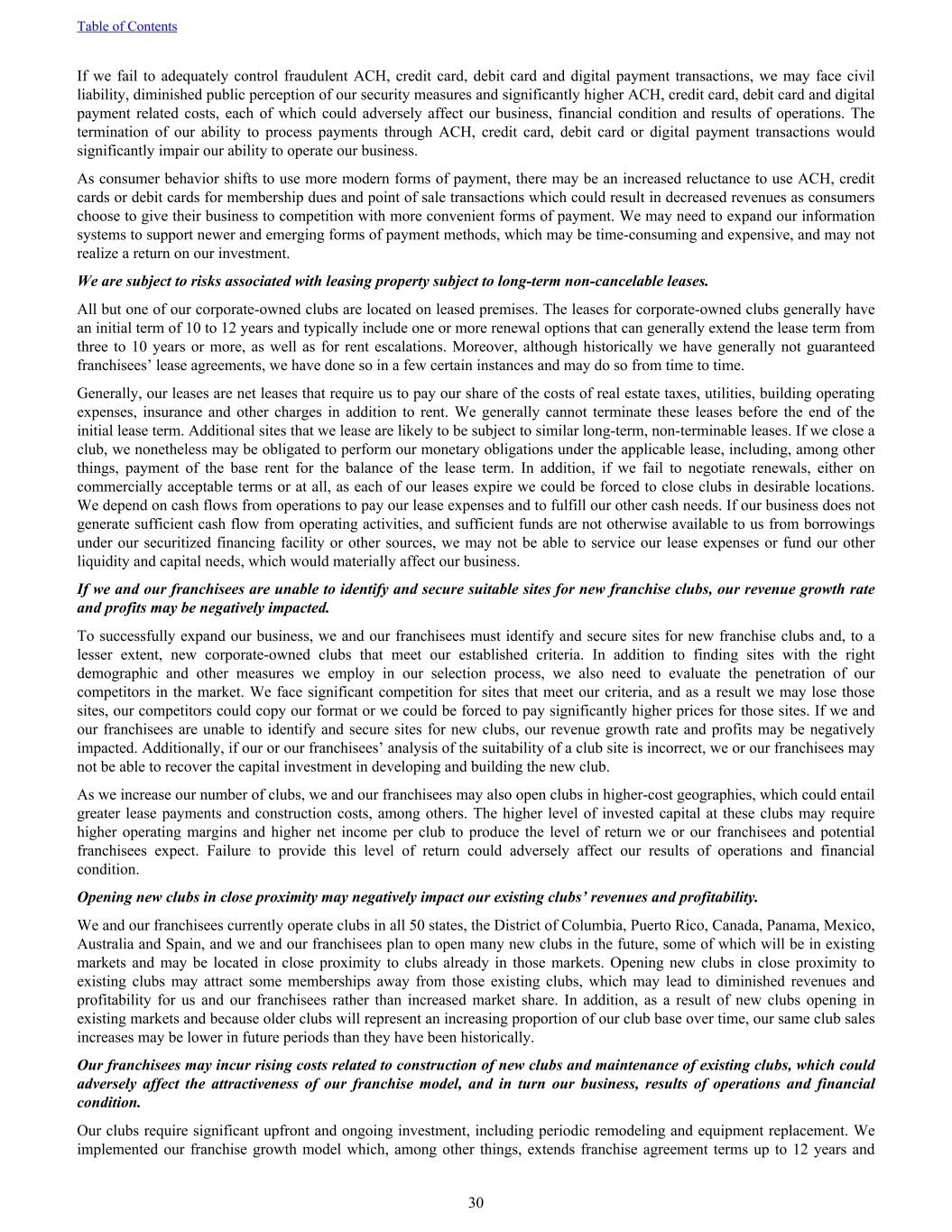 If we fail to adequately control fraudulent ACH, credit card, debit card and digital payment transactions, we may face civil liability, diminished public perception of our security measures and significantly higher ACH, credit card, debit card and digital payment related costs, each of which could adversely affect our business, financial condition and results of operations. The termination of our ability to process payments through ACH, credit card, debit card or digital payment transactions would significantly impair our ability to operate our business. As consumer behavior shifts to use more modern forms of payment, there may be an increased reluctance to use ACH, credit cards or debit cards for membership dues and point of sale transactions which could result in decreased revenues as consumers choose to give their business to competition with more convenient forms of payment. We may need to expand our information systems to support newer and emerging forms of payment methods, which may be time-consuming and expensive, and may not realize a return on our investment. We are subject to risks associated with leasing property subject to long-term non-cancelable leases. All but one of our corporate-owned clubs are located on leased premises. The leases for corporate-owned clubs generally have an initial term of 10 to 12 years and typically include one or more renewal options that can generally extend the lease term from three to 10 years or more, as well as for rent escalations. Moreover, although historically we have generally not guaranteed franchisees’ lease agreements, we have done so in a few certain instances and may do so from time to time. Generally, our leases are net leases that require us to pay our share of the costs of real estate taxes, utilities, building operating expenses, insurance and other charges in addition to rent. We generally cannot terminate these leases before the end of the initial lease term. Additional sites that we lease are likely to be subject to similar long-term, non-terminable leases. If we close a club, we nonetheless may be obligated to perform our monetary obligations under the applicable lease, including, among other things, payment of the base rent for the balance of the lease term. In addition, if we fail to negotiate renewals, either on commercially acceptable terms or at all, as each of our leases expire we could be forced to close clubs in desirable locations. We depend on cash flows from operations to pay our lease expenses and to fulfill our other cash needs. If our business does not generate sufficient cash flow from operating activities, and sufficient funds are not otherwise available to us from borrowings under our securitized financing facility or other sources, we may not be able to service our lease expenses or fund our other liquidity and capital needs, which would materially affect our business. If we and our franchisees are unable to identify and secure suitable sites for new franchise clubs, our revenue growth rate and profits may be negatively impacted. To successfully expand our business, we and our franchisees must identify and secure sites for new franchise clubs and, to a lesser extent, new corporate-owned clubs that meet our established criteria. In addition to finding sites with the right demographic and other measures we employ in our selection process, we also need to evaluate the penetration of our competitors in the market. We face significant competition for sites that meet our criteria, and as a result we may lose those sites, our competitors could copy our format or we could be forced to pay significantly higher prices for those sites. If we and our franchisees are unable to identify and secure sites for new clubs, our revenue growth rate and profits may be negatively impacted. Additionally, if our or our franchisees’ analysis of the suitability of a club site is incorrect, we or our franchisees may not be able to recover the capital investment in developing and building the new club. As we increase our number of clubs, we and our franchisees may also open clubs in higher-cost geographies, which could entail greater lease payments and construction costs, among others. The higher level of invested capital at these clubs may require higher operating margins and higher net income per club to produce the level of return we or our franchisees and potential franchisees expect. Failure to provide this level of return could adversely affect our results of operations and financial condition. Opening new clubs in close proximity may negatively impact our existing clubs’ revenues and profitability. We and our franchisees currently operate clubs in all 50 states, the District of Columbia, Puerto Rico, Canada, Panama, Mexico, Australia and Spain, and we and our franchisees plan to open many new clubs in the future, some of which will be in existing markets and may be located in close proximity to clubs already in those markets. Opening new clubs in close proximity to existing clubs may attract some memberships away from those existing clubs, which may lead to diminished revenues and profitability for us and our franchisees rather than increased market share. In addition, as a result of new clubs opening in existing markets and because older clubs will represent an increasing proportion of our club base over time, our same club sales increases may be lower in future periods than they have been historically. Our franchisees may incur rising costs related to construction of new clubs and maintenance of existing clubs, which could adversely affect the attractiveness of our franchise model, and in turn our business, results of operations and financial condition. Our clubs require significant upfront and ongoing investment, including periodic remodeling and equipment replacement. We implemented our franchise growth model which, among other things, extends franchise agreement terms up to 12 years and Table of Contents 30