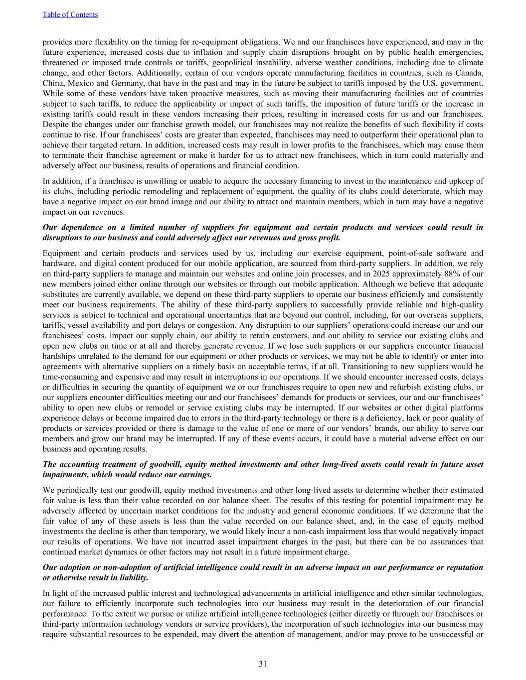 provides more flexibility on the timing for re-equipment obligations. We and our franchisees have experienced, and may in the future experience, increased costs due to inflation and supply chain disruptions brought on by public health emergencies, threatened or imposed trade controls or tariffs, geopolitical instability, adverse weather conditions, including due to climate change, and other factors. Additionally, certain of our vendors operate manufacturing facilities in countries, such as Canada, China, Mexico and Germany, that have in the past and may in the future be subject to tariffs imposed by the U.S. government. While some of these vendors have taken proactive measures, such as moving their manufacturing facilities out of countries subject to such tariffs, to reduce the applicability or impact of such tariffs, the imposition of future tariffs or the increase in existing tariffs could result in these vendors increasing their prices, resulting in increased costs for us and our franchisees. Despite the changes under our franchise growth model, our franchisees may not realize the benefits of such flexibility if costs continue to rise. If our franchisees’ costs are greater than expected, franchisees may need to outperform their operational plan to achieve their targeted return. In addition, increased costs may result in lower profits to the franchisees, which may cause them to terminate their franchise agreement or make it harder for us to attract new franchisees, which in turn could materially and adversely affect our business, results of operations and financial condition. In addition, if a franchisee is unwilling or unable to acquire the necessary financing to invest in the maintenance and upkeep of its clubs, including periodic remodeling and replacement of equipment, the quality of its clubs could deteriorate, which may have a negative impact on our brand image and our ability to attract and maintain members, which in turn may have a negative impact on our revenues. Our dependence on a limited number of suppliers for equipment and certain products and services could result in disruptions to our business and could adversely affect our revenues and gross profit. Equipment and certain products and services used by us, including our exercise equipment, point-of-sale software and hardware, and digital content produced for our mobile application, are sourced from third-party suppliers. In addition, we rely on third-party suppliers to manage and maintain our websites and online join processes, and in 2025 approximately 88% of our new members joined either online through our websites or through our mobile application. Although we believe that adequate substitutes are currently available, we depend on these third-party suppliers to operate our business efficiently and consistently meet our business requirements. The ability of these third-party suppliers to successfully provide reliable and high-quality services is subject to technical and operational uncertainties that are beyond our control, including, for our overseas suppliers, tariffs, vessel availability and port delays or congestion. Any disruption to our suppliers’ operations could increase our and our franchisees’ costs, impact our supply chain, our ability to retain customers, and our ability to service our existing clubs and open new clubs on time or at all and thereby generate revenue. If we lose such suppliers or our suppliers encounter financial hardships unrelated to the demand for our equipment or other products or services, we may not be able to identify or enter into agreements with alternative suppliers on a timely basis on acceptable terms, if at all. Transitioning to new suppliers would be time-consuming and expensive and may result in interruptions in our operations. If we should encounter increased costs, delays or difficulties in securing the quantity of equipment we or our franchisees require to open new and refurbish existing clubs, or our suppliers encounter difficulties meeting our and our franchisees’ demands for products or services, our and our franchisees’ ability to open new clubs or remodel or service existing clubs may be interrupted. If our websites or other digital platforms experience delays or become impaired due to errors in the third-party technology or there is a deficiency, lack or poor quality of products or services provided or there is damage to the value of one or more of our vendors’ brands, our ability to serve our members and grow our brand may be interrupted. If any of these events occurs, it could have a material adverse effect on our business and operating results. The accounting treatment of goodwill, equity method investments and other long-lived assets could result in future asset impairments, which would reduce our earnings. We periodically test our goodwill, equity method investments and other long-lived assets to determine whether their estimated fair value is less than their value recorded on our balance sheet. The results of this testing for potential impairment may be adversely affected by uncertain market conditions for the industry and general economic conditions. If we determine that the fair value of any of these assets is less than the value recorded on our balance sheet, and, in the case of equity method investments the decline is other than temporary, we would likely incur a non-cash impairment loss that would negatively impact our results of operations. We have not incurred asset impairment charges in the past, but there can be no assurances that continued market dynamics or other factors may not result in a future impairment charge. Our adoption or non-adoption of artificial intelligence could result in an adverse impact on our performance or reputation or otherwise result in liability. In light of the increased public interest and technological advancements in artificial intelligence and other similar technologies, our failure to efficiently incorporate su