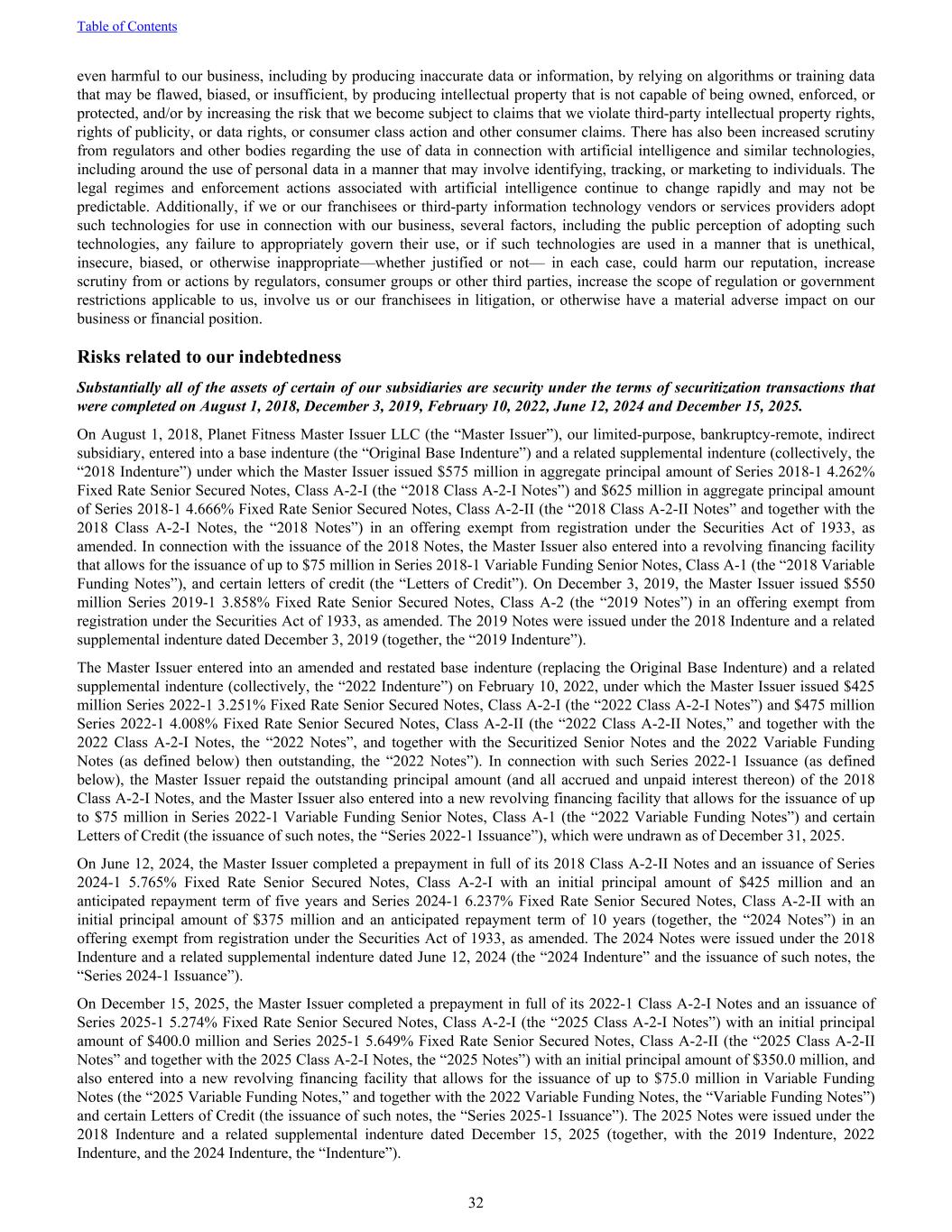 even harmful to our business, including by producing inaccurate data or information, by relying on algorithms or training data that may be flawed, biased, or insufficient, by producing intellectual property that is not capable of being owned, enforced, or protected, and/or by increasing the risk that we become subject to claims that we violate third-party intellectual property rights, rights of publicity, or data rights, or consumer class action and other consumer claims. There has also been increased scrutiny from regulators and other bodies regarding the use of data in connection with artificial intelligence and similar technologies, including around the use of personal data in a manner that may involve identifying, tracking, or marketing to individuals. The legal regimes and enforcement actions associated with artificial intelligence continue to change rapidly and may not be predictable. Additionally, if we or our franchisees or third-party information technology vendors or services providers adopt such technologies for use in connection with our business, several factors, including the public perception of adopting such technologies, any failure to appropriately govern their use, or if such technologies are used in a manner that is unethical, insecure, biased, or otherwise inappropriate—whether justified or not— in each case, could harm our reputation, increase scrutiny from or actions by regulators, consumer groups or other third parties, increase the scope of regulation or government restrictions applicable to us, involve us or our franchisees in litigation, or otherwise have a material adverse impact on our business or financial position. Risks related to our indebtedness Substantially all of the assets of certain of our subsidiaries are security under the terms of securitization transactions that were completed on August 1, 2018, December 3, 2019, February 10, 2022, June 12, 2024 and December 15, 2025. On August 1, 2018, Planet Fitness Master Issuer LLC (the “Master Issuer”), our limited-purpose, bankruptcy-remote, indirect subsidiary, entered into a base indenture (the “Original Base Indenture”) and a related supplemental indenture (collectively, the “2018 Indenture”) under which the Master Issuer issued $575 million in aggregate principal amount of Series 2018-1 4.262% Fixed Rate Senior Secured Notes, Class A-2-I (the “2018 Class A-2-I Notes”) and $625 million in aggregate principal amount of Series 2018-1 4.666% Fixed Rate Senior Secured Notes, Class A-2-II (the “2018 Class A-2-II Notes” and together with the 2018 Class A-2-I Notes, the “2018 Notes”) in an offering exempt from registration under the Securities Act of 1933, as amended. In connection with the issuance of the 2018 Notes, the Master Issuer also entered into a revolving financing facility that allows for the issuance of up to $75 million in Series 2018-1 Variable Funding Senior Notes, Class A-1 (the “2018 Variable Funding Notes”), and certain letters of credit (the “Letters of Credit”). On December 3, 2019, the Master Issuer issued $550 million Series 2019-1 3.858% Fixed Rate Senior Secured Notes, Class A-2 (the “2019 Notes”) in an offering exempt from registration under the Securities Act of 1933, as amended. The 2019 Notes were issued under the 2018 Indenture and a related supplemental indenture dated December 3, 2019 (together, the “2019 Indenture”). The Master Issuer entered into an amended and restated base indenture (replacing the Original Base Indenture) and a related supplemental indenture (collectively, the “2022 Indenture”) on February 10, 2022, under which the Master Issuer issued $425 million Series 2022-1 3.251% Fixed Rate Senior Secured Notes, Class A-2-I (the “2022 Class A-2-I Notes”) and $475 million Series 2022-1 4.008% Fixed Rate Senior Secured Notes, Class A-2-II (the “2022 Class A-2-II Notes,” and together with the 2022 Class A-2-I Notes, the “2022 Notes”, and together with the Securitized Senior Notes and the 2022 Variable Funding Notes (as defined below) then outstanding, the “2022 Notes”). In connection with such Series 2022-1 Issuance (as defined below), the Master Issuer repaid the outstanding principal amount (and all accrued and unpaid interest thereon) of the 2018 Class A-2-I Notes, and the Master Issuer also entered into a new revolving financing facility that allows for the issuance of up to $75 million in Series 2022-1 Variable Funding Senior Notes, Class A-1 (the “2022 Variable Funding Notes”) and certain Letters of Credit (the issuance of such notes, the “Series 2022-1 Issuance”), which were undrawn as of December 31, 2025. On June 12, 2024, the Master Issuer completed a prepayment in full of its 2018 Class A-2-II Notes and an issuance of Series 2024-1 5.765% Fixed Rate Senior Secured Notes, Class A-2-I with an initial principal amount of $425 million and an anticipated repayment term of five years and Series 2024-1 6.237% Fixed Rate Senior Secured Notes, Class A-2-II with an initial principal amount of $375 million and an anticipated repayment term of 10 years (together, the “2024 Notes”) in an offering exempt from registration under the Securities Act of 1933, as amended. The 2024 Notes were issued under the 2018 Indenture and a related supplemental indenture dated June 12, 2024 (the “2024 Indenture” and the issuance of such notes, the “Series 2024-1 Issuance”). On December 15, 2025, the Master Issuer completed a prepayment in full of its 2022-1 Class A-2-I Notes and an issuance of Series 2025-1 5.274% Fixed Rate Senior Secured Notes, Class A-2-I (the “2025 Class A-2-I Notes”) with an initial principal amount of $400.0 million and Series 2025-1 5.649% Fixed Rate Senior Secured Notes, Class A-2-II (the “2025 Class A-2-II Notes” and together with the 2025 Class A-2-I Notes, the “2025 Notes”) with an initial principal amount of $350.0 million, and also entered into a new revolving financin
