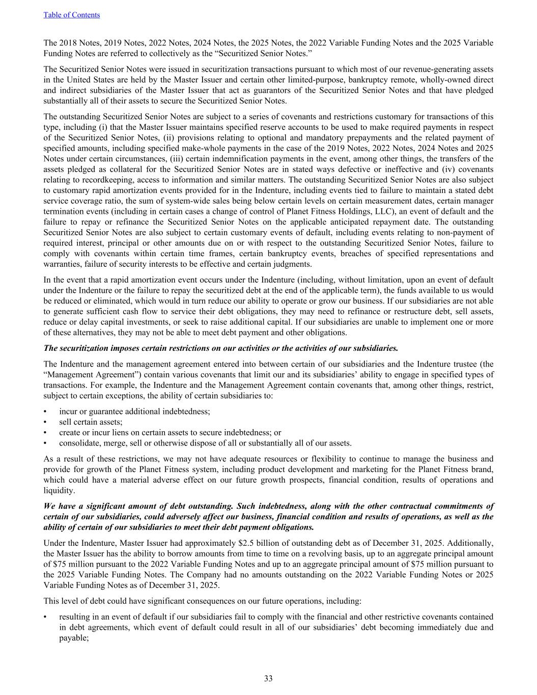 The 2018 Notes, 2019 Notes, 2022 Notes, 2024 Notes, the 2025 Notes, the 2022 Variable Funding Notes and the 2025 Variable Funding Notes are referred to collectively as the “Securitized Senior Notes.” The Securitized Senior Notes were issued in securitization transactions pursuant to which most of our revenue-generating assets in the United States are held by the Master Issuer and certain other limited-purpose, bankruptcy remote, wholly-owned direct and indirect subsidiaries of the Master Issuer that act as guarantors of the Securitized Senior Notes and that have pledged substantially all of their assets to secure the Securitized Senior Notes. The outstanding Securitized Senior Notes are subject to a series of covenants and restrictions customary for transactions of this type, including (i) that the Master Issuer maintains specified reserve accounts to be used to make required payments in respect of the Securitized Senior Notes, (ii) provisions relating to optional and mandatory prepayments and the related payment of specified amounts, including specified make-whole payments in the case of the 2019 Notes, 2022 Notes, 2024 Notes and 2025 Notes under certain circumstances, (iii) certain indemnification payments in the event, among other things, the transfers of the assets pledged as collateral for the Securitized Senior Notes are in stated ways defective or ineffective and (iv) covenants relating to recordkeeping, access to information and similar matters. The outstanding Securitized Senior Notes are also subject to customary rapid amortization events provided for in the Indenture, including events tied to failure to maintain a stated debt service coverage ratio, the sum of system-wide sales being below certain levels on certain measurement dates, certain manager termination events (including in certain cases a change of control of Planet Fitness Holdings, LLC), an event of default and the failure to repay or refinance the Securitized Senior Notes on the applicable anticipated repayment date. The outstanding Securitized Senior Notes are also subject to certain customary events of default, including events relating to non-payment of required interest, principal or other amounts due on or with respect to the outstanding Securitized Senior Notes, failure to comply with covenants within certain time frames, certain bankruptcy events, breaches of specified representations and warranties, failure of security interests to be effective and certain judgments. In the event that a rapid amortization event occurs under the Indenture (including, without limitation, upon an event of default under the Indenture or the failure to repay the securitized debt at the end of the applicable term), the funds available to us would be reduced or eliminated, which would in turn reduce our ability to operate or grow our business. If our subsidiaries are not able to generate sufficient cash flow to service their debt obligations, they may need to refinance or restructure debt, sell assets, reduce or delay capital investments, or seek to raise additional capital. If our subsidiaries are unable to implement one or more of these alternatives, they may not be able to meet debt payment and other obligations. The securitization imposes certain restrictions on our activities or the activities of our subsidiaries. The Indenture and the management agreement entered into between certain of our subsidiaries and the Indenture trustee (the “Management Agreement”) contain various covenants that limit our and its subsidiaries’ ability to engage in specified types of transactions. For example, the Indenture and the Management Agreement contain covenants that, among other things, restrict, subject to certain exceptions, the ability of certain subsidiaries to: • incur or guarantee additional indebtedness; • sell certain assets; • create or incur liens on certain assets to secure indebtedness; or • consolidate, merge, sell or otherwise dispose of all or substantially all of our assets. As a result of these restrictions, we may not have adequate resources or flexibility to continue to manage the business and provide for growth of the Planet Fitness system, including product development and marketing for the Planet Fitness brand, which could have a material adverse effect on our future growth prospects, financial condition, results of operations and liquidity. We have a significant amount of debt outstanding. Such indebtedness, along with the other contractual commitments of certain of our subsidiaries, could adversely affect our business, financial condition and results of operations, as well as the ability of certain of our subsidiaries to meet their debt payment obligations. Under the Indenture, Master Issuer had approximately $2.5 billion of outstanding debt as of December 31, 2025. Additionally, the Master Issuer has the ability to borrow amounts from time to time on a revolving basis, up to an aggregate principal amount of $75 million pursuant to the 2022 Variable Funding Notes and up to an aggregate principal amount of $75 million pursuant to the 2025 Variable Funding Notes. The Company had no amounts outstanding on the 2022 Variable Funding Notes or 2025 Variable Funding Notes as of December 31, 2025. This level of debt could have significant consequences on our future operations, including: • resulting in an event of default if our subsidiaries fail to comply with the financial and other restrictive covenants contained in debt agreements, which event of default could result in all of our subsidiaries’ debt becoming immediately due and payable; Table of Contents 33