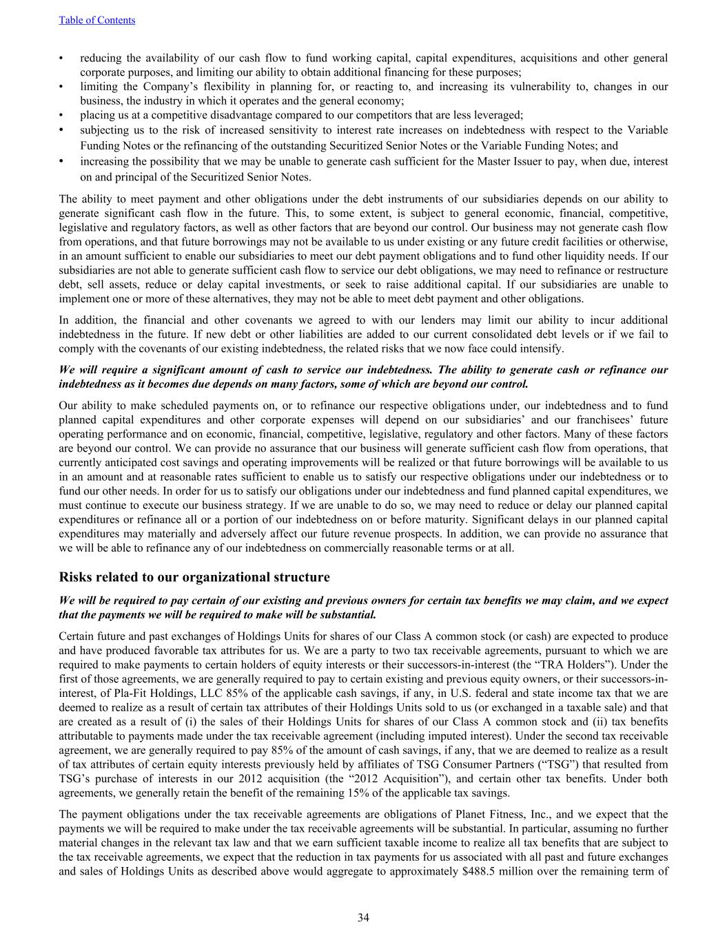 • reducing the availability of our cash flow to fund working capital, capital expenditures, acquisitions and other general corporate purposes, and limiting our ability to obtain additional financing for these purposes; • limiting the Company’s flexibility in planning for, or reacting to, and increasing its vulnerability to, changes in our business, the industry in which it operates and the general economy; • placing us at a competitive disadvantage compared to our competitors that are less leveraged; • subjecting us to the risk of increased sensitivity to interest rate increases on indebtedness with respect to the Variable Funding Notes or the refinancing of the outstanding Securitized Senior Notes or the Variable Funding Notes; and • increasing the possibility that we may be unable to generate cash sufficient for the Master Issuer to pay, when due, interest on and principal of the Securitized Senior Notes. The ability to meet payment and other obligations under the debt instruments of our subsidiaries depends on our ability to generate significant cash flow in the future. This, to some extent, is subject to general economic, financial, competitive, legislative and regulatory factors, as well as other factors that are beyond our control. Our business may not generate cash flow from operations, and that future borrowings may not be available to us under existing or any future credit facilities or otherwise, in an amount sufficient to enable our subsidiaries to meet our debt payment obligations and to fund other liquidity needs. If our subsidiaries are not able to generate sufficient cash flow to service our debt obligations, we may need to refinance or restructure debt, sell assets, reduce or delay capital investments, or seek to raise additional capital. If our subsidiaries are unable to implement one or more of these alternatives, they may not be able to meet debt payment and other obligations. In addition, the financial and other covenants we agreed to with our lenders may limit our ability to incur additional indebtedness in the future. If new debt or other liabilities are added to our current consolidated debt levels or if we fail to comply with the covenants of our existing indebtedness, the related risks that we now face could intensify. We will require a significant amount of cash to service our indebtedness. The ability to generate cash or refinance our indebtedness as it becomes due depends on many factors, some of which are beyond our control. Our ability to make scheduled payments on, or to refinance our respective obligations under, our indebtedness and to fund planned capital expenditures and other corporate expenses will depend on our subsidiaries’ and our franchisees’ future operating performance and on economic, financial, competitive, legislative, regulatory and other factors. Many of these factors are beyond our control. We can provide no assurance that our business will generate sufficient cash flow from operations, that currently anticipated cost savings and operating improvements will be realized or that future borrowings will be available to us in an amount and at reasonable rates sufficient to enable us to satisfy our respective obligations under our indebtedness or to fund our other needs. In order for us to satisfy our obligations under our indebtedness and fund planned capital expenditures, we must continue to execute our business strategy. If we are unable to do so, we may need to reduce or delay our planned capital expenditures or refinance all or a portion of our indebtedness on or before maturity. Significant delays in our planned capital expenditures may materially and adversely affect our future revenue prospects. In addition, we can provide no assurance that we will be able to refinance any of our indebtedness on commercially reasonable terms or at all. Risks related to our organizational structure We will be required to pay certain of our existing and previous owners for certain tax benefits we may claim, and we expect that the payments we will be required to make will be substantial. Certain future and past exchanges of Holdings Units for shares of our Class A common stock (or cash) are expected to produce and have produced favorable tax attributes for us. We are a party to two tax receivable agreements, pursuant to which we are required to make payments to certain holders of equity interests or their successors-in-interest (the “TRA Holders”). Under the first of those agreements, we are generally required to pay to certain existing and previous equity owners, or their successors-in- interest, of Pla-Fit Holdings, LLC 85% of the applicable cash savings, if any, in U.S. federal and state income tax that we are deemed to realize as a result of certain tax attributes of their Holdings Units sold to us (or exchanged in a taxable sale) and that are created as a result of (i) the sales of their Holdings Units for shares of our Class A common stock and (ii) tax benefits attributable to payments made under the tax receivable agreement (including imputed interest). Under the second tax receivable agreement, we are generally required to pay 85% of the amount of cash savings, if any, that we are deemed to realize as a result of tax attributes of certain equity interests previously held by affiliates of TSG Consumer Partners (“TSG”) that resulted from TSG’s purchase of interests in our 2012 acquisition (the “2012 Acquisition”), and certain other tax benefits. Under both agreements, we generally retain the benefit of the remaining 15% of the applicable tax savings. The payment obligations under the tax receivable agreements are obligations of Planet Fitness, Inc., and we expect that the payments we will be required to make under the tax receivable agreements will be substantial. In particular, assuming no further material changes in the relevant tax law and that we earn sufficient taxable income to realize all tax benefits that are subj