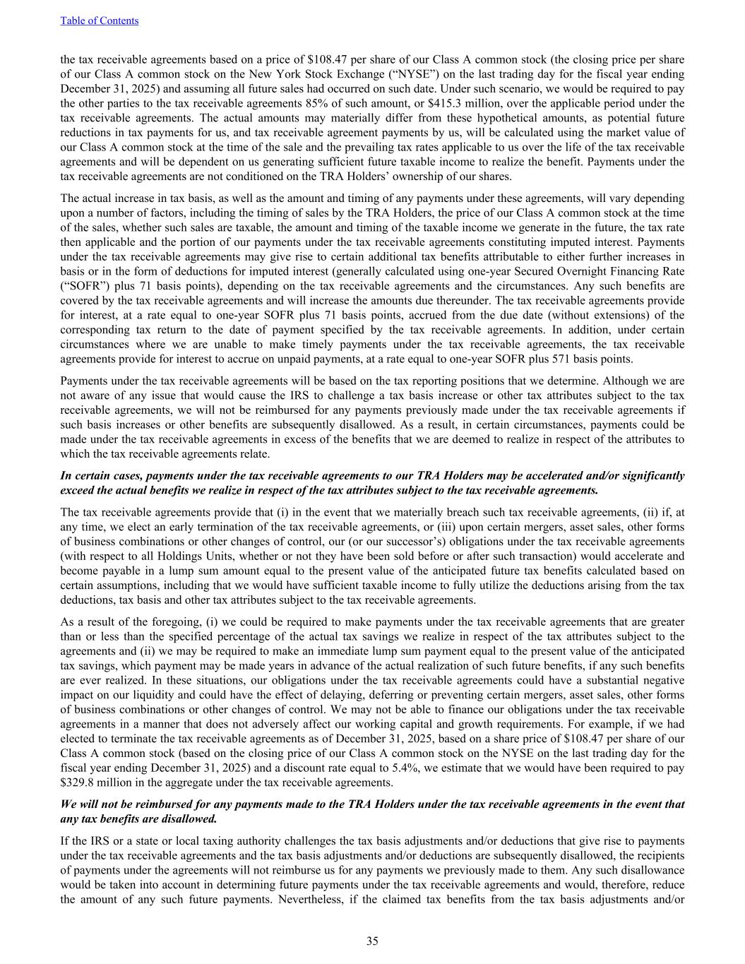 the tax receivable agreements based on a price of $108.47 per share of our Class A common stock (the closing price per share of our Class A common stock on the New York Stock Exchange (“NYSE”) on the last trading day for the fiscal year ending December 31, 2025) and assuming all future sales had occurred on such date. Under such scenario, we would be required to pay the other parties to the tax receivable agreements 85% of such amount, or $415.3 million, over the applicable period under the tax receivable agreements. The actual amounts may materially differ from these hypothetical amounts, as potential future reductions in tax payments for us, and tax receivable agreement payments by us, will be calculated using the market value of our Class A common stock at the time of the sale and the prevailing tax rates applicable to us over the life of the tax receivable agreements and will be dependent on us generating sufficient future taxable income to realize the benefit. Payments under the tax receivable agreements are not conditioned on the TRA Holders’ ownership of our shares. The actual increase in tax basis, as well as the amount and timing of any payments under these agreements, will vary depending upon a number of factors, including the timing of sales by the TRA Holders, the price of our Class A common stock at the time of the sales, whether such sales are taxable, the amount and timing of the taxable income we generate in the future, the tax rate then applicable and the portion of our payments under the tax receivable agreements constituting imputed interest. Payments under the tax receivable agreements may give rise to certain additional tax benefits attributable to either further increases in basis or in the form of deductions for imputed interest (generally calculated using one-year Secured Overnight Financing Rate (“SOFR”) plus 71 basis points), depending on the tax receivable agreements and the circumstances. Any such benefits are covered by the tax receivable agreements and will increase the amounts due thereunder. The tax receivable agreements provide for interest, at a rate equal to one-year SOFR plus 71 basis points, accrued from the due date (without extensions) of the corresponding tax return to the date of payment specified by the tax receivable agreements. In addition, under certain circumstances where we are unable to make timely payments under the tax receivable agreements, the tax receivable agreements provide for interest to accrue on unpaid payments, at a rate equal to one-year SOFR plus 571 basis points. Payments under the tax receivable agreements will be based on the tax reporting positions that we determine. Although we are not aware of any issue that would cause the IRS to challenge a tax basis increase or other tax attributes subject to the tax receivable agreements, we will not be reimbursed for any payments previously made under the tax receivable agreements if such basis increases or other benefits are subsequently disallowed. As a result, in certain circumstances, payments could be made under the tax receivable agreements in excess of the benefits that we are deemed to realize in respect of the attributes to which the tax receivable agreements relate. In certain cases, payments under the tax receivable agreements to our TRA Holders may be accelerated and/or significantly exceed the actual benefits we realize in respect of the tax attributes subject to the tax receivable agreements. The tax receivable agreements provide that (i) in the event that we materially breach such tax receivable agreements, (ii) if, at any time, we elect an early termination of the tax receivable agreements, or (iii) upon certain mergers, asset sales, other forms of business combinations or other changes of control, our (or our successor’s) obligations under the tax receivable agreements (with respect to all Holdings Units, whether or not they have been sold before or after such transaction) would accelerate and become payable in a lump sum amount equal to the present value of the anticipated future tax benefits calculated based on certain assumptions, including that we would have sufficient taxable income to fully utilize the deductions arising from the tax deductions, tax basis and other tax attributes subject to the tax receivable agreements. As a result of the foregoing, (i) we could be required to make payments under the tax receivable agreements that are greater than or less than the specified percentage of the actual tax savings we realize in respect of the tax attributes subject to the agreements and (ii) we may be required to make an immediate lump sum payment equal to the present value of the anticipated tax savings, which payment may be made years in advance of the actual realization of such future benefits, if any such benefits are ever realized. In these situations, our obligations under the tax receivable agreements could have a substantial negative impact on our liquidity and could have the effect of delaying, deferring or preventing certain mergers, asset sales, other forms of business combinations or other changes of control. We may not be able to finance our obligations under the tax receivable agreements in a manner that does not adversely affect our working capital and growth requirements. For example, if we had elected to terminate the tax receivable agreements as of December 31, 2025, based on a share price of $108.47 per share of our Class A common stock (based on the closing price of our Class A common stock on the NYSE on the last trading day for the fiscal year ending December 31, 2025) and a discount rate equal to 5.4%, we estimate that we would have been required to pay $329.8 million in the aggregate under the tax receivable agreements. We will not be reimbursed for any payments made to the TRA Holders under the tax receivable agreements in the event that any tax benefits are disallowed. If the IRS or a state or local taxing authority challenge