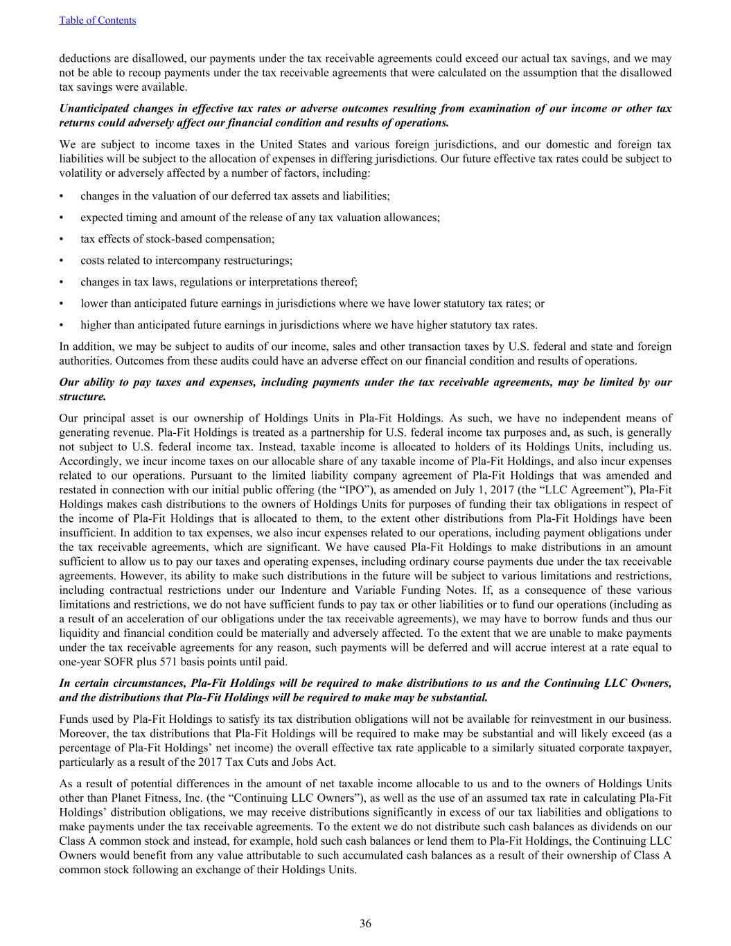 deductions are disallowed, our payments under the tax receivable agreements could exceed our actual tax savings, and we may not be able to recoup payments under the tax receivable agreements that were calculated on the assumption that the disallowed tax savings were available. Unanticipated changes in effective tax rates or adverse outcomes resulting from examination of our income or other tax returns could adversely affect our financial condition and results of operations. We are subject to income taxes in the United States and various foreign jurisdictions, and our domestic and foreign tax liabilities will be subject to the allocation of expenses in differing jurisdictions. Our future effective tax rates could be subject to volatility or adversely affected by a number of factors, including: • changes in the valuation of our deferred tax assets and liabilities; • expected timing and amount of the release of any tax valuation allowances; • tax effects of stock-based compensation; • costs related to intercompany restructurings; • changes in tax laws, regulations or interpretations thereof; • lower than anticipated future earnings in jurisdictions where we have lower statutory tax rates; or • higher than anticipated future earnings in jurisdictions where we have higher statutory tax rates. In addition, we may be subject to audits of our income, sales and other transaction taxes by U.S. federal and state and foreign authorities. Outcomes from these audits could have an adverse effect on our financial condition and results of operations. Our ability to pay taxes and expenses, including payments under the tax receivable agreements, may be limited by our structure. Our principal asset is our ownership of Holdings Units in Pla-Fit Holdings. As such, we have no independent means of generating revenue. Pla-Fit Holdings is treated as a partnership for U.S. federal income tax purposes and, as such, is generally not subject to U.S. federal income tax. Instead, taxable income is allocated to holders of its Holdings Units, including us. Accordingly, we incur income taxes on our allocable share of any taxable income of Pla-Fit Holdings, and also incur expenses related to our operations. Pursuant to the limited liability company agreement of Pla-Fit Holdings that was amended and restated in connection with our initial public offering (the “IPO”), as amended on July 1, 2017 (the “LLC Agreement”), Pla-Fit Holdings makes cash distributions to the owners of Holdings Units for purposes of funding their tax obligations in respect of the income of Pla-Fit Holdings that is allocated to them, to the extent other distributions from Pla-Fit Holdings have been insufficient. In addition to tax expenses, we also incur expenses related to our operations, including payment obligations under the tax receivable agreements, which are significant. We have caused Pla-Fit Holdings to make distributions in an amount sufficient to allow us to pay our taxes and operating expenses, including ordinary course payments due under the tax receivable agreements. However, its ability to make such distributions in the future will be subject to various limitations and restrictions, including contractual restrictions under our Indenture and Variable Funding Notes. If, as a consequence of these various limitations and restrictions, we do not have sufficient funds to pay tax or other liabilities or to fund our operations (including as a result of an acceleration of our obligations under the tax receivable agreements), we may have to borrow funds and thus our liquidity and financial condition could be materially and adversely affected. To the extent that we are unable to make payments under the tax receivable agreements for any reason, such payments will be deferred and will accrue interest at a rate equal to one-year SOFR plus 571 basis points until paid. In certain circumstances, Pla-Fit Holdings will be required to make distributions to us and the Continuing LLC Owners, and the distributions that Pla-Fit Holdings will be required to make may be substantial. Funds used by Pla-Fit Holdings to satisfy its tax distribution obligations will not be available for reinvestment in our business. Moreover, the tax distributions that Pla-Fit Holdings will be required to make may be substantial and will likely exceed (as a percentage of Pla-Fit Holdings’ net income) the overall effective tax rate applicable to a similarly situated corporate taxpayer, particularly as a result of the 2017 Tax Cuts and Jobs Act. As a result of potential differences in the amount of net taxable income allocable to us and to the owners of Holdings Units other than Planet Fitness, Inc. (the “Continuing LLC Owners”), as well as the use of an assumed tax rate in calculating Pla-Fit Holdings’ distribution obligations, we may receive distributions significantly in excess of our tax liabilities and obligations to make payments under the tax receivable agreements. To the extent we do not distribute such cash balances as dividends on our Class A common stock and instead, for example, hold such cash balances or lend them to Pla-Fit Holdings, the Continuing LLC Owners would benefit from any value attributable to such accumulated cash balances as a result of their ownership of Class A common stock following an exchange of their Holdings Units. Table of Contents 36