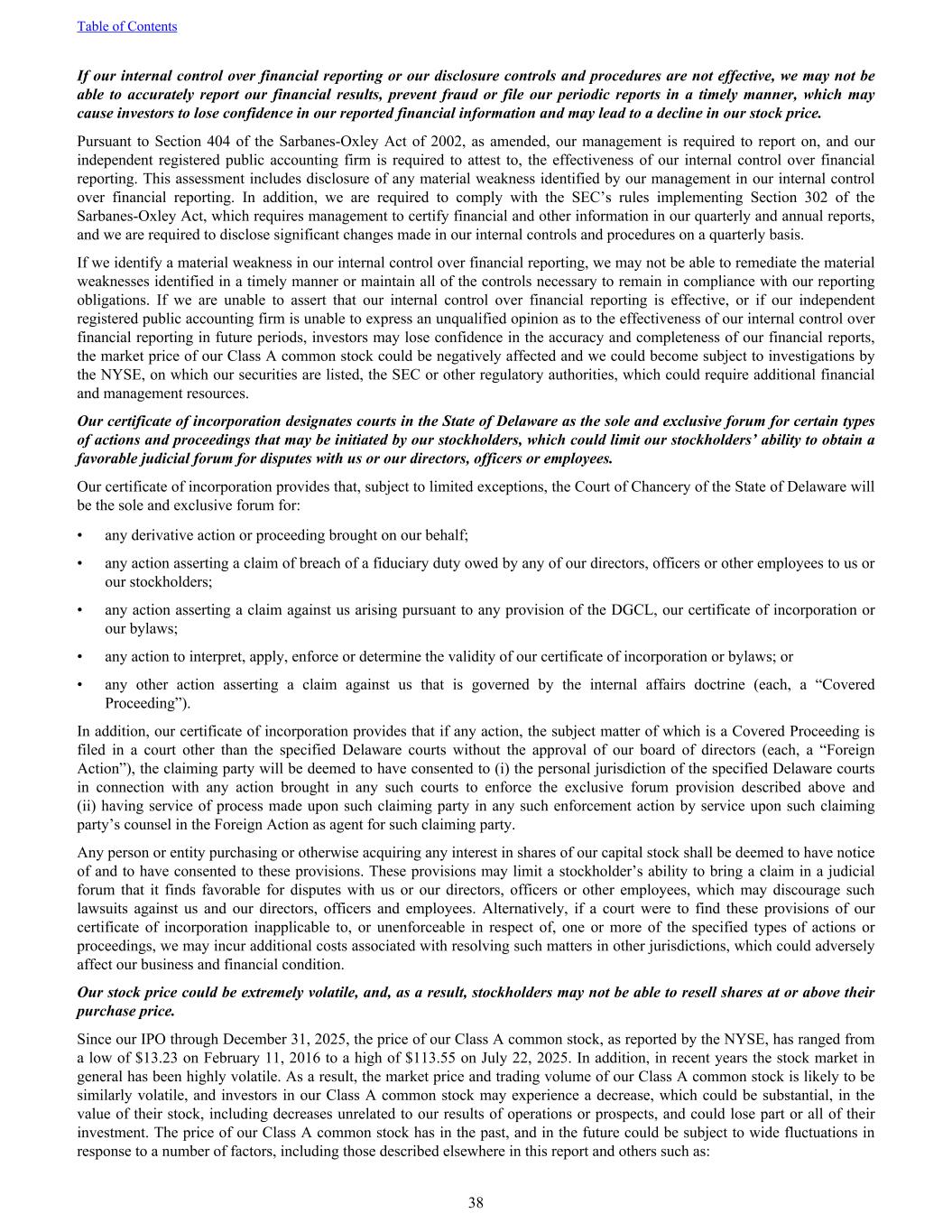 If our internal control over financial reporting or our disclosure controls and procedures are not effective, we may not be able to accurately report our financial results, prevent fraud or file our periodic reports in a timely manner, which may cause investors to lose confidence in our reported financial information and may lead to a decline in our stock price. Pursuant to Section 404 of the Sarbanes-Oxley Act of 2002, as amended, our management is required to report on, and our independent registered public accounting firm is required to attest to, the effectiveness of our internal control over financial reporting. This assessment includes disclosure of any material weakness identified by our management in our internal control over financial reporting. In addition, we are required to comply with the SEC’s rules implementing Section 302 of the Sarbanes-Oxley Act, which requires management to certify financial and other information in our quarterly and annual reports, and we are required to disclose significant changes made in our internal controls and procedures on a quarterly basis. If we identify a material weakness in our internal control over financial reporting, we may not be able to remediate the material weaknesses identified in a timely manner or maintain all of the controls necessary to remain in compliance with our reporting obligations. If we are unable to assert that our internal control over financial reporting is effective, or if our independent registered public accounting firm is unable to express an unqualified opinion as to the effectiveness of our internal control over financial reporting in future periods, investors may lose confidence in the accuracy and completeness of our financial reports, the market price of our Class A common stock could be negatively affected and we could become subject to investigations by the NYSE, on which our securities are listed, the SEC or other regulatory authorities, which could require additional financial and management resources. Our certificate of incorporation designates courts in the State of Delaware as the sole and exclusive forum for certain types of actions and proceedings that may be initiated by our stockholders, which could limit our stockholders’ ability to obtain a favorable judicial forum for disputes with us or our directors, officers or employees. Our certificate of incorporation provides that, subject to limited exceptions, the Court of Chancery of the State of Delaware will be the sole and exclusive forum for: • any derivative action or proceeding brought on our behalf; • any action asserting a claim of breach of a fiduciary duty owed by any of our directors, officers or other employees to us or our stockholders; • any action asserting a claim against us arising pursuant to any provision of the DGCL, our certificate of incorporation or our bylaws; • any action to interpret, apply, enforce or determine the validity of our certificate of incorporation or bylaws; or • any other action asserting a claim against us that is governed by the internal affairs doctrine (each, a “Covered Proceeding”). In addition, our certificate of incorporation provides that if any action, the subject matter of which is a Covered Proceeding is filed in a court other than the specified Delaware courts without the approval of our board of directors (each, a “Foreign Action”), the claiming party will be deemed to have consented to (i) the personal jurisdiction of the specified Delaware courts in connection with any action brought in any such courts to enforce the exclusive forum provision described above and (ii) having service of process made upon such claiming party in any such enforcement action by service upon such claiming party’s counsel in the Foreign Action as agent for such claiming party. Any person or entity purchasing or otherwise acquiring any interest in shares of our capital stock shall be deemed to have notice of and to have consented to these provisions. These provisions may limit a stockholder’s ability to bring a claim in a judicial forum that it finds favorable for disputes with us or our directors, officers or other employees, which may discourage such lawsuits against us and our directors, officers and employees. Alternatively, if a court were to find these provisions of our certificate of incorporation inapplicable to, or unenforceable in respect of, one or more of the specified types of actions or proceedings, we may incur additional costs associated with resolving such matters in other jurisdictions, which could adversely affect our business and financial condition. Our stock price could be extremely volatile, and, as a result, stockholders may not be able to resell shares at or above their purchase price. Since our IPO through December 31, 2025, the price of our Class A common stock, as reported by the NYSE, has ranged from a low of $13.23 on February 11, 2016 to a high of $113.55 on July 22, 2025. In addition, in recent years the stock market in general has been highly volatile. As a result, the market price and trading volume of our Class A common stock is likely to be similarly volatile, and investors in our Class A common stock may experience a decrease, which could be substantial, in the value of their stock, including decreases unrelated to our results of operations or prospects, and could lose part or all of their investment. The price of our Class A common stock has in the past, and in the future could be subject to wide fluctuations in response to a number of factors, including those described elsewhere in this report and others such as: Table of Contents 38