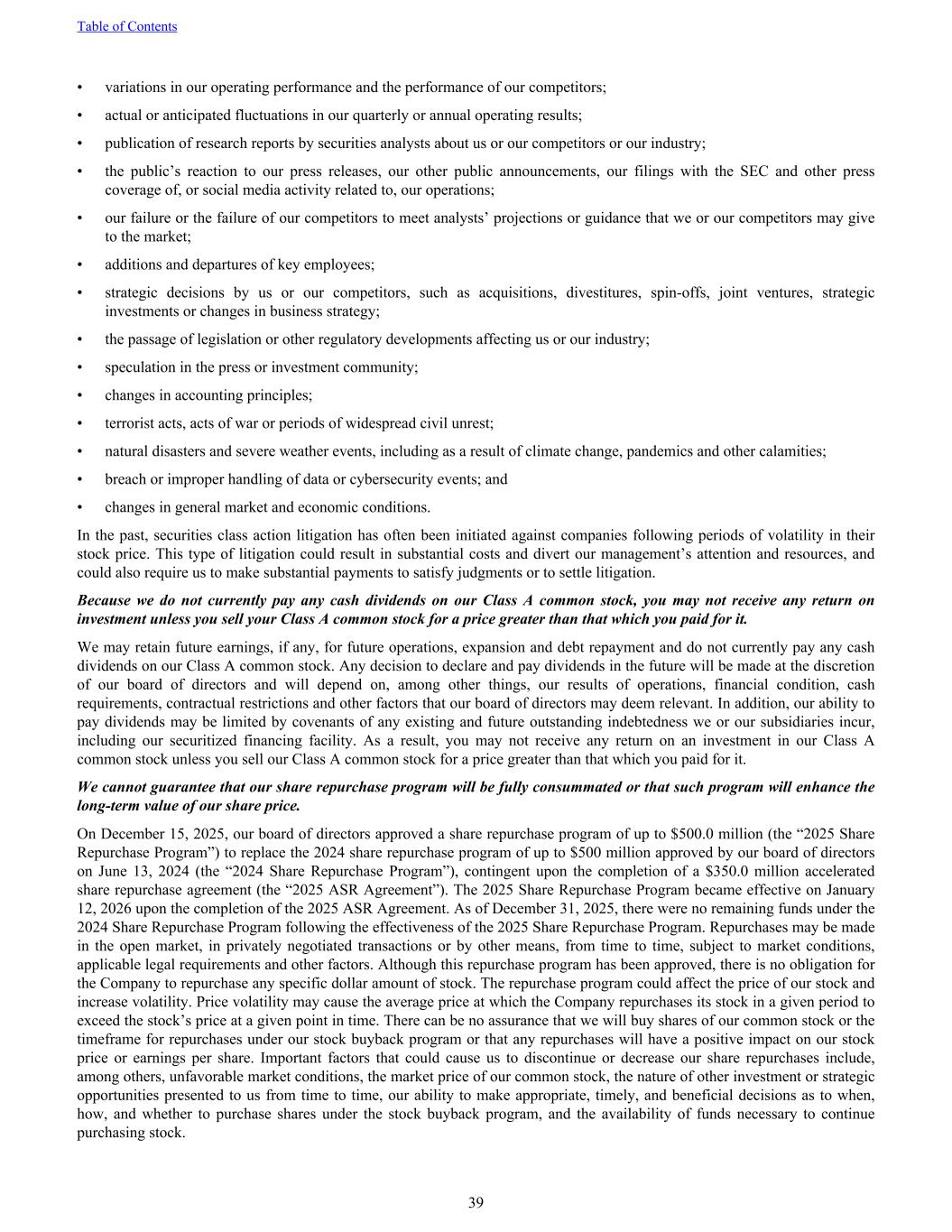 • variations in our operating performance and the performance of our competitors; • actual or anticipated fluctuations in our quarterly or annual operating results; • publication of research reports by securities analysts about us or our competitors or our industry; • the public’s reaction to our press releases, our other public announcements, our filings with the SEC and other press coverage of, or social media activity related to, our operations; • our failure or the failure of our competitors to meet analysts’ projections or guidance that we or our competitors may give to the market; • additions and departures of key employees; • strategic decisions by us or our competitors, such as acquisitions, divestitures, spin-offs, joint ventures, strategic investments or changes in business strategy; • the passage of legislation or other regulatory developments affecting us or our industry; • speculation in the press or investment community; • changes in accounting principles; • terrorist acts, acts of war or periods of widespread civil unrest; • natural disasters and severe weather events, including as a result of climate change, pandemics and other calamities; • breach or improper handling of data or cybersecurity events; and • changes in general market and economic conditions. In the past, securities class action litigation has often been initiated against companies following periods of volatility in their stock price. This type of litigation could result in substantial costs and divert our management’s attention and resources, and could also require us to make substantial payments to satisfy judgments or to settle litigation. Because we do not currently pay any cash dividends on our Class A common stock, you may not receive any return on investment unless you sell your Class A common stock for a price greater than that which you paid for it. We may retain future earnings, if any, for future operations, expansion and debt repayment and do not currently pay any cash dividends on our Class A common stock. Any decision to declare and pay dividends in the future will be made at the discretion of our board of directors and will depend on, among other things, our results of operations, financial condition, cash requirements, contractual restrictions and other factors that our board of directors may deem relevant. In addition, our ability to pay dividends may be limited by covenants of any existing and future outstanding indebtedness we or our subsidiaries incur, including our securitized financing facility. As a result, you may not receive any return on an investment in our Class A common stock unless you sell our Class A common stock for a price greater than that which you paid for it. We cannot guarantee that our share repurchase program will be fully consummated or that such program will enhance the long-term value of our share price. On December 15, 2025, our board of directors approved a share repurchase program of up to $500.0 million (the “2025 Share Repurchase Program”) to replace the 2024 share repurchase program of up to $500 million approved by our board of directors on June 13, 2024 (the “2024 Share Repurchase Program”), contingent upon the completion of a $350.0 million accelerated share repurchase agreement (the “2025 ASR Agreement”). The 2025 Share Repurchase Program became effective on January 12, 2026 upon the completion of the 2025 ASR Agreement. As of December 31, 2025, there were no remaining funds under the 2024 Share Repurchase Program following the effectiveness of the 2025 Share Repurchase Program. Repurchases may be made in the open market, in privately negotiated transactions or by other means, from time to time, subject to market conditions, applicable legal requirements and other factors. Although this repurchase program has been approved, there is no obligation for the Company to repurchase any specific dollar amount of stock. The repurchase program could affect the price of our stock and increase volatility. Price volatility may cause the average price at which the Company repurchases its stock in a given period to exceed the stock’s price at a given point in time. There can be no assurance that we will buy shares of our common stock or the timeframe for repurchases under our stock buyback program or that any repurchases will have a positive impact on our stock price or earnings per share. Important factors that could cause us to discontinue or decrease our share repurchases include, among others, unfavorable market conditions, the market price of our common stock, the nature of other investment or strategic opportunities presented to us from time to time, our ability to make appropriate, timely, and beneficial decisions as to when, how, and whether to purchase shares under the stock buyback program, and the availability of funds necessary to continue purchasing stock. Table of Contents 39
