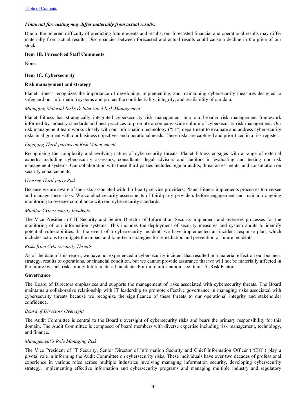 Financial forecasting may differ materially from actual results. Due to the inherent difficulty of predicting future events and results, our forecasted financial and operational results may differ materially from actual results. Discrepancies between forecasted and actual results could cause a decline in the price of our stock. Item 1B. Unresolved Staff Comments None. Item 1C. Cybersecurity Risk management and strategy Planet Fitness recognizes the importance of developing, implementing, and maintaining cybersecurity measures designed to safeguard our information systems and protect the confidentiality, integrity, and availability of our data. Managing Material Risks & Integrated Risk Management Planet Fitness has strategically integrated cybersecurity risk management into our broader risk management framework informed by industry standards and best practices to promote a company-wide culture of cybersecurity risk management. Our risk management team works closely with our information technology (“IT”) department to evaluate and address cybersecurity risks in alignment with our business objectives and operational needs. These risks are captured and prioritized in a risk register. Engaging Third-parties on Risk Management Recognizing the complexity and evolving nature of cybersecurity threats, Planet Fitness engages with a range of external experts, including cybersecurity assessors, consultants, legal advisors and auditors in evaluating and testing our risk management systems. Our collaboration with these third-parties includes regular audits, threat assessments, and consultation on security enhancements. Oversee Third-party Risk Because we are aware of the risks associated with third-party service providers, Planet Fitness implements processes to oversee and manage these risks. We conduct security assessments of third-party providers before engagement and maintain ongoing monitoring to oversee compliance with our cybersecurity standards. Monitor Cybersecurity Incidents The Vice President of IT Security and Senior Director of Information Security implement and oversees processes for the monitoring of our information systems. This includes the deployment of security measures and system audits to identify potential vulnerabilities. In the event of a cybersecurity incident, we have implemented an incident response plan, which includes actions to mitigate the impact and long-term strategies for remediation and prevention of future incidents. Risks from Cybersecurity Threats As of the date of this report, we have not experienced a cybersecurity incident that resulted in a material effect on our business strategy, results of operations, or financial condition, but we cannot provide assurance that we will not be materially affected in the future by such risks or any future material incidents. For more information, see Item 1A. Risk Factors. Governance The Board of Directors emphasizes and supports the management of risks associated with cybersecurity threats. The Board maintains a collaborative relationship with IT leadership to promote effective governance in managing risks associated with cybersecurity threats because we recognize the significance of these threats to our operational integrity and stakeholder confidence. Board of Directors Oversight The Audit Committee is central to the Board’s oversight of cybersecurity risks and bears the primary responsibility for this domain. The Audit Committee is composed of board members with diverse expertise including risk management, technology, and finance. Management’s Role Managing Risk The Vice President of IT Security, Senior Director of Information Security and Chief Information Officer (“CIO”) play a pivotal role in informing the Audit Committee on cybersecurity risks. These individuals have over two decades of professional experience in various roles across multiple industries involving managing information security, developing cybersecurity strategy, implementing effective information and cybersecurity programs and managing multiple industry and regulatory Table of Contents 40