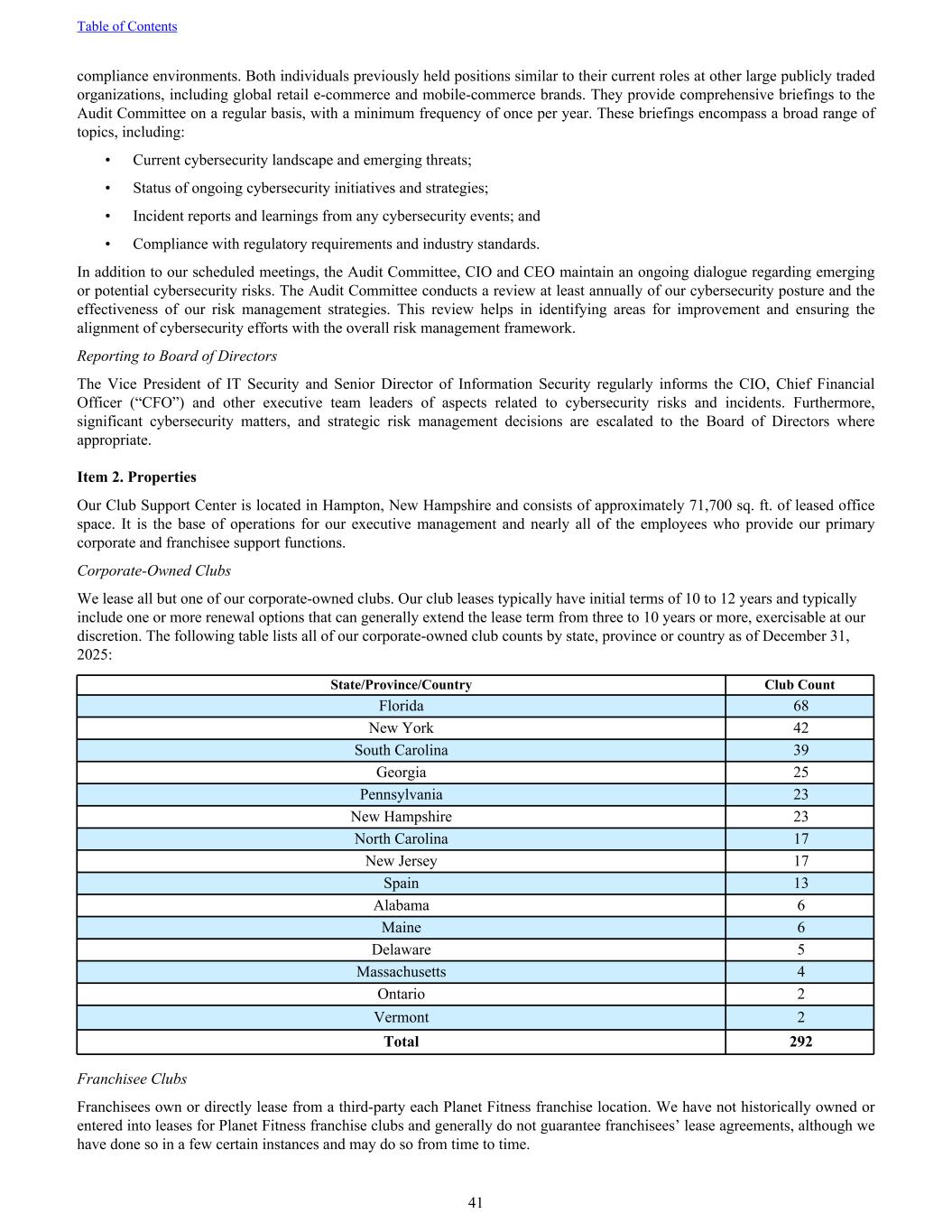 compliance environments. Both individuals previously held positions similar to their current roles at other large publicly traded organizations, including global retail e-commerce and mobile-commerce brands. They provide comprehensive briefings to the Audit Committee on a regular basis, with a minimum frequency of once per year. These briefings encompass a broad range of topics, including: • Current cybersecurity landscape and emerging threats; • Status of ongoing cybersecurity initiatives and strategies; • Incident reports and learnings from any cybersecurity events; and • Compliance with regulatory requirements and industry standards. In addition to our scheduled meetings, the Audit Committee, CIO and CEO maintain an ongoing dialogue regarding emerging or potential cybersecurity risks. The Audit Committee conducts a review at least annually of our cybersecurity posture and the effectiveness of our risk management strategies. This review helps in identifying areas for improvement and ensuring the alignment of cybersecurity efforts with the overall risk management framework. Reporting to Board of Directors The Vice President of IT Security and Senior Director of Information Security regularly informs the CIO, Chief Financial Officer (“CFO”) and other executive team leaders of aspects related to cybersecurity risks and incidents. Furthermore, significant cybersecurity matters, and strategic risk management decisions are escalated to the Board of Directors where appropriate. Item 2. Properties Our Club Support Center is located in Hampton, New Hampshire and consists of approximately 71,700 sq. ft. of leased office space. It is the base of operations for our executive management and nearly all of the employees who provide our primary corporate and franchisee support functions. Corporate-Owned Clubs We lease all but one of our corporate-owned clubs. Our club leases typically have initial terms of 10 to 12 years and typically include one or more renewal options that can generally extend the lease term from three to 10 years or more, exercisable at our discretion. The following table lists all of our corporate-owned club counts by state, province or country as of December 31, 2025: State/Province/Country Club Count Florida 68 New York 42 South Carolina 39 Georgia 25 Pennsylvania 23 New Hampshire 23 North Carolina 17 New Jersey 17 Spain 13 Alabama 6 Maine 6 Delaware 5 Massachusetts 4 Ontario 2 Vermont 2 Total 292 Franchisee Clubs Franchisees own or directly lease from a third-party each Planet Fitness franchise location. We have not historically owned or entered into leases for Planet Fitness franchise clubs and generally do not guarantee franchisees’ lease agreements, although we have done so in a few certain instances and may do so from time to time. Table of Contents 41
