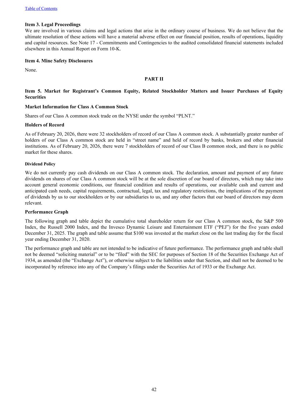 Item 3. Legal Proceedings We are involved in various claims and legal actions that arise in the ordinary course of business. We do not believe that the ultimate resolution of these actions will have a material adverse effect on our financial position, results of operations, liquidity and capital resources. See Note 17 - Commitments and Contingencies to the audited consolidated financial statements included elsewhere in this Annual Report on Form 10-K. Item 4. Mine Safety Disclosures None. PART II Item 5. Market for Registrant’s Common Equity, Related Stockholder Matters and Issuer Purchases of Equity Securities Market Information for Class A Common Stock Shares of our Class A common stock trade on the NYSE under the symbol “PLNT.” Holders of Record As of February 20, 2026, there were 32 stockholders of record of our Class A common stock. A substantially greater number of holders of our Class A common stock are held in “street name” and held of record by banks, brokers and other financial institutions. As of February 20, 2026, there were 7 stockholders of record of our Class B common stock, and there is no public market for these shares. Dividend Policy We do not currently pay cash dividends on our Class A common stock. The declaration, amount and payment of any future dividends on shares of our Class A common stock will be at the sole discretion of our board of directors, which may take into account general economic conditions, our financial condition and results of operations, our available cash and current and anticipated cash needs, capital requirements, contractual, legal, tax and regulatory restrictions, the implications of the payment of dividends by us to our stockholders or by our subsidiaries to us, and any other factors that our board of directors may deem relevant. Performance Graph The following graph and table depict the cumulative total shareholder return for our Class A common stock, the S&P 500 Index, the Russell 2000 Index, and the Invesco Dynamic Leisure and Entertainment ETF (“PEJ”) for the five years ended December 31, 2025. The graph and table assume that $100 was invested at the market close on the last trading day for the fiscal year ending December 31, 2020. The performance graph and table are not intended to be indicative of future performance. The performance graph and table shall not be deemed “soliciting material” or to be “filed” with the SEC for purposes of Section 18 of the Securities Exchange Act of 1934, as amended (the “Exchange Act”), or otherwise subject to the liabilities under that Section, and shall not be deemed to be incorporated by reference into any of the Company’s filings under the Securities Act of 1933 or the Exchange Act. Table of Contents 42