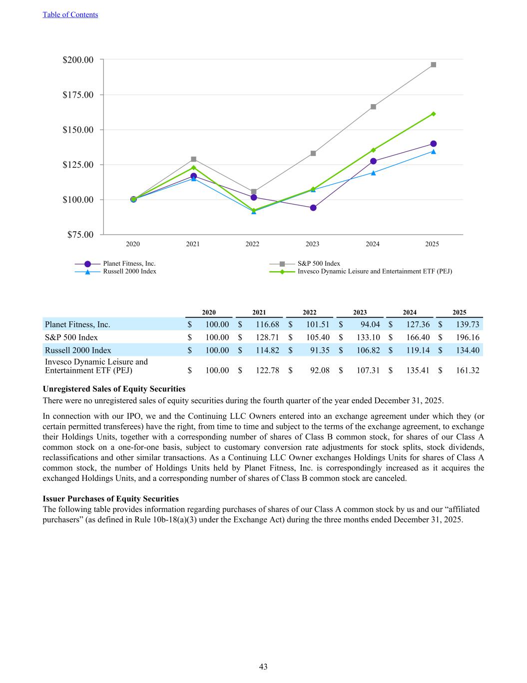 Planet Fitness, Inc. S&P 500 Index Russell 2000 Index Invesco Dynamic Leisure and Entertainment ETF (PEJ) 2020 2021 2022 2023 2024 2025 $75.00 $100.00 $125.00 $150.00 $175.00 $200.00 2020 2021 2022 2023 2024 2025 Planet Fitness, Inc. $ 100.00 $ 116.68 $ 101.51 $ 94.04 $ 127.36 $ 139.73 S&P 500 Index $ 100.00 $ 128.71 $ 105.40 $ 133.10 $ 166.40 $ 196.16 Russell 2000 Index $ 100.00 $ 114.82 $ 91.35 $ 106.82 $ 119.14 $ 134.40 Invesco Dynamic Leisure and Entertainment ETF (PEJ) $ 100.00 $ 122.78 $ 92.08 $ 107.31 $ 135.41 $ 161.32 Unregistered Sales of Equity Securities There were no unregistered sales of equity securities during the fourth quarter of the year ended December 31, 2025. In connection with our IPO, we and the Continuing LLC Owners entered into an exchange agreement under which they (or certain permitted transferees) have the right, from time to time and subject to the terms of the exchange agreement, to exchange their Holdings Units, together with a corresponding number of shares of Class B common stock, for shares of our Class A common stock on a one-for-one basis, subject to customary conversion rate adjustments for stock splits, stock dividends, reclassifications and other similar transactions. As a Continuing LLC Owner exchanges Holdings Units for shares of Class A common stock, the number of Holdings Units held by Planet Fitness, Inc. is correspondingly increased as it acquires the exchanged Holdings Units, and a corresponding number of shares of Class B common stock are canceled. Issuer Purchases of Equity Securities The following table provides information regarding purchases of shares of our Class A common stock by us and our “affiliated purchasers” (as defined in Rule 10b-18(a)(3) under the Exchange Act) during the three months ended December 31, 2025. Table of Contents 43