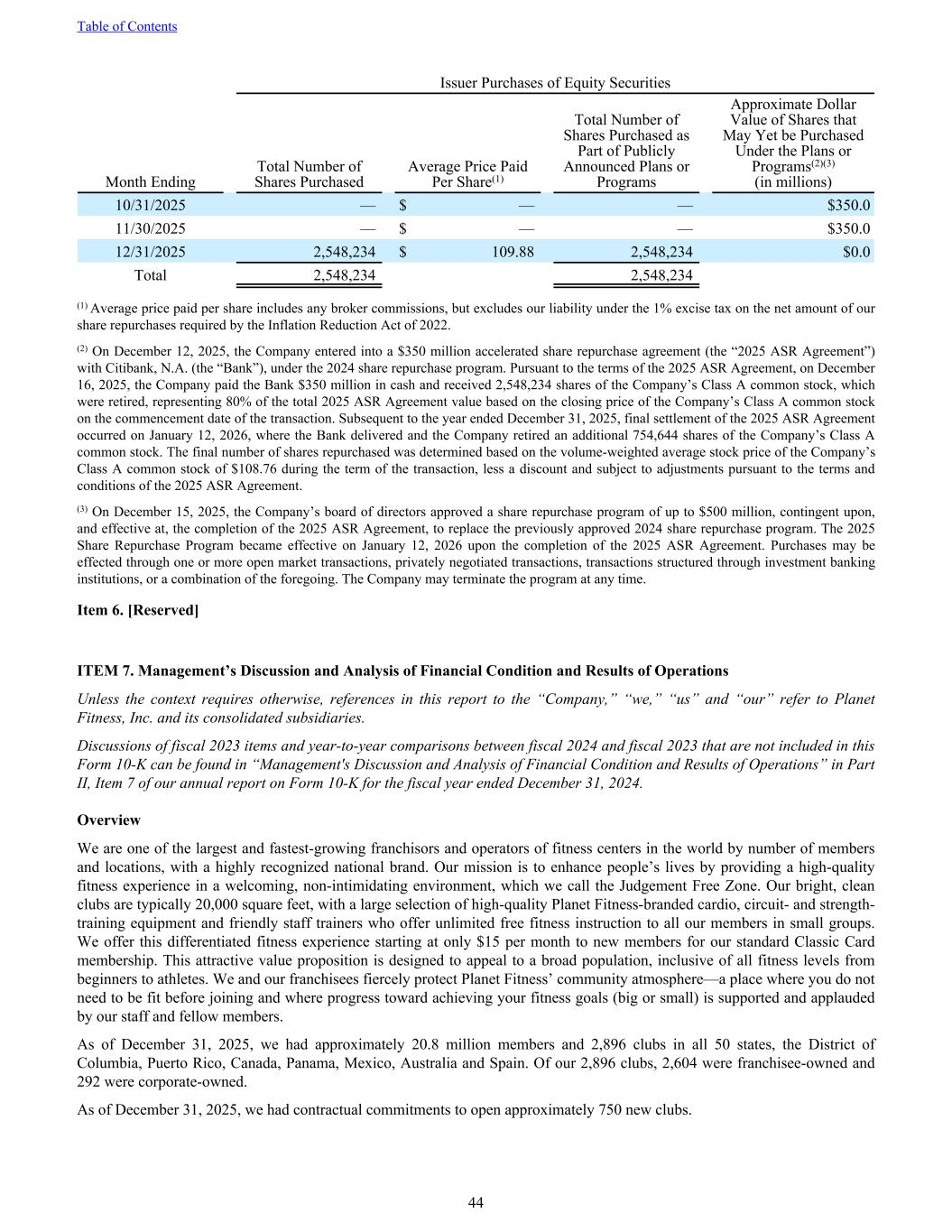 Issuer Purchases of Equity Securities Month Ending Total Number of Shares Purchased Average Price Paid Per Share(1) Total Number of Shares Purchased as Part of Publicly Announced Plans or Programs Approximate Dollar Value of Shares that May Yet be Purchased Under the Plans or Programs(2)(3) (in millions) 10/31/2025 — $ — — $350.0 11/30/2025 — $ — — $350.0 12/31/2025 2,548,234 $ 109.88 2,548,234 $0.0 Total 2,548,234 2,548,234 (1) Average price paid per share includes any broker commissions, but excludes our liability under the 1% excise tax on the net amount of our share repurchases required by the Inflation Reduction Act of 2022. (2) On December 12, 2025, the Company entered into a $350 million accelerated share repurchase agreement (the “2025 ASR Agreement”) with Citibank, N.A. (the “Bank”), under the 2024 share repurchase program. Pursuant to the terms of the 2025 ASR Agreement, on December 16, 2025, the Company paid the Bank $350 million in cash and received 2,548,234 shares of the Company’s Class A common stock, which were retired, representing 80% of the total 2025 ASR Agreement value based on the closing price of the Company’s Class A common stock on the commencement date of the transaction. Subsequent to the year ended December 31, 2025, final settlement of the 2025 ASR Agreement occurred on January 12, 2026, where the Bank delivered and the Company retired an additional 754,644 shares of the Company’s Class A common stock. The final number of shares repurchased was determined based on the volume-weighted average stock price of the Company’s Class A common stock of $108.76 during the term of the transaction, less a discount and subject to adjustments pursuant to the terms and conditions of the 2025 ASR Agreement. (3) On December 15, 2025, the Company’s board of directors approved a share repurchase program of up to $500 million, contingent upon, and effective at, the completion of the 2025 ASR Agreement, to replace the previously approved 2024 share repurchase program. The 2025 Share Repurchase Program became effective on January 12, 2026 upon the completion of the 2025 ASR Agreement. Purchases may be effected through one or more open market transactions, privately negotiated transactions, transactions structured through investment banking institutions, or a combination of the foregoing. The Company may terminate the program at any time. Item 6. [Reserved] ITEM 7. Management’s Discussion and Analysis of Financial Condition and Results of Operations Unless the context requires otherwise, references in this report to the “Company,” “we,” “us” and “our” refer to Planet Fitness, Inc. and its consolidated subsidiaries. Discussions of fiscal 2023 items and year-to-year comparisons between fiscal 2024 and fiscal 2023 that are not included in this Form 10-K can be found in “Management's Discussion and Analysis of Financial Condition and Results of Operations” in Part II, Item 7 of our annual report on Form 10-K for the fiscal year ended December 31, 2024. Overview We are one of the largest and fastest-growing franchisors and operators of fitness centers in the world by number of members and locations, with a highly recognized national brand. Our mission is to enhance people’s lives by providing a high-quality fitness experience in a welcoming, non-intimidating environment, which we call the Judgement Free Zone. Our bright, clean clubs are typically 20,000 square feet, with a large selection of high-quality Planet Fitness-branded cardio, circuit- and strength- training equipment and friendly staff trainers who offer unlimited free fitness instruction to all our members in small groups. We offer this differentiated fitness experience starting at only $15 per month to new members for our standard Classic Card membership. This attractive value proposition is designed to appeal to a broad population, inclusive of all fitness levels from beginners to athletes. We and our franchisees fiercely protect Planet Fitness’ community atmosphere—a place where you do not need to be fit before joining and where progress toward achieving your fitness goals (big or small) is supported and applauded by our staff and fellow members. As of December 31, 2025, we had approximately 20.8 million members and 2,896 clubs in all 50 states, the District of Columbia, Puerto Rico, Canada, Panama, Mexico, Australia and Spain. Of our 2,896 clubs, 2,604 were franchisee-owned and 292 were corporate-owned. As of December 31, 2025, we had contractual commitments to open approximately 750 new clubs. Table of Contents 44