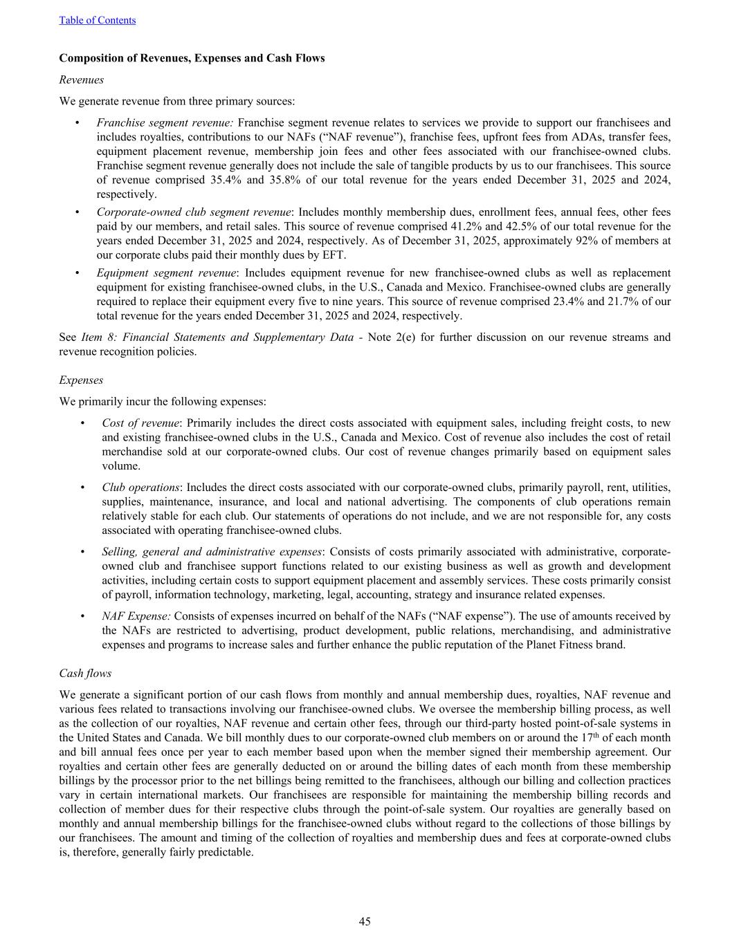 Composition of Revenues, Expenses and Cash Flows Revenues We generate revenue from three primary sources: • Franchise segment revenue: Franchise segment revenue relates to services we provide to support our franchisees and includes royalties, contributions to our NAFs (“NAF revenue”), franchise fees, upfront fees from ADAs, transfer fees, equipment placement revenue, membership join fees and other fees associated with our franchisee-owned clubs. Franchise segment revenue generally does not include the sale of tangible products by us to our franchisees. This source of revenue comprised 35.4% and 35.8% of our total revenue for the years ended December 31, 2025 and 2024, respectively. • Corporate-owned club segment revenue: Includes monthly membership dues, enrollment fees, annual fees, other fees paid by our members, and retail sales. This source of revenue comprised 41.2% and 42.5% of our total revenue for the years ended December 31, 2025 and 2024, respectively. As of December 31, 2025, approximately 92% of members at our corporate clubs paid their monthly dues by EFT. • Equipment segment revenue: Includes equipment revenue for new franchisee-owned clubs as well as replacement equipment for existing franchisee-owned clubs, in the U.S., Canada and Mexico. Franchisee-owned clubs are generally required to replace their equipment every five to nine years. This source of revenue comprised 23.4% and 21.7% of our total revenue for the years ended December 31, 2025 and 2024, respectively. See Item 8: Financial Statements and Supplementary Data - Note 2(e) for further discussion on our revenue streams and revenue recognition policies. Expenses We primarily incur the following expenses: • Cost of revenue: Primarily includes the direct costs associated with equipment sales, including freight costs, to new and existing franchisee-owned clubs in the U.S., Canada and Mexico. Cost of revenue also includes the cost of retail merchandise sold at our corporate-owned clubs. Our cost of revenue changes primarily based on equipment sales volume. • Club operations: Includes the direct costs associated with our corporate-owned clubs, primarily payroll, rent, utilities, supplies, maintenance, insurance, and local and national advertising. The components of club operations remain relatively stable for each club. Our statements of operations do not include, and we are not responsible for, any costs associated with operating franchisee-owned clubs. • Selling, general and administrative expenses: Consists of costs primarily associated with administrative, corporate- owned club and franchisee support functions related to our existing business as well as growth and development activities, including certain costs to support equipment placement and assembly services. These costs primarily consist of payroll, information technology, marketing, legal, accounting, strategy and insurance related expenses. • NAF Expense: Consists of expenses incurred on behalf of the NAFs (“NAF expense”). The use of amounts received by the NAFs are restricted to advertising, product development, public relations, merchandising, and administrative expenses and programs to increase sales and further enhance the public reputation of the Planet Fitness brand. Cash flows We generate a significant portion of our cash flows from monthly and annual membership dues, royalties, NAF revenue and various fees related to transactions involving our franchisee-owned clubs. We oversee the membership billing process, as well as the collection of our royalties, NAF revenue and certain other fees, through our third-party hosted point-of-sale systems in the United States and Canada. We bill monthly dues to our corporate-owned club members on or around the 17th of each month and bill annual fees once per year to each member based upon when the member signed their membership agreement. Our royalties and certain other fees are generally deducted on or around the billing dates of each month from these membership billings by the processor prior to the net billings being remitted to the franchisees, although our billing and collection practices vary in certain international markets. Our franchisees are responsible for maintaining the membership billing records and collection of member dues for their respective clubs through the point-of-sale system. Our royalties are generally based on monthly and annual membership billings for the franchisee-owned clubs without regard to the collections of those billings by our franchisees. The amount and timing of the collection of royalties and membership dues and fees at corporate-owned clubs is, therefore, generally fairly predictable. Table of Contents 45