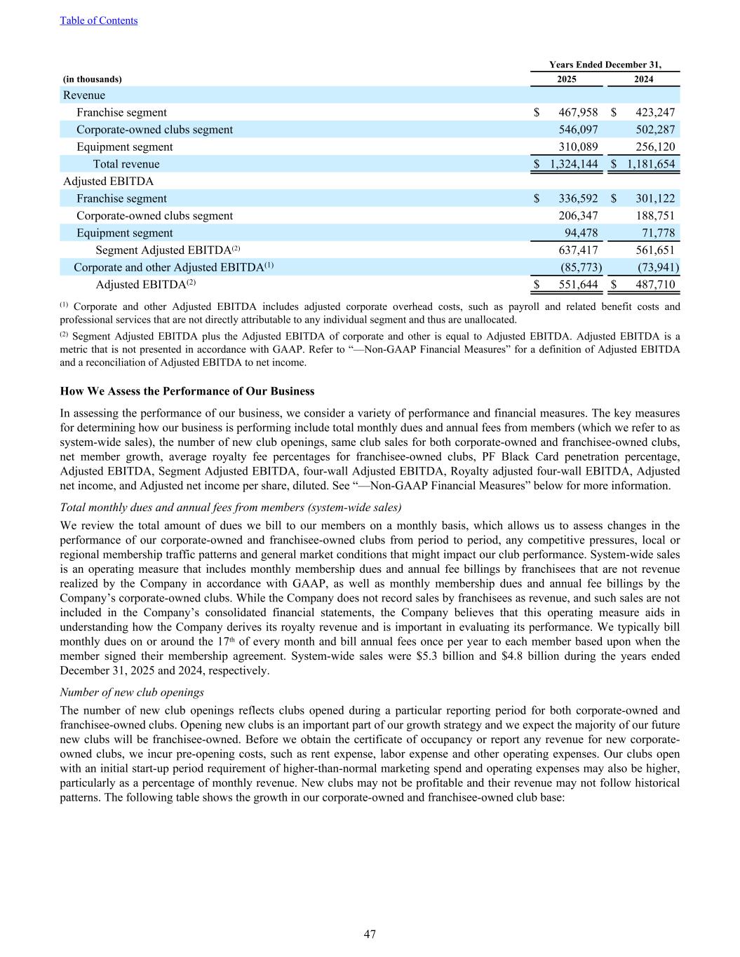 Years Ended December 31, (in thousands) 2025 2024 Revenue Franchise segment $ 467,958 $ 423,247 Corporate-owned clubs segment 546,097 502,287 Equipment segment 310,089 256,120 Total revenue $ 1,324,144 $ 1,181,654 Adjusted EBITDA Franchise segment $ 336,592 $ 301,122 Corporate-owned clubs segment 206,347 188,751 Equipment segment 94,478 71,778 Segment Adjusted EBITDA(2) 637,417 561,651 Corporate and other Adjusted EBITDA(1) (85,773) (73,941) Adjusted EBITDA(2) $ 551,644 $ 487,710 (1) Corporate and other Adjusted EBITDA includes adjusted corporate overhead costs, such as payroll and related benefit costs and professional services that are not directly attributable to any individual segment and thus are unallocated. (2) Segment Adjusted EBITDA plus the Adjusted EBITDA of corporate and other is equal to Adjusted EBITDA. Adjusted EBITDA is a metric that is not presented in accordance with GAAP. Refer to “—Non-GAAP Financial Measures” for a definition of Adjusted EBITDA and a reconciliation of Adjusted EBITDA to net income. How We Assess the Performance of Our Business In assessing the performance of our business, we consider a variety of performance and financial measures. The key measures for determining how our business is performing include total monthly dues and annual fees from members (which we refer to as system-wide sales), the number of new club openings, same club sales for both corporate-owned and franchisee-owned clubs, net member growth, average royalty fee percentages for franchisee-owned clubs, PF Black Card penetration percentage, Adjusted EBITDA, Segment Adjusted EBITDA, four-wall Adjusted EBITDA, Royalty adjusted four-wall EBITDA, Adjusted net income, and Adjusted net income per share, diluted. See “—Non-GAAP Financial Measures” below for more information. Total monthly dues and annual fees from members (system-wide sales) We review the total amount of dues we bill to our members on a monthly basis, which allows us to assess changes in the performance of our corporate-owned and franchisee-owned clubs from period to period, any competitive pressures, local or regional membership traffic patterns and general market conditions that might impact our club performance. System-wide sales is an operating measure that includes monthly membership dues and annual fee billings by franchisees that are not revenue realized by the Company in accordance with GAAP, as well as monthly membership dues and annual fee billings by the Company’s corporate-owned clubs. While the Company does not record sales by franchisees as revenue, and such sales are not included in the Company’s consolidated financial statements, the Company believes that this operating measure aids in understanding how the Company derives its royalty revenue and is important in evaluating its performance. We typically bill monthly dues on or around the 17th of every month and bill annual fees once per year to each member based upon when the member signed their membership agreement. System-wide sales were $5.3 billion and $4.8 billion during the years ended December 31, 2025 and 2024, respectively. Number of new club openings The number of new club openings reflects clubs opened during a particular reporting period for both corporate-owned and franchisee-owned clubs. Opening new clubs is an important part of our growth strategy and we expect the majority of our future new clubs will be franchisee-owned. Before we obtain the certificate of occupancy or report any revenue for new corporate- owned clubs, we incur pre-opening costs, such as rent expense, labor expense and other operating expenses. Our clubs open with an initial start-up period requirement of higher-than-normal marketing spend and operating expenses may also be higher, particularly as a percentage of monthly revenue. New clubs may not be profitable and their revenue may not follow historical patterns. The following table shows the growth in our corporate-owned and franchisee-owned club base: Table of Contents 47