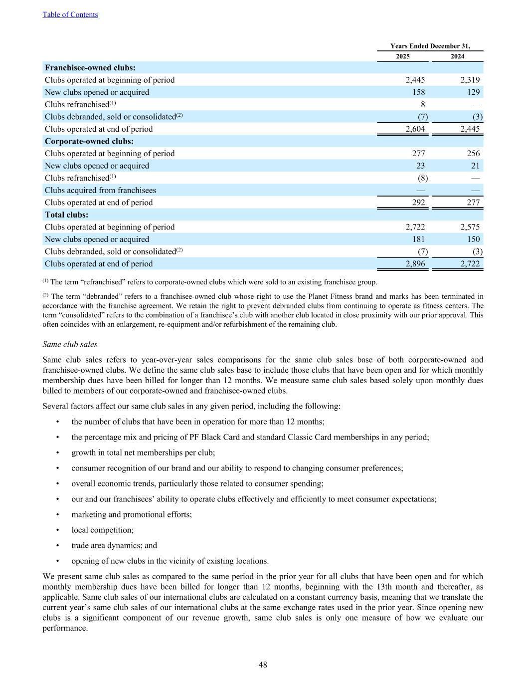 Years Ended December 31, 2025 2024 Franchisee-owned clubs: Clubs operated at beginning of period 2,445 2,319 New clubs opened or acquired 158 129 Clubs refranchised(1) 8 — Clubs debranded, sold or consolidated(2) (7) (3) Clubs operated at end of period 2,604 2,445 Corporate-owned clubs: Clubs operated at beginning of period 277 256 New clubs opened or acquired 23 21 Clubs refranchised(1) (8) — Clubs acquired from franchisees — — Clubs operated at end of period 292 277 Total clubs: Clubs operated at beginning of period 2,722 2,575 New clubs opened or acquired 181 150 Clubs debranded, sold or consolidated(2) (7) (3) Clubs operated at end of period 2,896 2,722 (1) The term “refranchised” refers to corporate-owned clubs which were sold to an existing franchisee group. (2) The term “debranded” refers to a franchisee-owned club whose right to use the Planet Fitness brand and marks has been terminated in accordance with the franchise agreement. We retain the right to prevent debranded clubs from continuing to operate as fitness centers. The term “consolidated” refers to the combination of a franchisee’s club with another club located in close proximity with our prior approval. This often coincides with an enlargement, re-equipment and/or refurbishment of the remaining club. Same club sales Same club sales refers to year-over-year sales comparisons for the same club sales base of both corporate-owned and franchisee-owned clubs. We define the same club sales base to include those clubs that have been open and for which monthly membership dues have been billed for longer than 12 months. We measure same club sales based solely upon monthly dues billed to members of our corporate-owned and franchisee-owned clubs. Several factors affect our same club sales in any given period, including the following: • the number of clubs that have been in operation for more than 12 months; • the percentage mix and pricing of PF Black Card and standard Classic Card memberships in any period; • growth in total net memberships per club; • consumer recognition of our brand and our ability to respond to changing consumer preferences; • overall economic trends, particularly those related to consumer spending; • our and our franchisees’ ability to operate clubs effectively and efficiently to meet consumer expectations; • marketing and promotional efforts; • local competition; • trade area dynamics; and • opening of new clubs in the vicinity of existing locations. We present same club sales as compared to the same period in the prior year for all clubs that have been open and for which monthly membership dues have been billed for longer than 12 months, beginning with the 13th month and thereafter, as applicable. Same club sales of our international clubs are calculated on a constant currency basis, meaning that we translate the current year’s same club sales of our international clubs at the same exchange rates used in the prior year. Since opening new clubs is a significant component of our revenue growth, same club sales is only one measure of how we evaluate our performance. Table of Contents 48