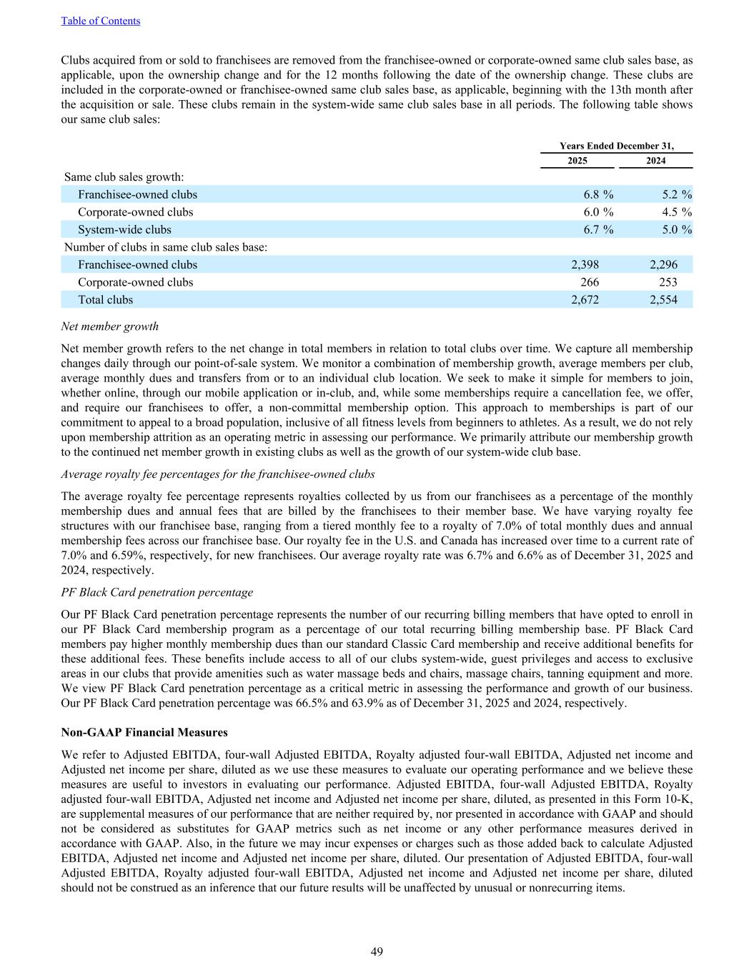 Clubs acquired from or sold to franchisees are removed from the franchisee-owned or corporate-owned same club sales base, as applicable, upon the ownership change and for the 12 months following the date of the ownership change. These clubs are included in the corporate-owned or franchisee-owned same club sales base, as applicable, beginning with the 13th month after the acquisition or sale. These clubs remain in the system-wide same club sales base in all periods. The following table shows our same club sales: Years Ended December 31, 2025 2024 Same club sales growth: Franchisee-owned clubs 6.8 % 5.2 % Corporate-owned clubs 6.0 % 4.5 % System-wide clubs 6.7 % 5.0 % Number of clubs in same club sales base: Franchisee-owned clubs 2,398 2,296 Corporate-owned clubs 266 253 Total clubs 2,672 2,554 Net member growth Net member growth refers to the net change in total members in relation to total clubs over time. We capture all membership changes daily through our point-of-sale system. We monitor a combination of membership growth, average members per club, average monthly dues and transfers from or to an individual club location. We seek to make it simple for members to join, whether online, through our mobile application or in-club, and, while some memberships require a cancellation fee, we offer, and require our franchisees to offer, a non-committal membership option. This approach to memberships is part of our commitment to appeal to a broad population, inclusive of all fitness levels from beginners to athletes. As a result, we do not rely upon membership attrition as an operating metric in assessing our performance. We primarily attribute our membership growth to the continued net member growth in existing clubs as well as the growth of our system-wide club base. Average royalty fee percentages for the franchisee-owned clubs The average royalty fee percentage represents royalties collected by us from our franchisees as a percentage of the monthly membership dues and annual fees that are billed by the franchisees to their member base. We have varying royalty fee structures with our franchisee base, ranging from a tiered monthly fee to a royalty of 7.0% of total monthly dues and annual membership fees across our franchisee base. Our royalty fee in the U.S. and Canada has increased over time to a current rate of 7.0% and 6.59%, respectively, for new franchisees. Our average royalty rate was 6.7% and 6.6% as of December 31, 2025 and 2024, respectively. PF Black Card penetration percentage Our PF Black Card penetration percentage represents the number of our recurring billing members that have opted to enroll in our PF Black Card membership program as a percentage of our total recurring billing membership base. PF Black Card members pay higher monthly membership dues than our standard Classic Card membership and receive additional benefits for these additional fees. These benefits include access to all of our clubs system-wide, guest privileges and access to exclusive areas in our clubs that provide amenities such as water massage beds and chairs, massage chairs, tanning equipment and more. We view PF Black Card penetration percentage as a critical metric in assessing the performance and growth of our business. Our PF Black Card penetration percentage was 66.5% and 63.9% as of December 31, 2025 and 2024, respectively. Non-GAAP Financial Measures We refer to Adjusted EBITDA, four-wall Adjusted EBITDA, Royalty adjusted four-wall EBITDA, Adjusted net income and Adjusted net income per share, diluted as we use these measures to evaluate our operating performance and we believe these measures are useful to investors in evaluating our performance. Adjusted EBITDA, four-wall Adjusted EBITDA, Royalty adjusted four-wall EBITDA, Adjusted net income and Adjusted net income per share, diluted, as presented in this Form 10-K, are supplemental measures of our performance that are neither required by, nor presented in accordance with GAAP and should not be considered as substitutes for GAAP metrics such as net income or any other performance measures derived in accordance with GAAP. Also, in the future we may incur expenses or charges such as those added back to calculate Adjusted EBITDA, Adjusted net income and Adjusted net income per share, diluted. Our presentation of Adjusted EBITDA, four-wall Adjusted EBITDA, Royalty adjusted four-wall EBITDA, Adjusted net income and Adjusted net income per share, diluted should not be construed as an inference that our future results will be unaffected by unusual or nonrecurring items. Table of Contents 49