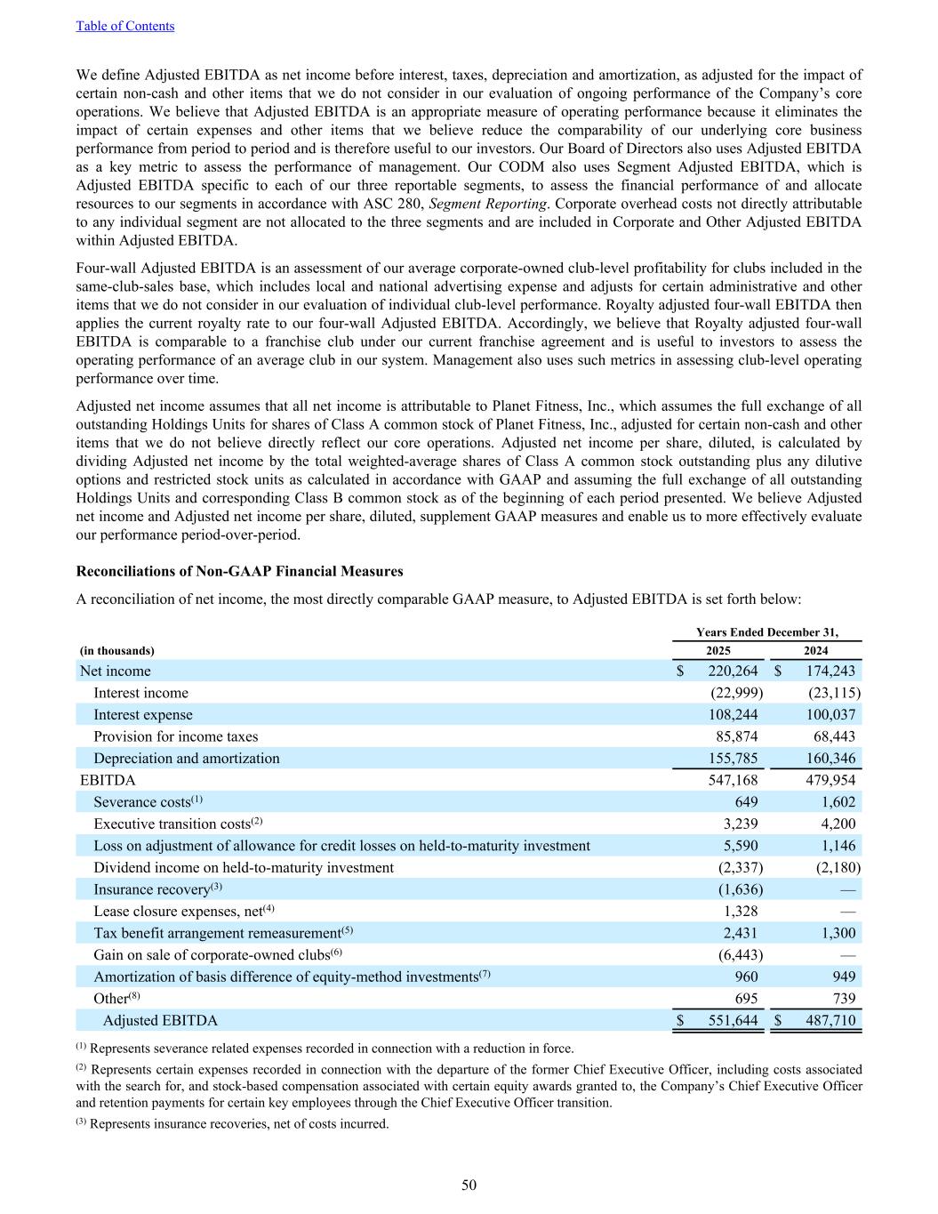 We define Adjusted EBITDA as net income before interest, taxes, depreciation and amortization, as adjusted for the impact of certain non-cash and other items that we do not consider in our evaluation of ongoing performance of the Company’s core operations. We believe that Adjusted EBITDA is an appropriate measure of operating performance because it eliminates the impact of certain expenses and other items that we believe reduce the comparability of our underlying core business performance from period to period and is therefore useful to our investors. Our Board of Directors also uses Adjusted EBITDA as a key metric to assess the performance of management. Our CODM also uses Segment Adjusted EBITDA, which is Adjusted EBITDA specific to each of our three reportable segments, to assess the financial performance of and allocate resources to our segments in accordance with ASC 280, Segment Reporting. Corporate overhead costs not directly attributable to any individual segment are not allocated to the three segments and are included in Corporate and Other Adjusted EBITDA within Adjusted EBITDA. Four-wall Adjusted EBITDA is an assessment of our average corporate-owned club-level profitability for clubs included in the same-club-sales base, which includes local and national advertising expense and adjusts for certain administrative and other items that we do not consider in our evaluation of individual club-level performance. Royalty adjusted four-wall EBITDA then applies the current royalty rate to our four-wall Adjusted EBITDA. Accordingly, we believe that Royalty adjusted four-wall EBITDA is comparable to a franchise club under our current franchise agreement and is useful to investors to assess the operating performance of an average club in our system. Management also uses such metrics in assessing club-level operating performance over time. Adjusted net income assumes that all net income is attributable to Planet Fitness, Inc., which assumes the full exchange of all outstanding Holdings Units for shares of Class A common stock of Planet Fitness, Inc., adjusted for certain non-cash and other items that we do not believe directly reflect our core operations. Adjusted net income per share, diluted, is calculated by dividing Adjusted net income by the total weighted-average shares of Class A common stock outstanding plus any dilutive options and restricted stock units as calculated in accordance with GAAP and assuming the full exchange of all outstanding Holdings Units and corresponding Class B common stock as of the beginning of each period presented. We believe Adjusted net income and Adjusted net income per share, diluted, supplement GAAP measures and enable us to more effectively evaluate our performance period-over-period. Reconciliations of Non-GAAP Financial Measures A reconciliation of net income, the most directly comparable GAAP measure, to Adjusted EBITDA is set forth below: Years Ended December 31, (in thousands) 2025 2024 Net income $ 220,264 $ 174,243 Interest income (22,999) (23,115) Interest expense 108,244 100,037 Provision for income taxes 85,874 68,443 Depreciation and amortization 155,785 160,346 EBITDA 547,168 479,954 Severance costs(1) 649 1,602 Executive transition costs(2) 3,239 4,200 Loss on adjustment of allowance for credit losses on held-to-maturity investment 5,590 1,146 Dividend income on held-to-maturity investment (2,337) (2,180) Insurance recovery(3) (1,636) — Lease closure expenses, net(4) 1,328 — Tax benefit arrangement remeasurement(5) 2,431 1,300 Gain on sale of corporate-owned clubs(6) (6,443) — Amortization of basis difference of equity-method investments(7) 960 949 Other(8) 695 739 Adjusted EBITDA $ 551,644 $ 487,710 (1) Represents severance related expenses recorded in connection with a reduction in force. (2) Represents certain expenses recorded in connection with the departure of the former Chief Executive Officer, including costs associated with the search for, and stock-based compensation associated with certain equity awards granted to, the Company’s Chief Executive Officer and retention payments for certain key employees through the Chief Executive Officer transition. (3) Represents insurance recoveries, net of costs incurred. Table of Contents 50