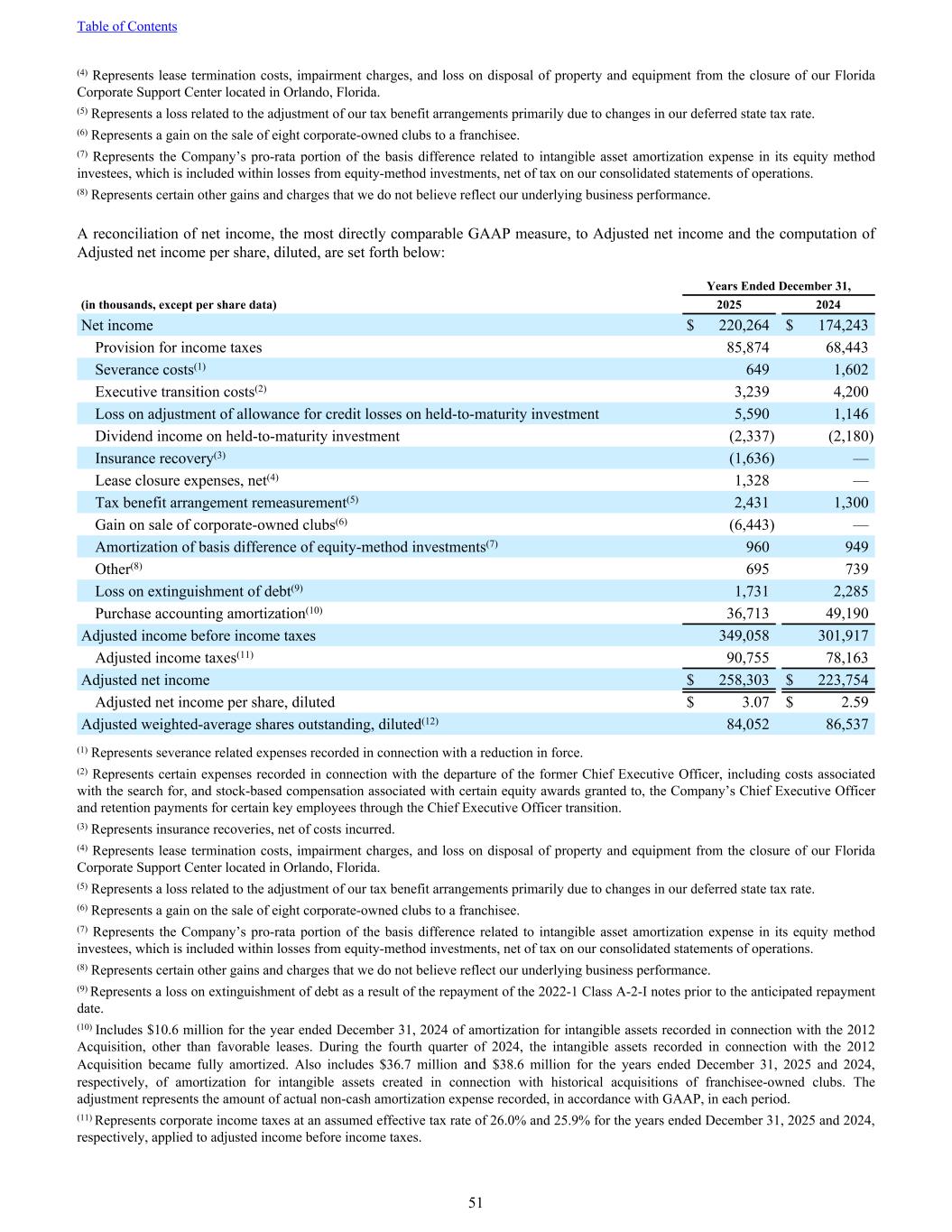 (4) Represents lease termination costs, impairment charges, and loss on disposal of property and equipment from the closure of our Florida Corporate Support Center located in Orlando, Florida. (5) Represents a loss related to the adjustment of our tax benefit arrangements primarily due to changes in our deferred state tax rate. (6) Represents a gain on the sale of eight corporate-owned clubs to a franchisee. (7) Represents the Company’s pro-rata portion of the basis difference related to intangible asset amortization expense in its equity method investees, which is included within losses from equity-method investments, net of tax on our consolidated statements of operations. (8) Represents certain other gains and charges that we do not believe reflect our underlying business performance. A reconciliation of net income, the most directly comparable GAAP measure, to Adjusted net income and the computation of Adjusted net income per share, diluted, are set forth below: Years Ended December 31, (in thousands, except per share data) 2025 2024 Net income $ 220,264 $ 174,243 Provision for income taxes 85,874 68,443 Severance costs(1) 649 1,602 Executive transition costs(2) 3,239 4,200 Loss on adjustment of allowance for credit losses on held-to-maturity investment 5,590 1,146 Dividend income on held-to-maturity investment (2,337) (2,180) Insurance recovery(3) (1,636) — Lease closure expenses, net(4) 1,328 — Tax benefit arrangement remeasurement(5) 2,431 1,300 Gain on sale of corporate-owned clubs(6) (6,443) — Amortization of basis difference of equity-method investments(7) 960 949 Other(8) 695 739 Loss on extinguishment of debt(9) 1,731 2,285 Purchase accounting amortization(10) 36,713 49,190 Adjusted income before income taxes 349,058 301,917 Adjusted income taxes(11) 90,755 78,163 Adjusted net income $ 258,303 $ 223,754 Adjusted net income per share, diluted $ 3.07 $ 2.59 Adjusted weighted-average shares outstanding, diluted(12) 84,052 86,537 (1) Represents severance related expenses recorded in connection with a reduction in force. (2) Represents certain expenses recorded in connection with the departure of the former Chief Executive Officer, including costs associated with the search for, and stock-based compensation associated with certain equity awards granted to, the Company’s Chief Executive Officer and retention payments for certain key employees through the Chief Executive Officer transition. (3) Represents insurance recoveries, net of costs incurred. (4) Represents lease termination costs, impairment charges, and loss on disposal of property and equipment from the closure of our Florida Corporate Support Center located in Orlando, Florida. (5) Represents a loss related to the adjustment of our tax benefit arrangements primarily due to changes in our deferred state tax rate. (6) Represents a gain on the sale of eight corporate-owned clubs to a franchisee. (7) Represents the Company’s pro-rata portion of the basis difference related to intangible asset amortization expense in its equity method investees, which is included within losses from equity-method investments, net of tax on our consolidated statements of operations. (8) Represents certain other gains and charges that we do not believe reflect our underlying business performance. (9) Represents a loss on extinguishment of debt as a result of the repayment of the 2022-1 Class A-2-I notes prior to the anticipated repayment date. (10) Includes $10.6 million for the year ended December 31, 2024 of amortization for intangible assets recorded in connection with the 2012 Acquisition, other than favorable leases. During the fourth quarter of 2024, the intangible assets recorded in connection with the 2012 Acquisition became fully amortized. Also includes $36.7 million and $38.6 million for the years ended December 31, 2025 and 2024, respectively, of amortization for intangible assets created in connection with historical acquisitions of franchisee-owned clubs. The adjustment represents the amount of actual non-cash amortization expense recorded, in accordance with GAAP, in each period. (11) Represents corporate income taxes at an assumed effective tax rate of 26.0% and 25.9% for the years ended December 31, 2025 and 2024, respectively, applied to adjusted income before income taxes. Table of Contents 51