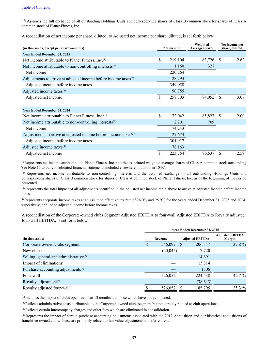 (12) Assumes the full exchange of all outstanding Holdings Units and corresponding shares of Class B common stock for shares of Class A common stock of Planet Fitness, Inc. A reconciliation of net income per share, diluted, to Adjusted net income per share, diluted, is set forth below: (in thousands, except per share amounts) Net income Weighted Average Shares Net income per share, diluted Year Ended December 31, 2025 Net income attributable to Planet Fitness, Inc.(1) $ 219,104 83,726 $ 2.62 Net income attributable to non-controlling interests(2) 1,160 327 Net income 220,264 Adjustments to arrive at adjusted income before income taxes(3) 128,794 Adjusted income before income taxes 349,058 Adjusted income taxes(4) 90,755 Adjusted net income $ 258,303 84,052 $ 3.07 Year Ended December 31, 2024 Net income attributable to Planet Fitness, Inc.(1) $ 172,042 85,827 $ 2.00 Net income attributable to non-controlling interests(2) 2,201 709 Net income 174,243 Adjustments to arrive at adjusted income before income taxes(3) 127,674 Adjusted income before income taxes 301,917 Adjusted income taxes(4) 78,163 Adjusted net income $ 223,754 86,537 $ 2.59 (1) Represents net income attributable to Planet Fitness, Inc. and the associated weighted average shares of Class A common stock outstanding (see Note 15 to our consolidated financial statements included elsewhere in this form 10-K). (2) Represents net income attributable to non-controlling interests and the assumed exchange of all outstanding Holdings Units and corresponding shares of Class B common stock for shares of Class A common stock of Planet Fitness, Inc. as of the beginning of the period presented. (3) Represents the total impact of all adjustments identified in the adjusted net income table above to arrive at adjusted income before income taxes. (4) Represents corporate income taxes at an assumed effective tax rate of 26.0% and 25.9% for the years ended December 31, 2025 and 2024, respectively, applied to adjusted income before income taxes. A reconciliation of the Corporate-owned clubs Segment Adjusted EBITDA to four-wall Adjusted EBITDA to Royalty adjusted four-wall EBITDA, is set forth below: Year Ended December 31, 2025 (in thousands) Revenue Adjusted EBITDA Adjusted EBITDA Margin Corporate-owned clubs segment $ 546,097 $ 206,347 37.8 % New clubs(1) (20,045) 7,720 Selling, general and administrative(2) — 14,691 Impact of eliminations(3) — (3,814) Purchase accounting adjustments(4) — (506) Four-wall 526,052 224,438 42.7 % Royalty adjustment(5) — (38,643) Royalty adjusted four-wall $ 526,052 $ 185,795 35.3 % (1) Includes the impact of clubs open less than 13 months and those which have not yet opened. (2) Reflects administrative costs attributable to the Corporate-owned clubs segment but not directly related to club operations. (3) Reflects certain intercompany charges and other fees which are eliminated in consolidation. (4) Represents the impact of certain purchase accounting adjustments associated with the 2012 Acquisition and our historical acquisitions of franchisee-owned clubs. These are primarily related to fair value adjustments to deferred rent. Table of Contents 52