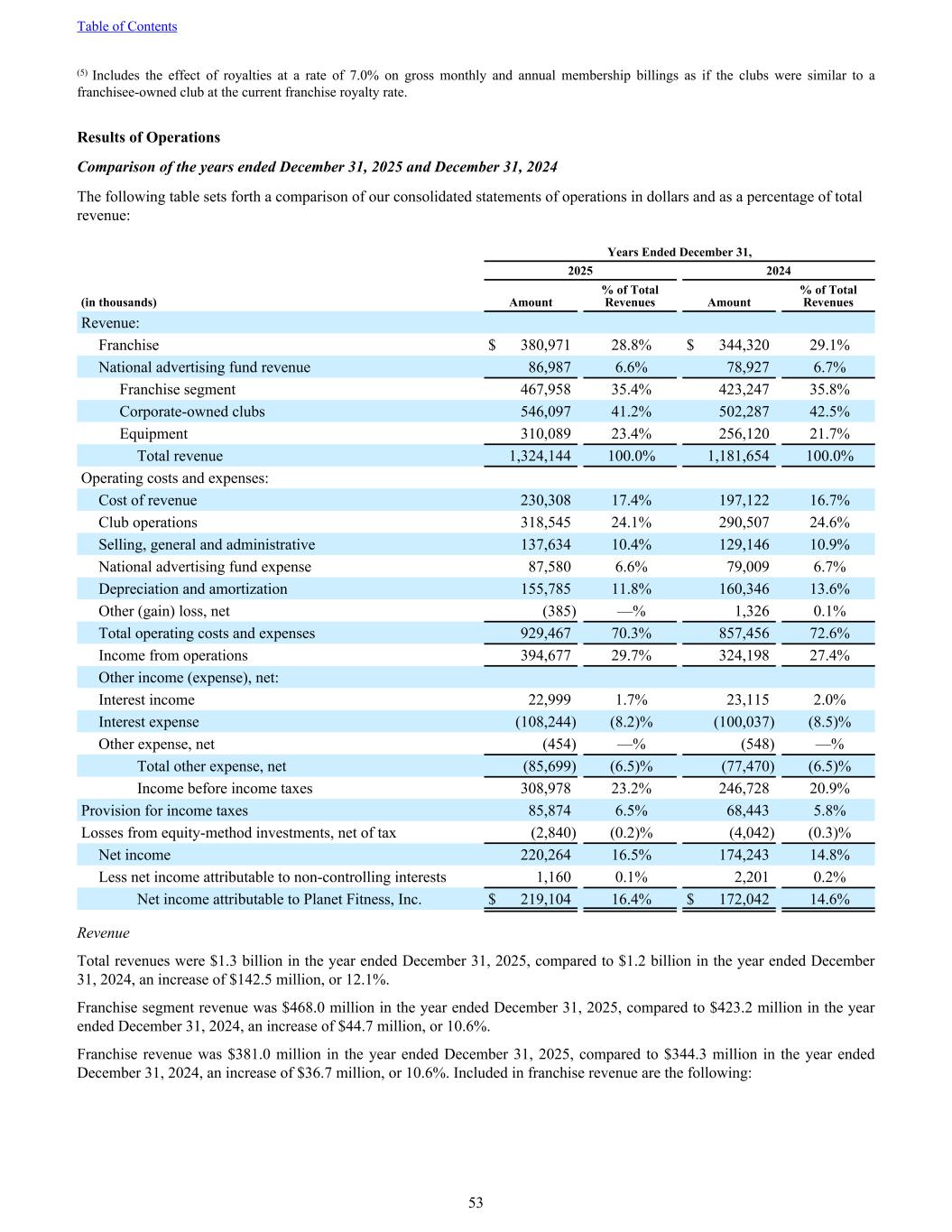 (5) Includes the effect of royalties at a rate of 7.0% on gross monthly and annual membership billings as if the clubs were similar to a franchisee-owned club at the current franchise royalty rate. Results of Operations Comparison of the years ended December 31, 2025 and December 31, 2024 The following table sets forth a comparison of our consolidated statements of operations in dollars and as a percentage of total revenue: Years Ended December 31, 2025 2024 (in thousands) Amount % of Total Revenues Amount % of Total Revenues Revenue: Franchise $ 380,971 28.8% $ 344,320 29.1% National advertising fund revenue 86,987 6.6% 78,927 6.7% Franchise segment 467,958 35.4% 423,247 35.8% Corporate-owned clubs 546,097 41.2% 502,287 42.5% Equipment 310,089 23.4% 256,120 21.7% Total revenue 1,324,144 100.0% 1,181,654 100.0% Operating costs and expenses: Cost of revenue 230,308 17.4% 197,122 16.7% Club operations 318,545 24.1% 290,507 24.6% Selling, general and administrative 137,634 10.4% 129,146 10.9% National advertising fund expense 87,580 6.6% 79,009 6.7% Depreciation and amortization 155,785 11.8% 160,346 13.6% Other (gain) loss, net (385) —% 1,326 0.1% Total operating costs and expenses 929,467 70.3% 857,456 72.6% Income from operations 394,677 29.7% 324,198 27.4% Other income (expense), net: Interest income 22,999 1.7% 23,115 2.0% Interest expense (108,244) (8.2)% (100,037) (8.5)% Other expense, net (454) —% (548) —% Total other expense, net (85,699) (6.5)% (77,470) (6.5)% Income before income taxes 308,978 23.2% 246,728 20.9% Provision for income taxes 85,874 6.5% 68,443 5.8% Losses from equity-method investments, net of tax (2,840) (0.2)% (4,042) (0.3)% Net income 220,264 16.5% 174,243 14.8% Less net income attributable to non-controlling interests 1,160 0.1% 2,201 0.2% Net income attributable to Planet Fitness, Inc. $ 219,104 16.4% $ 172,042 14.6% Revenue Total revenues were $1.3 billion in the year ended December 31, 2025, compared to $1.2 billion in the year ended December 31, 2024, an increase of $142.5 million, or 12.1%. Franchise segment revenue was $468.0 million in the year ended December 31, 2025, compared to $423.2 million in the year ended December 31, 2024, an increase of $44.7 million, or 10.6%. Franchise revenue was $381.0 million in the year ended December 31, 2025, compared to $344.3 million in the year ended December 31, 2024, an increase of $36.7 million, or 10.6%. Included in franchise revenue are the following: Table of Contents 53