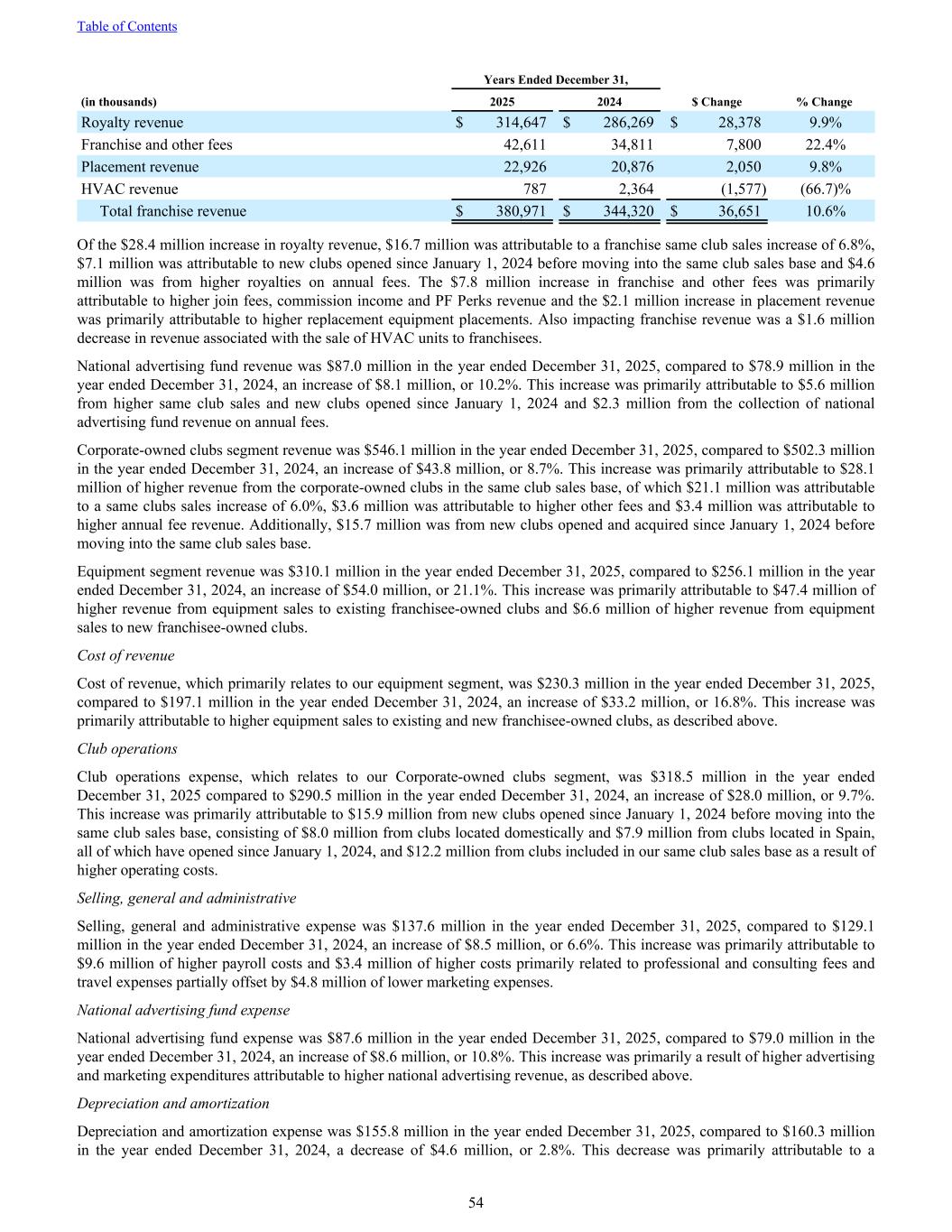 Years Ended December 31, (in thousands) 2025 2024 $ Change % Change Royalty revenue $ 314,647 $ 286,269 $ 28,378 9.9% Franchise and other fees 42,611 34,811 7,800 22.4% Placement revenue 22,926 20,876 2,050 9.8% HVAC revenue 787 2,364 (1,577) (66.7)% Total franchise revenue $ 380,971 $ 344,320 $ 36,651 10.6% Of the $28.4 million increase in royalty revenue, $16.7 million was attributable to a franchise same club sales increase of 6.8%, $7.1 million was attributable to new clubs opened since January 1, 2024 before moving into the same club sales base and $4.6 million was from higher royalties on annual fees. The $7.8 million increase in franchise and other fees was primarily attributable to higher join fees, commission income and PF Perks revenue and the $2.1 million increase in placement revenue was primarily attributable to higher replacement equipment placements. Also impacting franchise revenue was a $1.6 million decrease in revenue associated with the sale of HVAC units to franchisees. National advertising fund revenue was $87.0 million in the year ended December 31, 2025, compared to $78.9 million in the year ended December 31, 2024, an increase of $8.1 million, or 10.2%. This increase was primarily attributable to $5.6 million from higher same club sales and new clubs opened since January 1, 2024 and $2.3 million from the collection of national advertising fund revenue on annual fees. Corporate-owned clubs segment revenue was $546.1 million in the year ended December 31, 2025, compared to $502.3 million in the year ended December 31, 2024, an increase of $43.8 million, or 8.7%. This increase was primarily attributable to $28.1 million of higher revenue from the corporate-owned clubs in the same club sales base, of which $21.1 million was attributable to a same clubs sales increase of 6.0%, $3.6 million was attributable to higher other fees and $3.4 million was attributable to higher annual fee revenue. Additionally, $15.7 million was from new clubs opened and acquired since January 1, 2024 before moving into the same club sales base. Equipment segment revenue was $310.1 million in the year ended December 31, 2025, compared to $256.1 million in the year ended December 31, 2024, an increase of $54.0 million, or 21.1%. This increase was primarily attributable to $47.4 million of higher revenue from equipment sales to existing franchisee-owned clubs and $6.6 million of higher revenue from equipment sales to new franchisee-owned clubs. Cost of revenue Cost of revenue, which primarily relates to our equipment segment, was $230.3 million in the year ended December 31, 2025, compared to $197.1 million in the year ended December 31, 2024, an increase of $33.2 million, or 16.8%. This increase was primarily attributable to higher equipment sales to existing and new franchisee-owned clubs, as described above. Club operations Club operations expense, which relates to our Corporate-owned clubs segment, was $318.5 million in the year ended December 31, 2025 compared to $290.5 million in the year ended December 31, 2024, an increase of $28.0 million, or 9.7%. This increase was primarily attributable to $15.9 million from new clubs opened since January 1, 2024 before moving into the same club sales base, consisting of $8.0 million from clubs located domestically and $7.9 million from clubs located in Spain, all of which have opened since January 1, 2024, and $12.2 million from clubs included in our same club sales base as a result of higher operating costs. Selling, general and administrative Selling, general and administrative expense was $137.6 million in the year ended December 31, 2025, compared to $129.1 million in the year ended December 31, 2024, an increase of $8.5 million, or 6.6%. This increase was primarily attributable to $9.6 million of higher payroll costs and $3.4 million of higher costs primarily related to professional and consulting fees and travel expenses partially offset by $4.8 million of lower marketing expenses. National advertising fund expense National advertising fund expense was $87.6 million in the year ended December 31, 2025, compared to $79.0 million in the year ended December 31, 2024, an increase of $8.6 million, or 10.8%. This increase was primarily a result of higher advertising and marketing expenditures attributable to higher national advertising revenue, as described above. Depreciation and amortization Depreciation and amortization expense was $155.8 million in the year ended December 31, 2025, compared to $160.3 million in the year ended December 31, 2024, a decrease of $4.6 million, or 2.8%. This decrease was primarily attributable to a Table of Contents 54