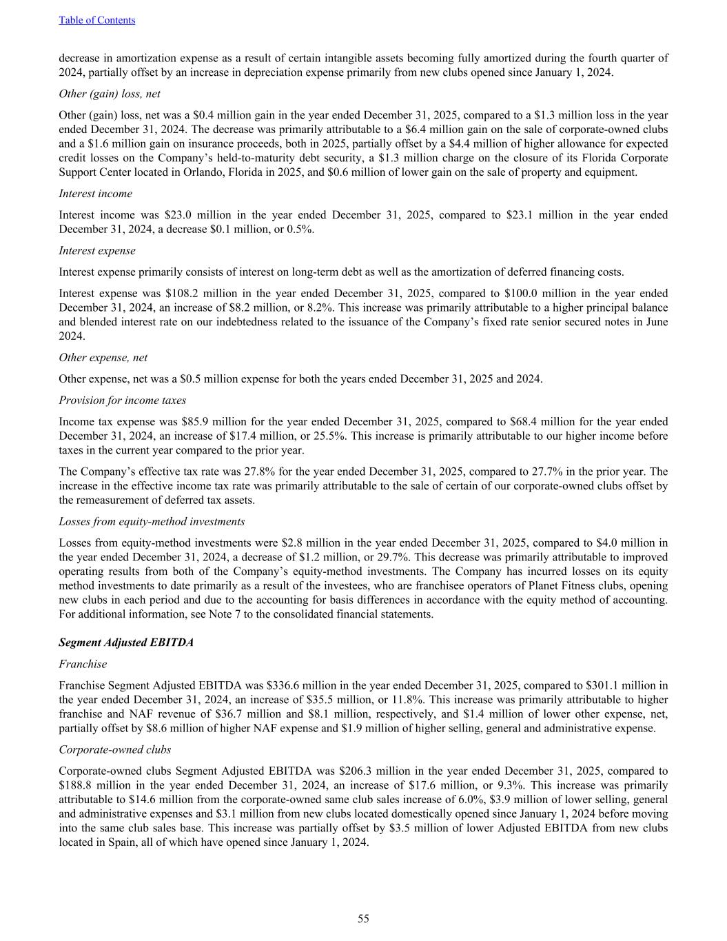 decrease in amortization expense as a result of certain intangible assets becoming fully amortized during the fourth quarter of 2024, partially offset by an increase in depreciation expense primarily from new clubs opened since January 1, 2024. Other (gain) loss, net Other (gain) loss, net was a $0.4 million gain in the year ended December 31, 2025, compared to a $1.3 million loss in the year ended December 31, 2024. The decrease was primarily attributable to a $6.4 million gain on the sale of corporate-owned clubs and a $1.6 million gain on insurance proceeds, both in 2025, partially offset by a $4.4 million of higher allowance for expected credit losses on the Company’s held-to-maturity debt security, a $1.3 million charge on the closure of its Florida Corporate Support Center located in Orlando, Florida in 2025, and $0.6 million of lower gain on the sale of property and equipment. Interest income Interest income was $23.0 million in the year ended December 31, 2025, compared to $23.1 million in the year ended December 31, 2024, a decrease $0.1 million, or 0.5%. Interest expense Interest expense primarily consists of interest on long-term debt as well as the amortization of deferred financing costs. Interest expense was $108.2 million in the year ended December 31, 2025, compared to $100.0 million in the year ended December 31, 2024, an increase of $8.2 million, or 8.2%. This increase was primarily attributable to a higher principal balance and blended interest rate on our indebtedness related to the issuance of the Company’s fixed rate senior secured notes in June 2024. Other expense, net Other expense, net was a $0.5 million expense for both the years ended December 31, 2025 and 2024. Provision for income taxes Income tax expense was $85.9 million for the year ended December 31, 2025, compared to $68.4 million for the year ended December 31, 2024, an increase of $17.4 million, or 25.5%. This increase is primarily attributable to our higher income before taxes in the current year compared to the prior year. The Company’s effective tax rate was 27.8% for the year ended December 31, 2025, compared to 27.7% in the prior year. The increase in the effective income tax rate was primarily attributable to the sale of certain of our corporate-owned clubs offset by the remeasurement of deferred tax assets. Losses from equity-method investments Losses from equity-method investments were $2.8 million in the year ended December 31, 2025, compared to $4.0 million in the year ended December 31, 2024, a decrease of $1.2 million, or 29.7%. This decrease was primarily attributable to improved operating results from both of the Company’s equity-method investments. The Company has incurred losses on its equity method investments to date primarily as a result of the investees, who are franchisee operators of Planet Fitness clubs, opening new clubs in each period and due to the accounting for basis differences in accordance with the equity method of accounting. For additional information, see Note 7 to the consolidated financial statements. Segment Adjusted EBITDA Franchise Franchise Segment Adjusted EBITDA was $336.6 million in the year ended December 31, 2025, compared to $301.1 million in the year ended December 31, 2024, an increase of $35.5 million, or 11.8%. This increase was primarily attributable to higher franchise and NAF revenue of $36.7 million and $8.1 million, respectively, and $1.4 million of lower other expense, net, partially offset by $8.6 million of higher NAF expense and $1.9 million of higher selling, general and administrative expense. Corporate-owned clubs Corporate-owned clubs Segment Adjusted EBITDA was $206.3 million in the year ended December 31, 2025, compared to $188.8 million in the year ended December 31, 2024, an increase of $17.6 million, or 9.3%. This increase was primarily attributable to $14.6 million from the corporate-owned same club sales increase of 6.0%, $3.9 million of lower selling, general and administrative expenses and $3.1 million from new clubs located domestically opened since January 1, 2024 before moving into the same club sales base. This increase was partially offset by $3.5 million of lower Adjusted EBITDA from new clubs located in Spain, all of which have opened since January 1, 2024. Table of Contents 55