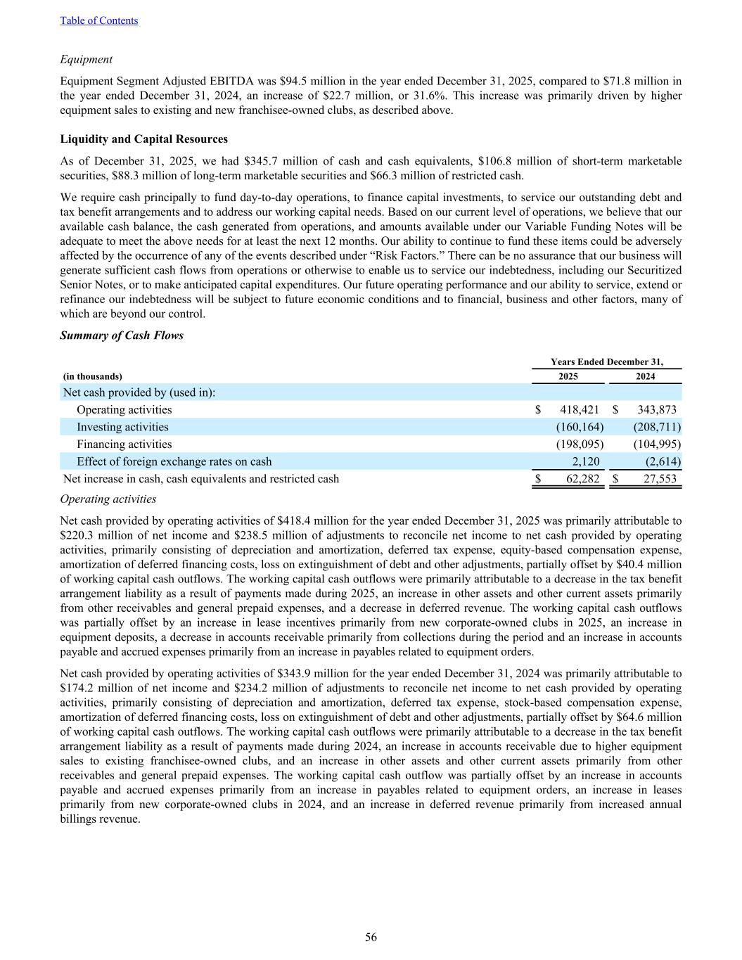 Equipment Equipment Segment Adjusted EBITDA was $94.5 million in the year ended December 31, 2025, compared to $71.8 million in the year ended December 31, 2024, an increase of $22.7 million, or 31.6%. This increase was primarily driven by higher equipment sales to existing and new franchisee-owned clubs, as described above. Liquidity and Capital Resources As of December 31, 2025, we had $345.7 million of cash and cash equivalents, $106.8 million of short-term marketable securities, $88.3 million of long-term marketable securities and $66.3 million of restricted cash. We require cash principally to fund day-to-day operations, to finance capital investments, to service our outstanding debt and tax benefit arrangements and to address our working capital needs. Based on our current level of operations, we believe that our available cash balance, the cash generated from operations, and amounts available under our Variable Funding Notes will be adequate to meet the above needs for at least the next 12 months. Our ability to continue to fund these items could be adversely affected by the occurrence of any of the events described under “Risk Factors.” There can be no assurance that our business will generate sufficient cash flows from operations or otherwise to enable us to service our indebtedness, including our Securitized Senior Notes, or to make anticipated capital expenditures. Our future operating performance and our ability to service, extend or refinance our indebtedness will be subject to future economic conditions and to financial, business and other factors, many of which are beyond our control. Summary of Cash Flows Years Ended December 31, (in thousands) 2025 2024 Net cash provided by (used in): Operating activities $ 418,421 $ 343,873 Investing activities (160,164) (208,711) Financing activities (198,095) (104,995) Effect of foreign exchange rates on cash 2,120 (2,614) Net increase in cash, cash equivalents and restricted cash $ 62,282 $ 27,553 Operating activities Net cash provided by operating activities of $418.4 million for the year ended December 31, 2025 was primarily attributable to $220.3 million of net income and $238.5 million of adjustments to reconcile net income to net cash provided by operating activities, primarily consisting of depreciation and amortization, deferred tax expense, equity-based compensation expense, amortization of deferred financing costs, loss on extinguishment of debt and other adjustments, partially offset by $40.4 million of working capital cash outflows. The working capital cash outflows were primarily attributable to a decrease in the tax benefit arrangement liability as a result of payments made during 2025, an increase in other assets and other current assets primarily from other receivables and general prepaid expenses, and a decrease in deferred revenue. The working capital cash outflows was partially offset by an increase in lease incentives primarily from new corporate-owned clubs in 2025, an increase in equipment deposits, a decrease in accounts receivable primarily from collections during the period and an increase in accounts payable and accrued expenses primarily from an increase in payables related to equipment orders. Net cash provided by operating activities of $343.9 million for the year ended December 31, 2024 was primarily attributable to $174.2 million of net income and $234.2 million of adjustments to reconcile net income to net cash provided by operating activities, primarily consisting of depreciation and amortization, deferred tax expense, stock-based compensation expense, amortization of deferred financing costs, loss on extinguishment of debt and other adjustments, partially offset by $64.6 million of working capital cash outflows. The working capital cash outflows were primarily attributable to a decrease in the tax benefit arrangement liability as a result of payments made during 2024, an increase in accounts receivable due to higher equipment sales to existing franchisee-owned clubs, and an increase in other assets and other current assets primarily from other receivables and general prepaid expenses. The working capital cash outflow was partially offset by an increase in accounts payable and accrued expenses primarily from an increase in payables related to equipment orders, an increase in leases primarily from new corporate-owned clubs in 2024, and an increase in deferred revenue primarily from increased annual billings revenue. Table of Contents 56