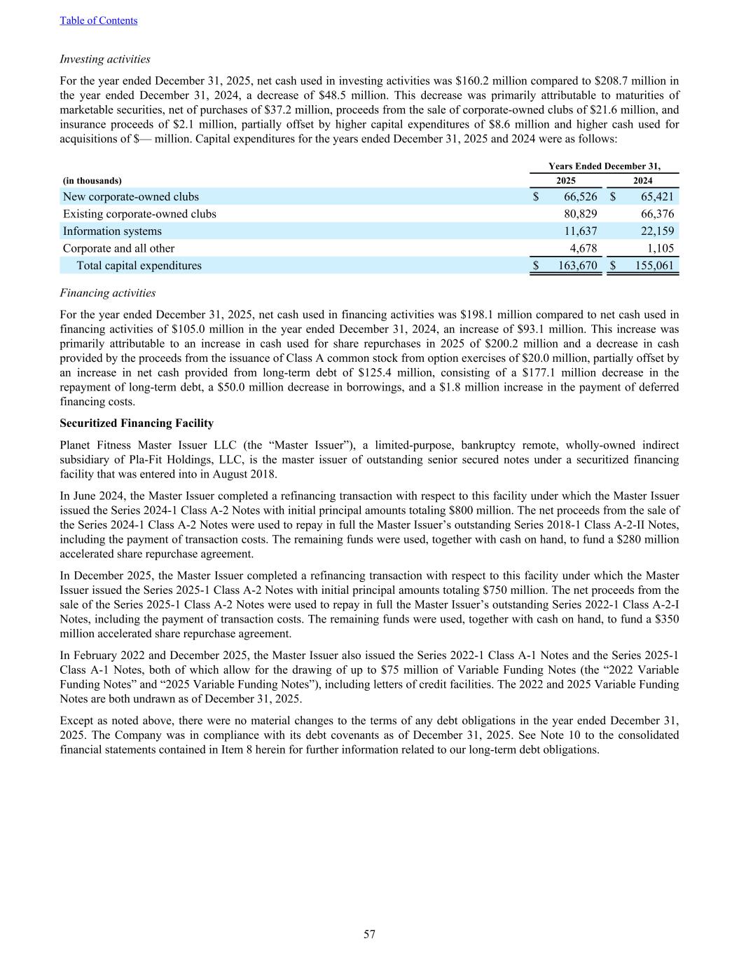 Investing activities For the year ended December 31, 2025, net cash used in investing activities was $160.2 million compared to $208.7 million in the year ended December 31, 2024, a decrease of $48.5 million. This decrease was primarily attributable to maturities of marketable securities, net of purchases of $37.2 million, proceeds from the sale of corporate-owned clubs of $21.6 million, and insurance proceeds of $2.1 million, partially offset by higher capital expenditures of $8.6 million and higher cash used for acquisitions of $— million. Capital expenditures for the years ended December 31, 2025 and 2024 were as follows: Years Ended December 31, (in thousands) 2025 2024 New corporate-owned clubs $ 66,526 $ 65,421 Existing corporate-owned clubs 80,829 66,376 Information systems 11,637 22,159 Corporate and all other 4,678 1,105 Total capital expenditures $ 163,670 $ 155,061 Financing activities For the year ended December 31, 2025, net cash used in financing activities was $198.1 million compared to net cash used in financing activities of $105.0 million in the year ended December 31, 2024, an increase of $93.1 million. This increase was primarily attributable to an increase in cash used for share repurchases in 2025 of $200.2 million and a decrease in cash provided by the proceeds from the issuance of Class A common stock from option exercises of $20.0 million, partially offset by an increase in net cash provided from long-term debt of $125.4 million, consisting of a $177.1 million decrease in the repayment of long-term debt, a $50.0 million decrease in borrowings, and a $1.8 million increase in the payment of deferred financing costs. Securitized Financing Facility Planet Fitness Master Issuer LLC (the “Master Issuer”), a limited-purpose, bankruptcy remote, wholly-owned indirect subsidiary of Pla-Fit Holdings, LLC, is the master issuer of outstanding senior secured notes under a securitized financing facility that was entered into in August 2018. In June 2024, the Master Issuer completed a refinancing transaction with respect to this facility under which the Master Issuer issued the Series 2024-1 Class A-2 Notes with initial principal amounts totaling $800 million. The net proceeds from the sale of the Series 2024-1 Class A-2 Notes were used to repay in full the Master Issuer’s outstanding Series 2018-1 Class A-2-II Notes, including the payment of transaction costs. The remaining funds were used, together with cash on hand, to fund a $280 million accelerated share repurchase agreement. In December 2025, the Master Issuer completed a refinancing transaction with respect to this facility under which the Master Issuer issued the Series 2025-1 Class A-2 Notes with initial principal amounts totaling $750 million. The net proceeds from the sale of the Series 2025-1 Class A-2 Notes were used to repay in full the Master Issuer’s outstanding Series 2022-1 Class A-2-I Notes, including the payment of transaction costs. The remaining funds were used, together with cash on hand, to fund a $350 million accelerated share repurchase agreement. In February 2022 and December 2025, the Master Issuer also issued the Series 2022-1 Class A-1 Notes and the Series 2025-1 Class A-1 Notes, both of which allow for the drawing of up to $75 million of Variable Funding Notes (the “2022 Variable Funding Notes” and “2025 Variable Funding Notes”), including letters of credit facilities. The 2022 and 2025 Variable Funding Notes are both undrawn as of December 31, 2025. Except as noted above, there were no material changes to the terms of any debt obligations in the year ended December 31, 2025. The Company was in compliance with its debt covenants as of December 31, 2025. See Note 10 to the consolidated financial statements contained in Item 8 herein for further information related to our long-term debt obligations. Table of Contents 57