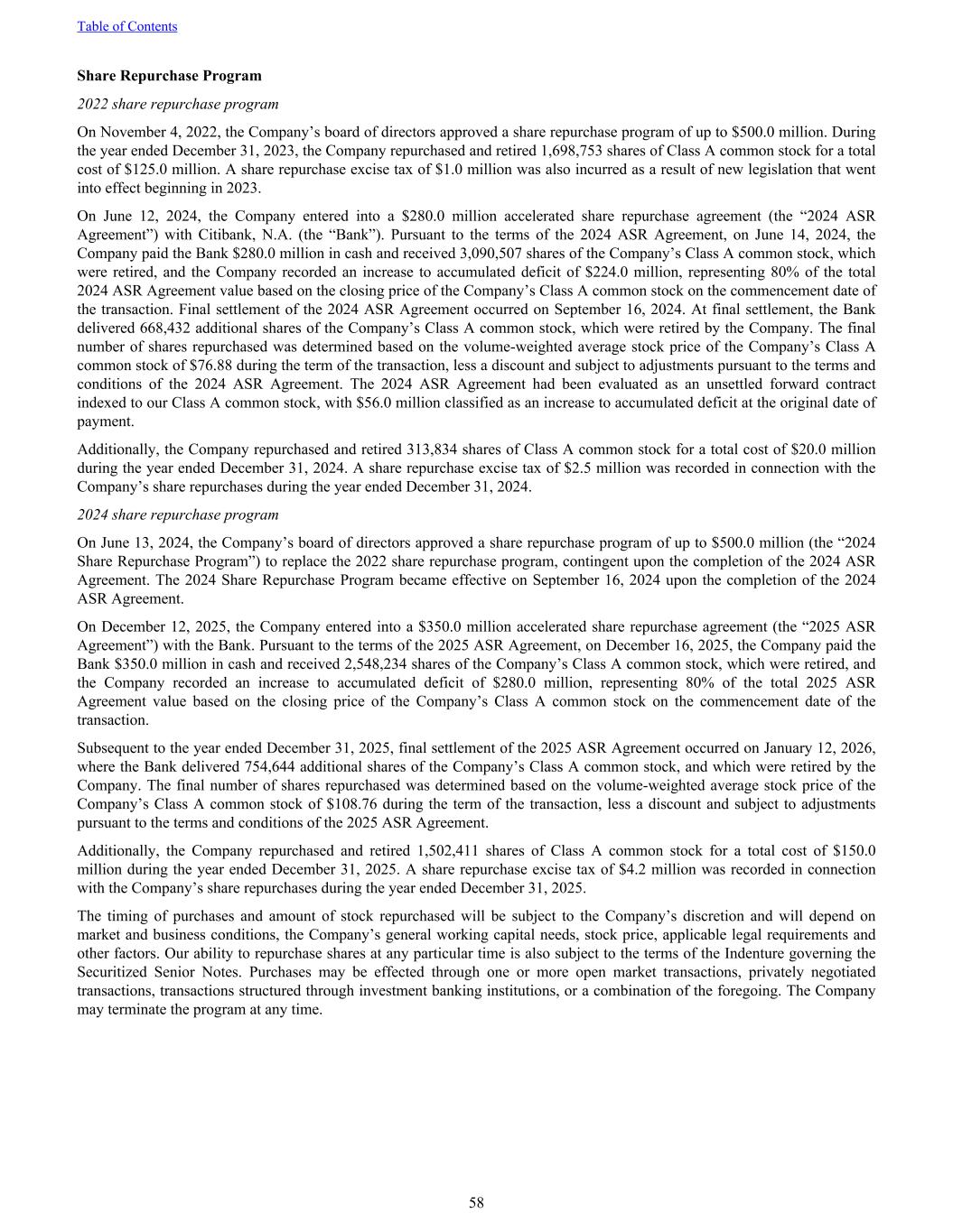 Share Repurchase Program 2022 share repurchase program On November 4, 2022, the Company’s board of directors approved a share repurchase program of up to $500.0 million. During the year ended December 31, 2023, the Company repurchased and retired 1,698,753 shares of Class A common stock for a total cost of $125.0 million. A share repurchase excise tax of $1.0 million was also incurred as a result of new legislation that went into effect beginning in 2023. On June 12, 2024, the Company entered into a $280.0 million accelerated share repurchase agreement (the “2024 ASR Agreement”) with Citibank, N.A. (the “Bank”). Pursuant to the terms of the 2024 ASR Agreement, on June 14, 2024, the Company paid the Bank $280.0 million in cash and received 3,090,507 shares of the Company’s Class A common stock, which were retired, and the Company recorded an increase to accumulated deficit of $224.0 million, representing 80% of the total 2024 ASR Agreement value based on the closing price of the Company’s Class A common stock on the commencement date of the transaction. Final settlement of the 2024 ASR Agreement occurred on September 16, 2024. At final settlement, the Bank delivered 668,432 additional shares of the Company’s Class A common stock, which were retired by the Company. The final number of shares repurchased was determined based on the volume-weighted average stock price of the Company’s Class A common stock of $76.88 during the term of the transaction, less a discount and subject to adjustments pursuant to the terms and conditions of the 2024 ASR Agreement. The 2024 ASR Agreement had been evaluated as an unsettled forward contract indexed to our Class A common stock, with $56.0 million classified as an increase to accumulated deficit at the original date of payment. Additionally, the Company repurchased and retired 313,834 shares of Class A common stock for a total cost of $20.0 million during the year ended December 31, 2024. A share repurchase excise tax of $2.5 million was recorded in connection with the Company’s share repurchases during the year ended December 31, 2024. 2024 share repurchase program On June 13, 2024, the Company’s board of directors approved a share repurchase program of up to $500.0 million (the “2024 Share Repurchase Program”) to replace the 2022 share repurchase program, contingent upon the completion of the 2024 ASR Agreement. The 2024 Share Repurchase Program became effective on September 16, 2024 upon the completion of the 2024 ASR Agreement. On December 12, 2025, the Company entered into a $350.0 million accelerated share repurchase agreement (the “2025 ASR Agreement”) with the Bank. Pursuant to the terms of the 2025 ASR Agreement, on December 16, 2025, the Company paid the Bank $350.0 million in cash and received 2,548,234 shares of the Company’s Class A common stock, which were retired, and the Company recorded an increase to accumulated deficit of $280.0 million, representing 80% of the total 2025 ASR Agreement value based on the closing price of the Company’s Class A common stock on the commencement date of the transaction. Subsequent to the year ended December 31, 2025, final settlement of the 2025 ASR Agreement occurred on January 12, 2026, where the Bank delivered 754,644 additional shares of the Company’s Class A common stock, and which were retired by the Company. The final number of shares repurchased was determined based on the volume-weighted average stock price of the Company’s Class A common stock of $108.76 during the term of the transaction, less a discount and subject to adjustments pursuant to the terms and conditions of the 2025 ASR Agreement. Additionally, the Company repurchased and retired 1,502,411 shares of Class A common stock for a total cost of $150.0 million during the year ended December 31, 2025. A share repurchase excise tax of $4.2 million was recorded in connection with the Company’s share repurchases during the year ended December 31, 2025. The timing of purchases and amount of stock repurchased will be subject to the Company’s discretion and will depend on market and business conditions, the Company’s general working capital needs, stock price, applicable legal requirements and other factors. Our ability to repurchase shares at any particular time is also subject to the terms of the Indenture governing the Securitized Senior Notes. Purchases may be effected through one or more open market transactions, privately negotiated transactions, transactions structured through investment banking institutions, or a combination of the foregoing. The Company may terminate the program at any time. Table of Contents 58