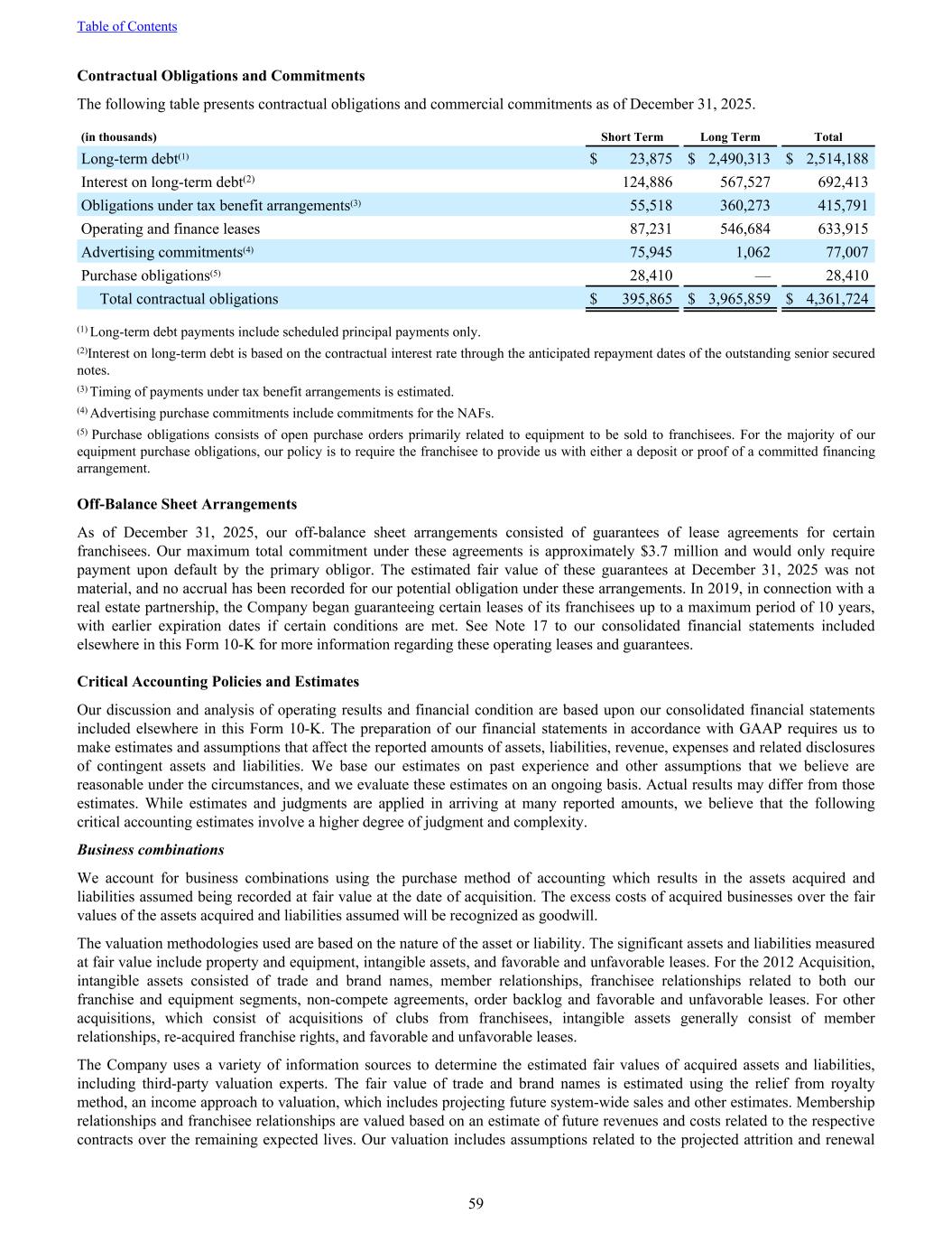 Contractual Obligations and Commitments The following table presents contractual obligations and commercial commitments as of December 31, 2025. (in thousands) Short Term Long Term Total Long-term debt(1) $ 23,875 $ 2,490,313 $ 2,514,188 Interest on long-term debt(2) 124,886 567,527 692,413 Obligations under tax benefit arrangements(3) 55,518 360,273 415,791 Operating and finance leases 87,231 546,684 633,915 Advertising commitments(4) 75,945 1,062 77,007 Purchase obligations(5) 28,410 — 28,410 Total contractual obligations $ 395,865 $ 3,965,859 $ 4,361,724 (1) Long-term debt payments include scheduled principal payments only. (2)Interest on long-term debt is based on the contractual interest rate through the anticipated repayment dates of the outstanding senior secured notes. (3) Timing of payments under tax benefit arrangements is estimated. (4) Advertising purchase commitments include commitments for the NAFs. (5) Purchase obligations consists of open purchase orders primarily related to equipment to be sold to franchisees. For the majority of our equipment purchase obligations, our policy is to require the franchisee to provide us with either a deposit or proof of a committed financing arrangement. Off-Balance Sheet Arrangements As of December 31, 2025, our off-balance sheet arrangements consisted of guarantees of lease agreements for certain franchisees. Our maximum total commitment under these agreements is approximately $3.7 million and would only require payment upon default by the primary obligor. The estimated fair value of these guarantees at December 31, 2025 was not material, and no accrual has been recorded for our potential obligation under these arrangements. In 2019, in connection with a real estate partnership, the Company began guaranteeing certain leases of its franchisees up to a maximum period of 10 years, with earlier expiration dates if certain conditions are met. See Note 17 to our consolidated financial statements included elsewhere in this Form 10-K for more information regarding these operating leases and guarantees. Critical Accounting Policies and Estimates Our discussion and analysis of operating results and financial condition are based upon our consolidated financial statements included elsewhere in this Form 10-K. The preparation of our financial statements in accordance with GAAP requires us to make estimates and assumptions that affect the reported amounts of assets, liabilities, revenue, expenses and related disclosures of contingent assets and liabilities. We base our estimates on past experience and other assumptions that we believe are reasonable under the circumstances, and we evaluate these estimates on an ongoing basis. Actual results may differ from those estimates. While estimates and judgments are applied in arriving at many reported amounts, we believe that the following critical accounting estimates involve a higher degree of judgment and complexity. Business combinations We account for business combinations using the purchase method of accounting which results in the assets acquired and liabilities assumed being recorded at fair value at the date of acquisition. The excess costs of acquired businesses over the fair values of the assets acquired and liabilities assumed will be recognized as goodwill. The valuation methodologies used are based on the nature of the asset or liability. The significant assets and liabilities measured at fair value include property and equipment, intangible assets, and favorable and unfavorable leases. For the 2012 Acquisition, intangible assets consisted of trade and brand names, member relationships, franchisee relationships related to both our franchise and equipment segments, non-compete agreements, order backlog and favorable and unfavorable leases. For other acquisitions, which consist of acquisitions of clubs from franchisees, intangible assets generally consist of member relationships, re-acquired franchise rights, and favorable and unfavorable leases. The Company uses a variety of information sources to determine the estimated fair values of acquired assets and liabilities, including third-party valuation experts. The fair value of trade and brand names is estimated using the relief from royalty method, an income approach to valuation, which includes projecting future system-wide sales and other estimates. Membership relationships and franchisee relationships are valued based on an estimate of future revenues and costs related to the respective contracts over the remaining expected lives. Our valuation includes assumptions related to the projected attrition and renewal Table of Contents 59