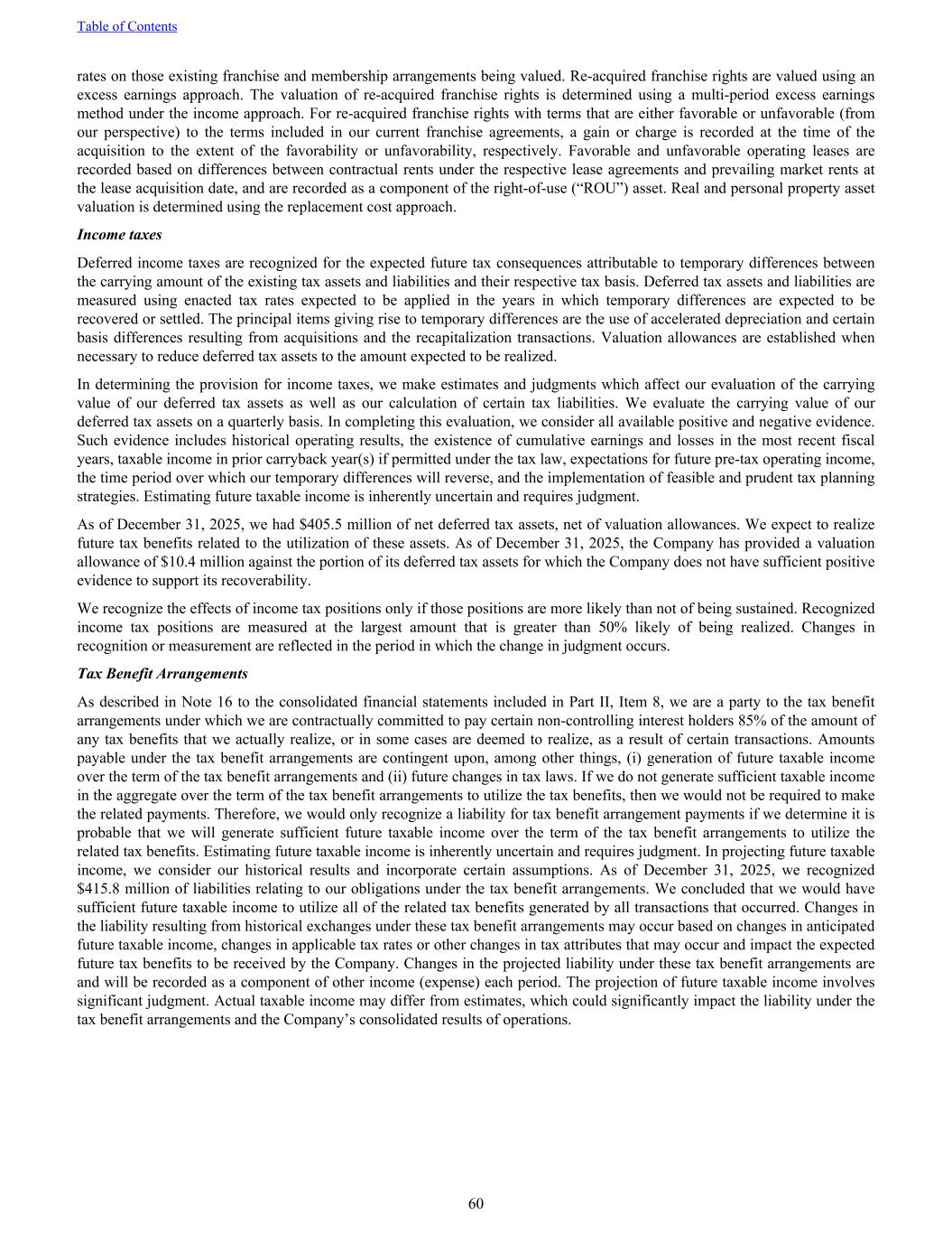 rates on those existing franchise and membership arrangements being valued. Re-acquired franchise rights are valued using an excess earnings approach. The valuation of re-acquired franchise rights is determined using a multi-period excess earnings method under the income approach. For re-acquired franchise rights with terms that are either favorable or unfavorable (from our perspective) to the terms included in our current franchise agreements, a gain or charge is recorded at the time of the acquisition to the extent of the favorability or unfavorability, respectively. Favorable and unfavorable operating leases are recorded based on differences between contractual rents under the respective lease agreements and prevailing market rents at the lease acquisition date, and are recorded as a component of the right-of-use (“ROU”) asset. Real and personal property asset valuation is determined using the replacement cost approach. Income taxes Deferred income taxes are recognized for the expected future tax consequences attributable to temporary differences between the carrying amount of the existing tax assets and liabilities and their respective tax basis. Deferred tax assets and liabilities are measured using enacted tax rates expected to be applied in the years in which temporary differences are expected to be recovered or settled. The principal items giving rise to temporary differences are the use of accelerated depreciation and certain basis differences resulting from acquisitions and the recapitalization transactions. Valuation allowances are established when necessary to reduce deferred tax assets to the amount expected to be realized. In determining the provision for income taxes, we make estimates and judgments which affect our evaluation of the carrying value of our deferred tax assets as well as our calculation of certain tax liabilities. We evaluate the carrying value of our deferred tax assets on a quarterly basis. In completing this evaluation, we consider all available positive and negative evidence. Such evidence includes historical operating results, the existence of cumulative earnings and losses in the most recent fiscal years, taxable income in prior carryback year(s) if permitted under the tax law, expectations for future pre-tax operating income, the time period over which our temporary differences will reverse, and the implementation of feasible and prudent tax planning strategies. Estimating future taxable income is inherently uncertain and requires judgment. As of December 31, 2025, we had $405.5 million of net deferred tax assets, net of valuation allowances. We expect to realize future tax benefits related to the utilization of these assets. As of December 31, 2025, the Company has provided a valuation allowance of $10.4 million against the portion of its deferred tax assets for which the Company does not have sufficient positive evidence to support its recoverability. We recognize the effects of income tax positions only if those positions are more likely than not of being sustained. Recognized income tax positions are measured at the largest amount that is greater than 50% likely of being realized. Changes in recognition or measurement are reflected in the period in which the change in judgment occurs. Tax Benefit Arrangements As described in Note 16 to the consolidated financial statements included in Part II, Item 8, we are a party to the tax benefit arrangements under which we are contractually committed to pay certain non-controlling interest holders 85% of the amount of any tax benefits that we actually realize, or in some cases are deemed to realize, as a result of certain transactions. Amounts payable under the tax benefit arrangements are contingent upon, among other things, (i) generation of future taxable income over the term of the tax benefit arrangements and (ii) future changes in tax laws. If we do not generate sufficient taxable income in the aggregate over the term of the tax benefit arrangements to utilize the tax benefits, then we would not be required to make the related payments. Therefore, we would only recognize a liability for tax benefit arrangement payments if we determine it is probable that we will generate sufficient future taxable income over the term of the tax benefit arrangements to utilize the related tax benefits. Estimating future taxable income is inherently uncertain and requires judgment. In projecting future taxable income, we consider our historical results and incorporate certain assumptions. As of December 31, 2025, we recognized $415.8 million of liabilities relating to our obligations under the tax benefit arrangements. We concluded that we would have sufficient future taxable income to utilize all of the related tax benefits generated by all transactions that occurred. Changes in the liability resulting from historical exchanges under these tax benefit arrangements may occur based on changes in anticipated future taxable income, changes in applicable tax rates or other changes in tax attributes that may occur and impact the expected future tax benefits to be received by the Company. Changes in the projected liability under these tax benefit arrangements are and will be recorded as a component of other income (expense) each period. The projection of future taxable income involves significant judgment. Actual taxable income may differ from estimates, which could significantly impact the liability under the tax benefit arrangements and the Company’s consolidated results of operations. Table of Contents 60