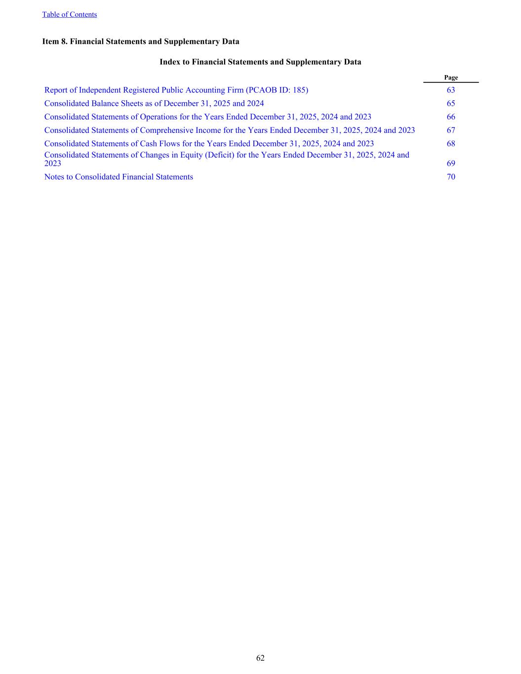 Item 8. Financial Statements and Supplementary Data Index to Financial Statements and Supplementary Data Page Report of Independent Registered Public Accounting Firm (PCAOB ID: 185) 63 Consolidated Balance Sheets as of December 31, 2025 and 2024 65 Consolidated Statements of Operations for the Years Ended December 31, 2025, 2024 and 2023 66 Consolidated Statements of Comprehensive Income for the Years Ended December 31, 2025, 2024 and 2023 67 Consolidated Statements of Cash Flows for the Years Ended December 31, 2025, 2024 and 2023 68 Consolidated Statements of Changes in Equity (Deficit) for the Years Ended December 31, 2025, 2024 and 2023 69 Notes to Consolidated Financial Statements 70 Table of Contents 62