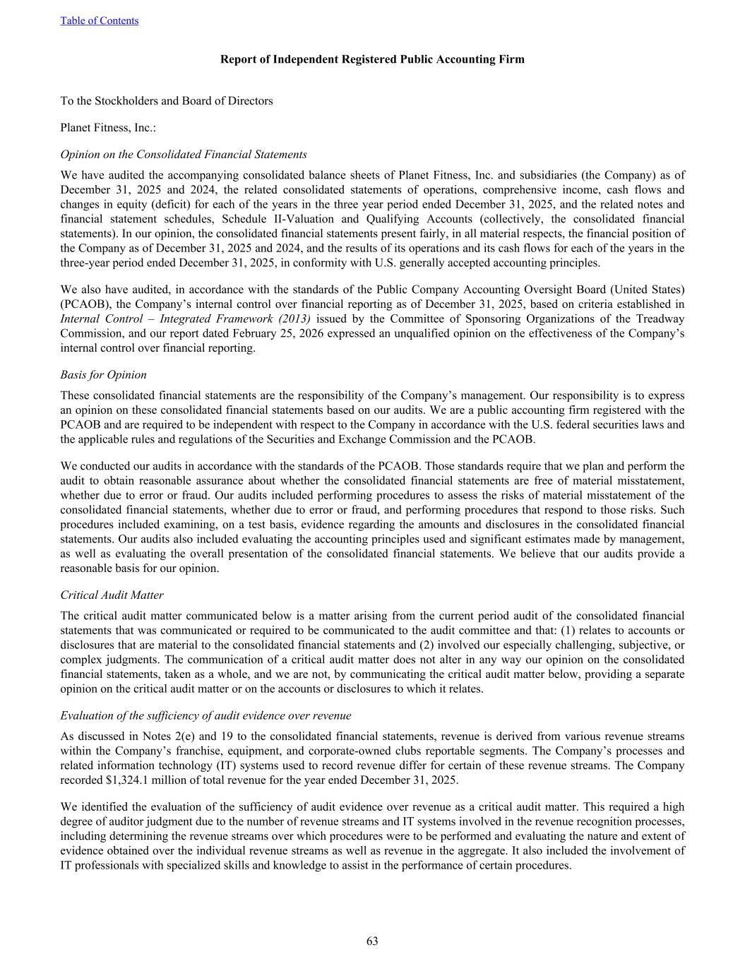 Report of Independent Registered Public Accounting Firm To the Stockholders and Board of Directors Planet Fitness, Inc.: Opinion on the Consolidated Financial Statements We have audited the accompanying consolidated balance sheets of Planet Fitness, Inc. and subsidiaries (the Company) as of December 31, 2025 and 2024, the related consolidated statements of operations, comprehensive income, cash flows and changes in equity (deficit) for each of the years in the three year period ended December 31, 2025, and the related notes and financial statement schedules, Schedule II-Valuation and Qualifying Accounts (collectively, the consolidated financial statements). In our opinion, the consolidated financial statements present fairly, in all material respects, the financial position of the Company as of December 31, 2025 and 2024, and the results of its operations and its cash flows for each of the years in the three-year period ended December 31, 2025, in conformity with U.S. generally accepted accounting principles. We also have audited, in accordance with the standards of the Public Company Accounting Oversight Board (United States) (PCAOB), the Company’s internal control over financial reporting as of December 31, 2025, based on criteria established in Internal Control – Integrated Framework (2013) issued by the Committee of Sponsoring Organizations of the Treadway Commission, and our report dated February 25, 2026 expressed an unqualified opinion on the effectiveness of the Company’s internal control over financial reporting. Basis for Opinion These consolidated financial statements are the responsibility of the Company’s management. Our responsibility is to express an opinion on these consolidated financial statements based on our audits. We are a public accounting firm registered with the PCAOB and are required to be independent with respect to the Company in accordance with the U.S. federal securities laws and the applicable rules and regulations of the Securities and Exchange Commission and the PCAOB. We conducted our audits in accordance with the standards of the PCAOB. Those standards require that we plan and perform the audit to obtain reasonable assurance about whether the consolidated financial statements are free of material misstatement, whether due to error or fraud. Our audits included performing procedures to assess the risks of material misstatement of the consolidated financial statements, whether due to error or fraud, and performing procedures that respond to those risks. Such procedures included examining, on a test basis, evidence regarding the amounts and disclosures in the consolidated financial statements. Our audits also included evaluating the accounting principles used and significant estimates made by management, as well as evaluating the overall presentation of the consolidated financial statements. We believe that our audits provide a reasonable basis for our opinion. Critical Audit Matter The critical audit matter communicated below is a matter arising from the current period audit of the consolidated financial statements that was communicated or required to be communicated to the audit committee and that: (1) relates to accounts or disclosures that are material to the consolidated financial statements and (2) involved our especially challenging, subjective, or complex judgments. The communication of a critical audit matter does not alter in any way our opinion on the consolidated financial statements, taken as a whole, and we are not, by communicating the critical audit matter below, providing a separate opinion on the critical audit matter or on the accounts or disclosures to which it relates. Evaluation of the sufficiency of audit evidence over revenue As discussed in Notes 2(e) and 19 to the consolidated financial statements, revenue is derived from various revenue streams within the Company’s franchise, equipment, and corporate-owned clubs reportable segments. The Company’s processes and related information technology (IT) systems used to record revenue differ for certain of these revenue streams. The Company recorded $1,324.1 million of total revenue for the year ended December 31, 2025. We identified the evaluation of the sufficiency of audit evidence over revenue as a critical audit matter. This required a high degree of auditor judgment due to the number of revenue streams and IT systems involved in the revenue recognition processes, including determining the revenue streams over which procedures were to be performed and evaluating the nature and extent of evidence obtained over the individual revenue streams as well as revenue in the aggregate. It also included the involvement of IT professionals with specialized skills and knowledge to assist in the performance of certain procedures. Table of Contents 63