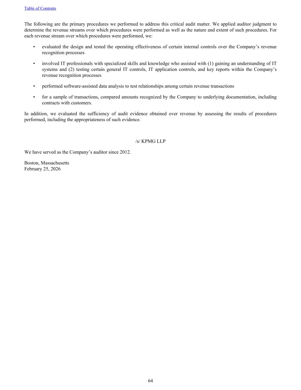 The following are the primary procedures we performed to address this critical audit matter. We applied auditor judgment to determine the revenue streams over which procedures were performed as well as the nature and extent of such procedures. For each revenue stream over which procedures were performed, we: • evaluated the design and tested the operating effectiveness of certain internal controls over the Company’s revenue recognition processes • involved IT professionals with specialized skills and knowledge who assisted with (1) gaining an understanding of IT systems and (2) testing certain general IT controls, IT application controls, and key reports within the Company’s revenue recognition processes • performed software-assisted data analysis to test relationships among certain revenue transactions • for a sample of transactions, compared amounts recognized by the Company to underlying documentation, including contracts with customers. In addition, we evaluated the sufficiency of audit evidence obtained over revenue by assessing the results of procedures performed, including the appropriateness of such evidence. /s/ KPMG LLP We have served as the Company’s auditor since 2012. Boston, Massachusetts February 25, 2026 Table of Contents 64